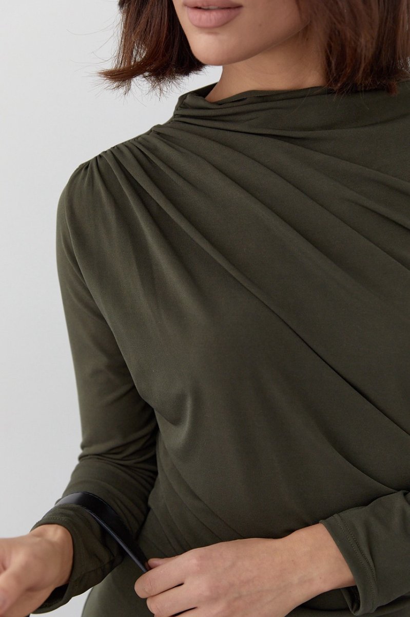 Модель выполнена из эластичной ткани - бифлекс. Мягкая драпировка присутствует на правом плечевом шве и с левой стороны полочки. Такие декоративные решение «смягчают» образ, делают эго нежным, изящным.