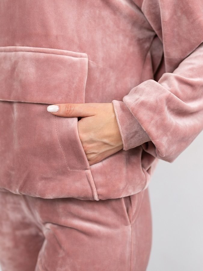 Свитшот свободного силуэта с манжетами на рукавах. В нижней части кулиса на завязках. Полочку дополняет карман-кенгуру с клапаном.