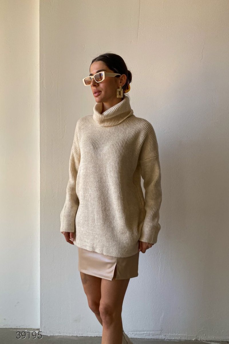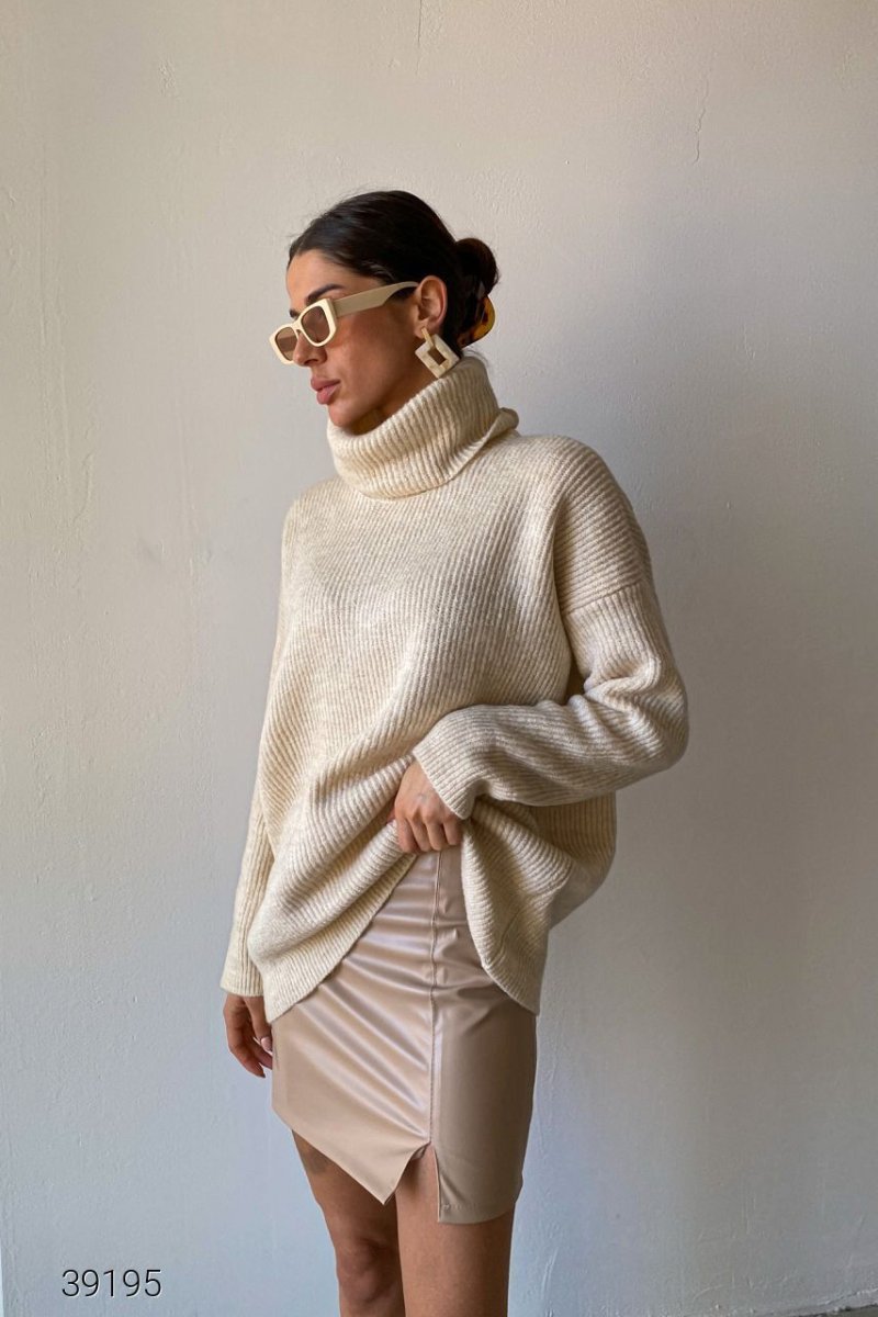 Свитер в стиле оверсайз из качественной вязки, производства Турции. Высокий ворот с отворотом, заниженная линия плеч. Размер универсальный, подходит на 42-48. Состав ткани: 70% – акрил, 20% – полиэстер, 10% – элит.