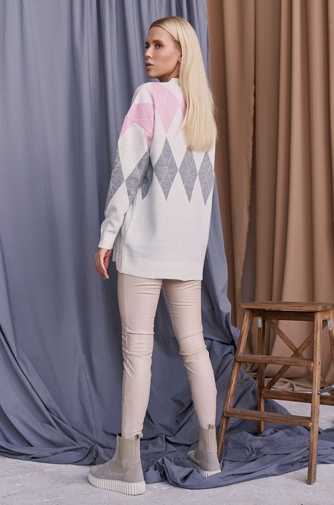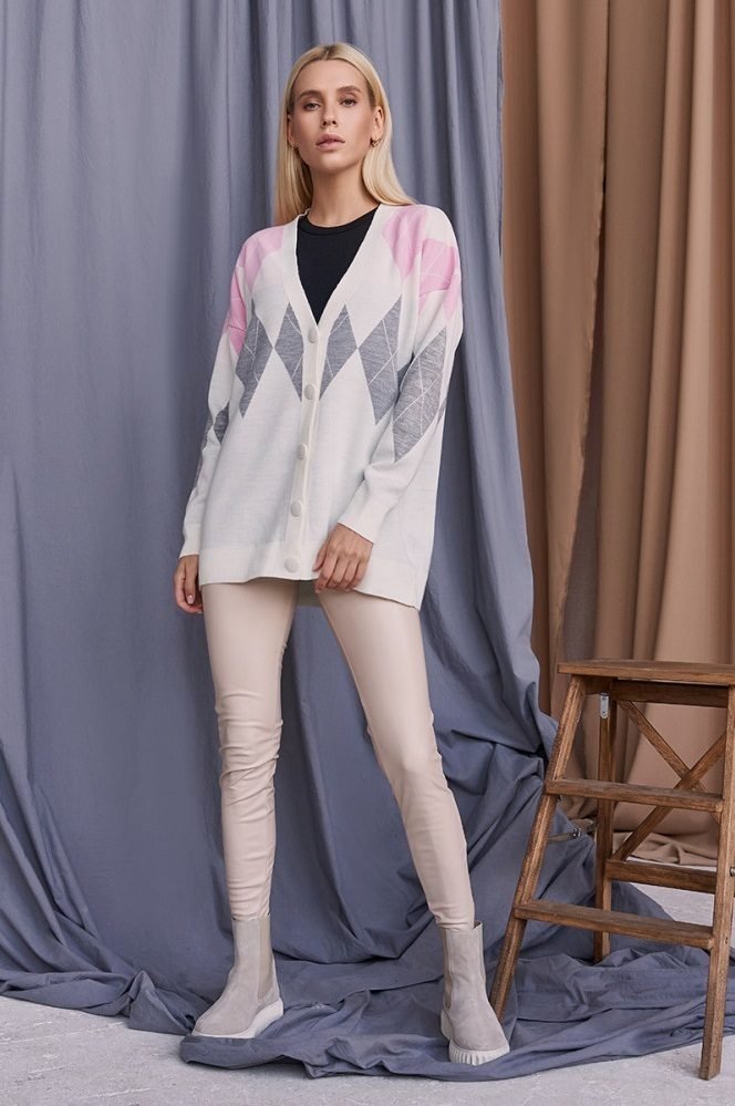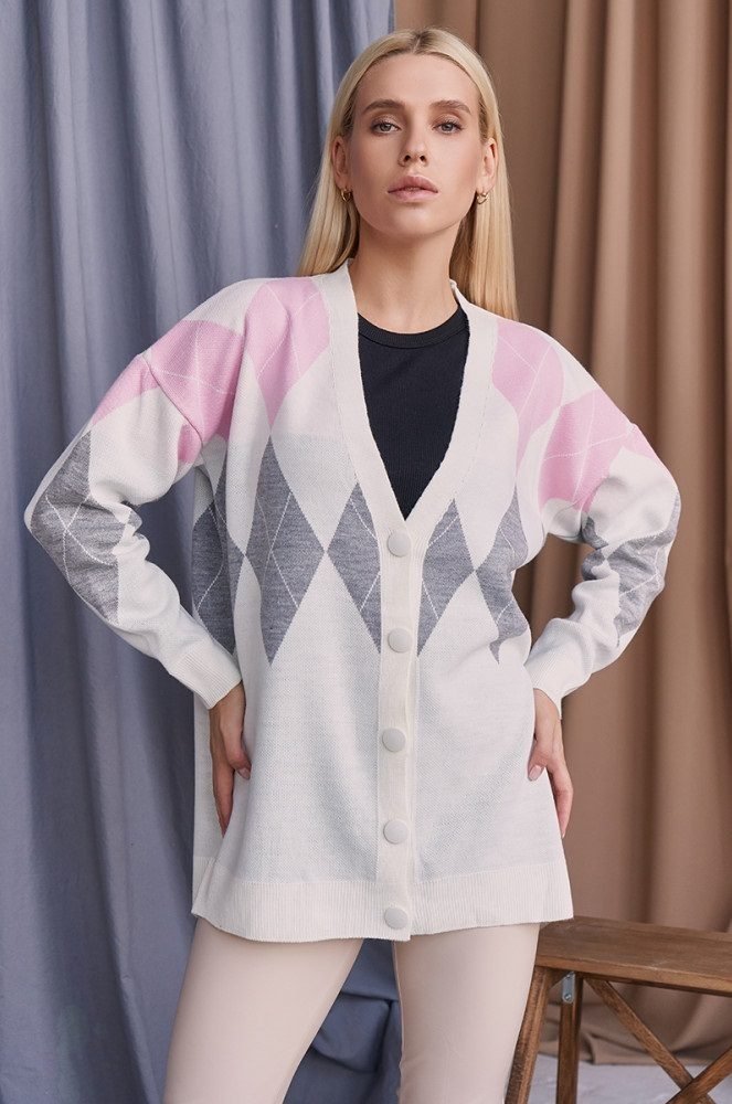 Удлиненный кардиган в узор "Ромб" со спущеной линией плечевого шва. Застегивается на пуговицы. Его можно носить в любой период года и комбинировать с разными вещами. Удобный и функциональный. Произведено в Турции.