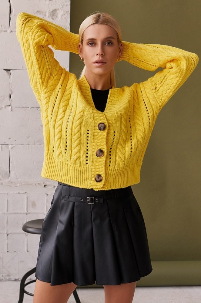 Вязаный теплый кардиган на основе шерсти узорной вязки. Застегивается на пуговицы. Его можно носить в любой период года и комбинировать с разными вещами. Удобный и функциональный. Произведено в Турции.