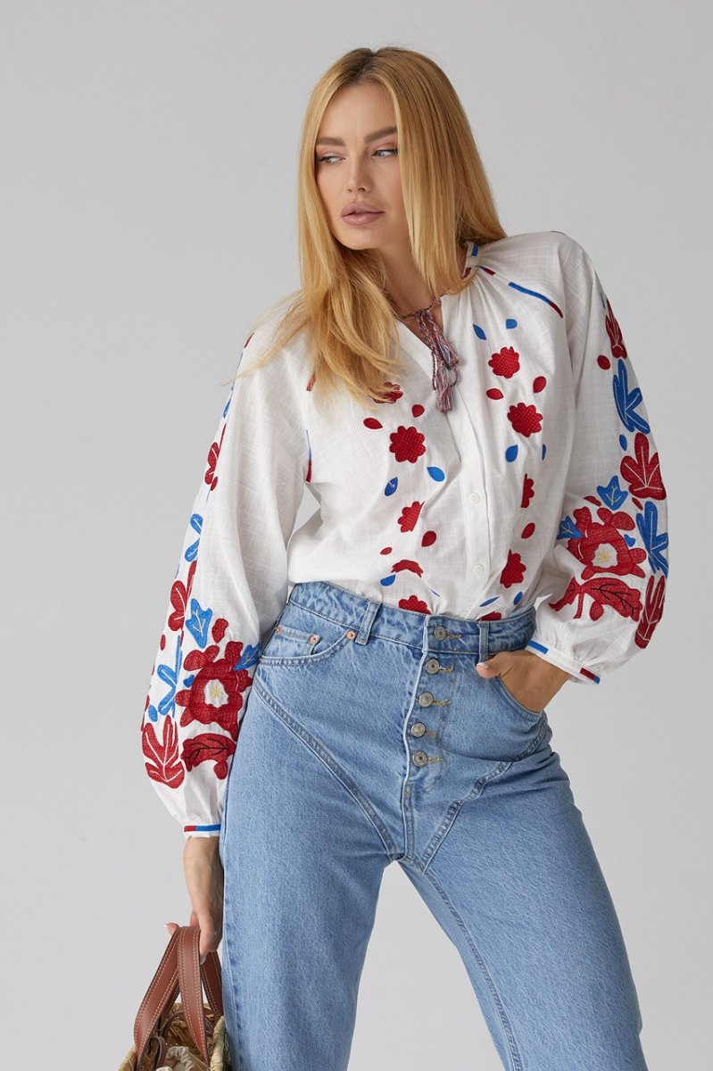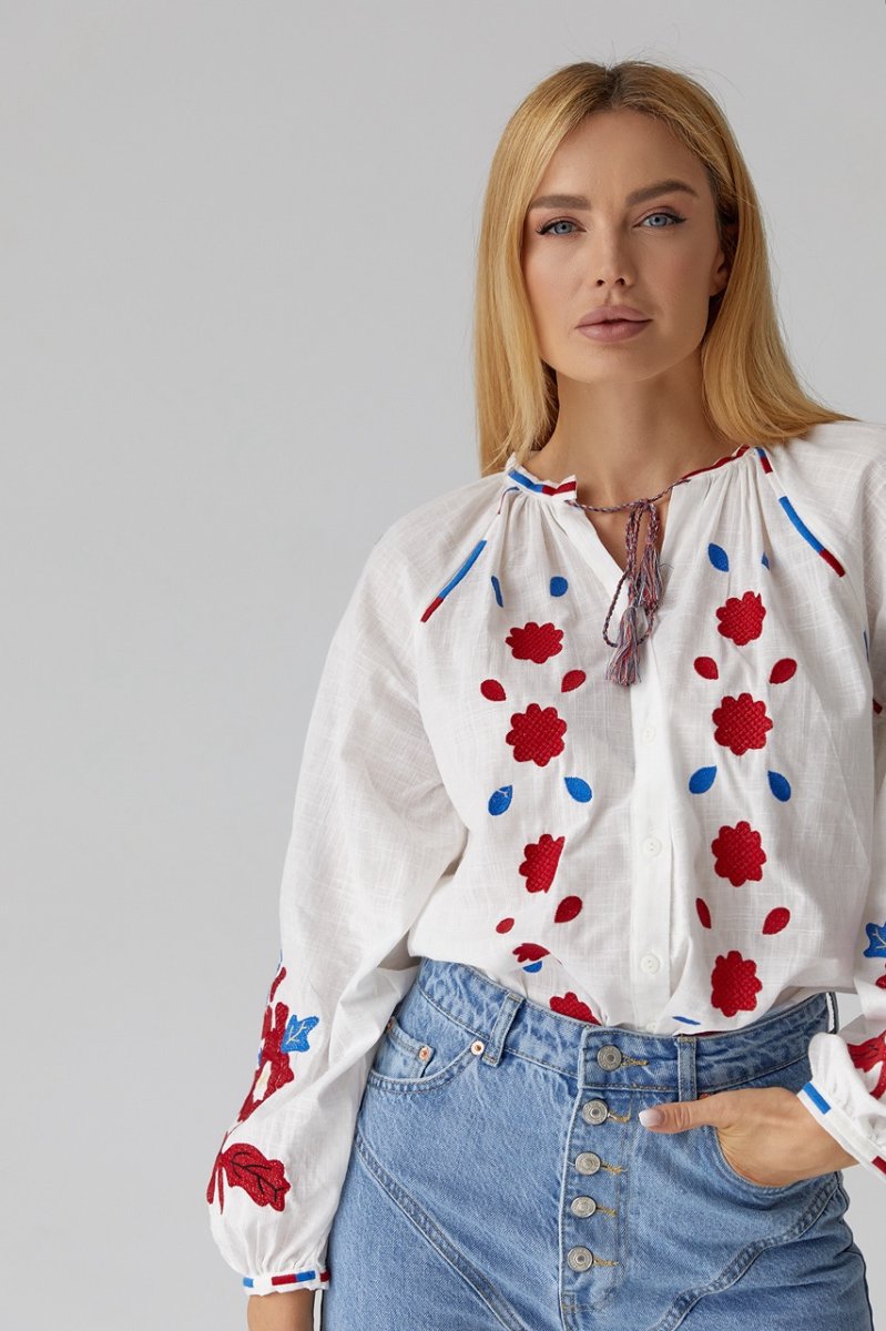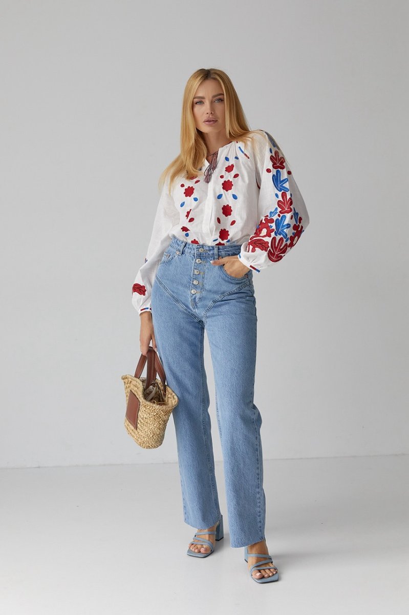 В модели низ прямой, а круглая горловина дополнена вышитой окантовкой. Длинные рукава-регланы внизу собраны в манжеты без застежки. Основная часть объемных рукавчиков и полочка спереди декорирована цветочными мотивами из машинной вышивки гладью. Спереди, возле пройм, так же присутствует вышивка, а по центру расположена вертикальная планка на пуговицах.