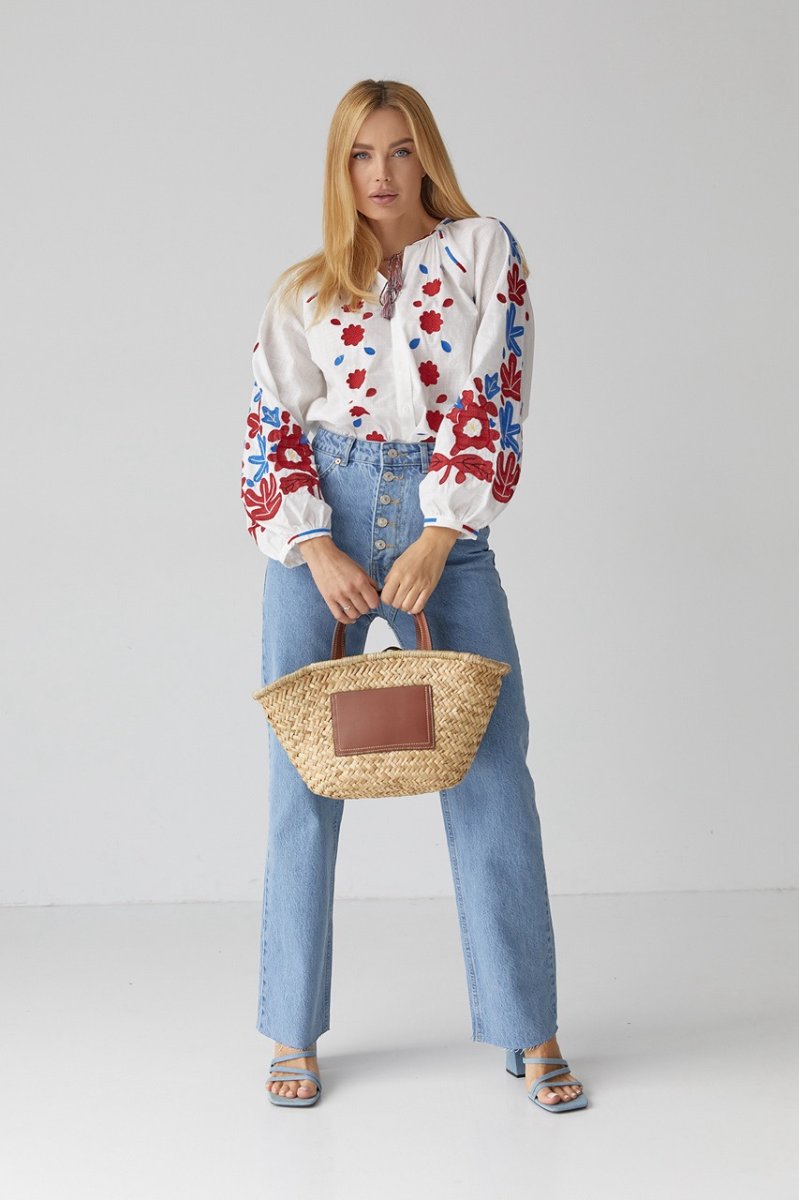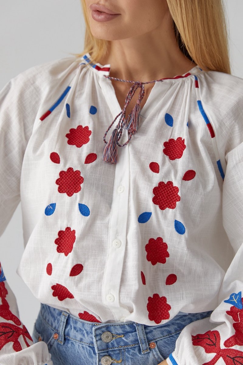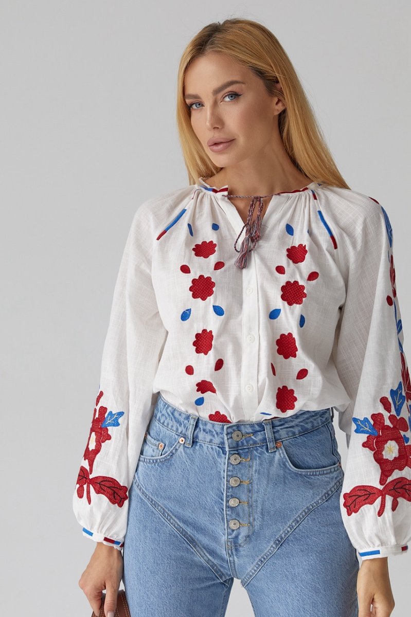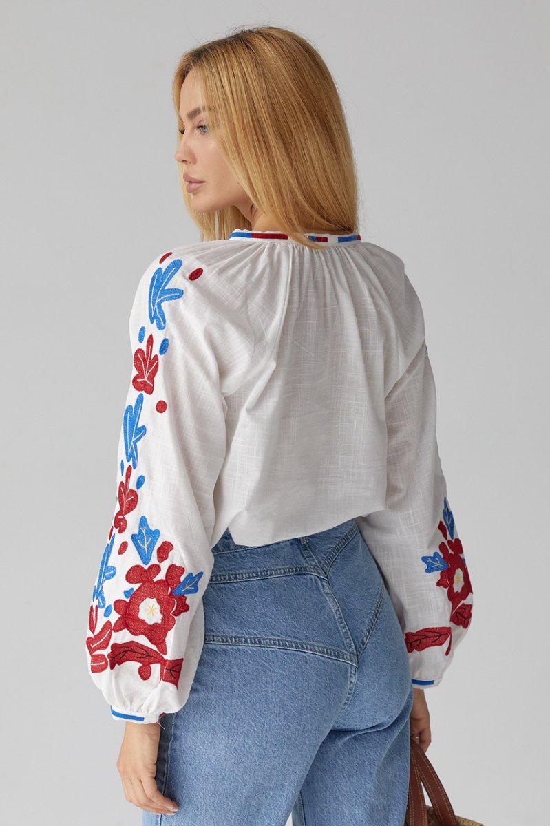 В модели низ прямой, а круглая горловина дополнена вышитой окантовкой. Длинные рукава-регланы внизу собраны в манжеты без застежки. Основная часть объемных рукавчиков и полочка спереди декорирована цветочными мотивами из машинной вышивки гладью. Спереди, возле пройм, так же присутствует вышивка, а по центру расположена вертикальная планка на пуговицах.