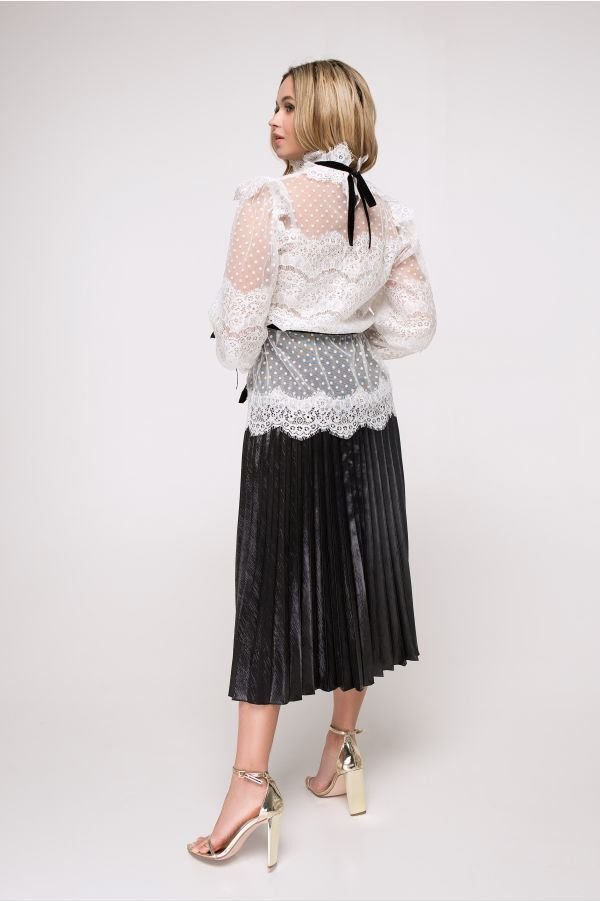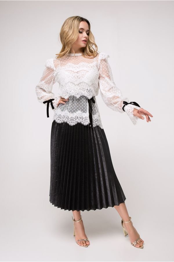Плиссированная юбка-полусолнце выполнена в длине миди. Модель оформлена эластичным широким поясом, что позволяет самостоятельно регулировать высоту посадки.