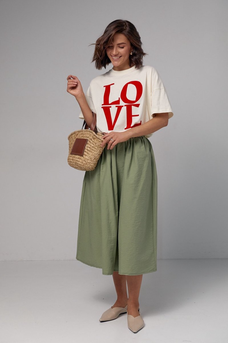 Эта модель имеет свободный крой, с прорезными карманами в боковых швах и на широкой резинке вверху.