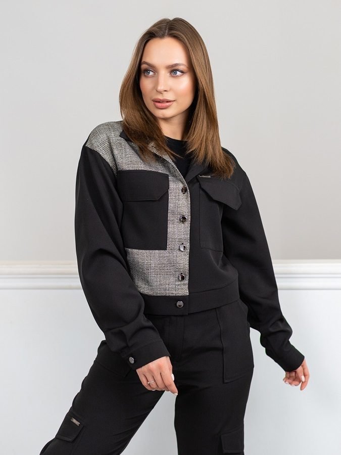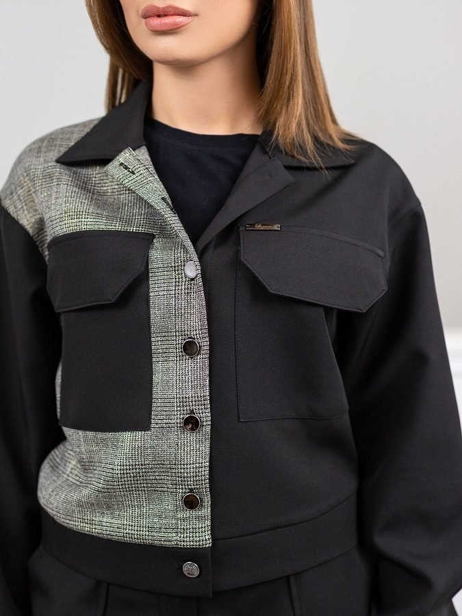 Красивый и стильный жакет Мейсон выполнен в стиле "пэчворк". Перед жакета создан из двух видов костюмной ткани: одна - однотонная, вторая - клетка с незначительным включением золотистых нитей люрекса. Два накладных кармана с клапанами. По низу жакета манжет, спущенная линия плеча. Жакет и манжеты рукавов застегиваются на пуговицы. По спинке кокетка. В нижней части спинки имеются защипы.