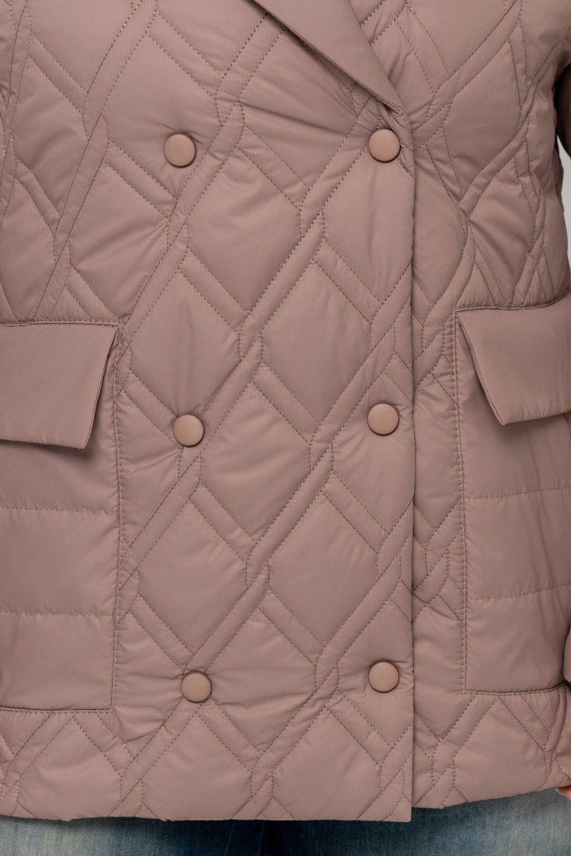 Жакет прямого силуэта, двухбортный. Выполнен из плащевки, наполнитель: тинсулейт 100 (г/м2). Воротник втачный с отложными лацканами. Рукав втачный, двухшовный. По полочке выполнены карманы с клапанами. Застежка на кнопке. Подкладка: нейлон.