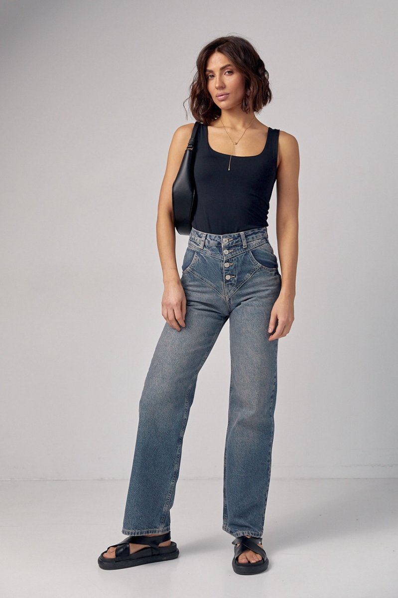 В модели низ прямой, горловина круглая. Спереди и сзади майка дополнена короткой подкладкой с основной ткани, которая позволяет изделию не просвечивается.