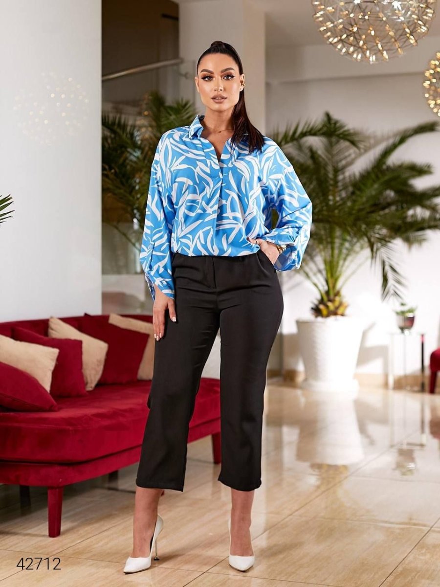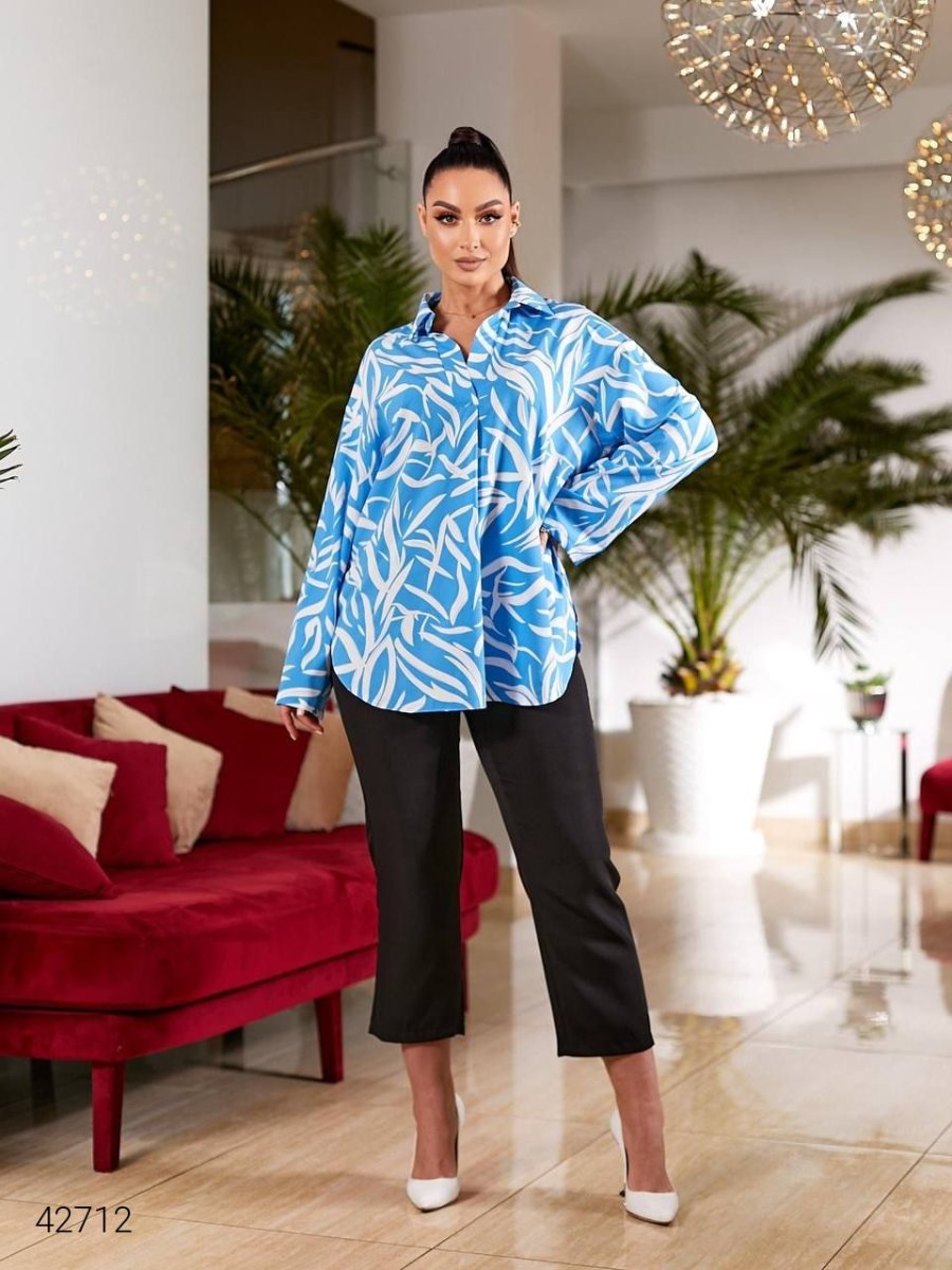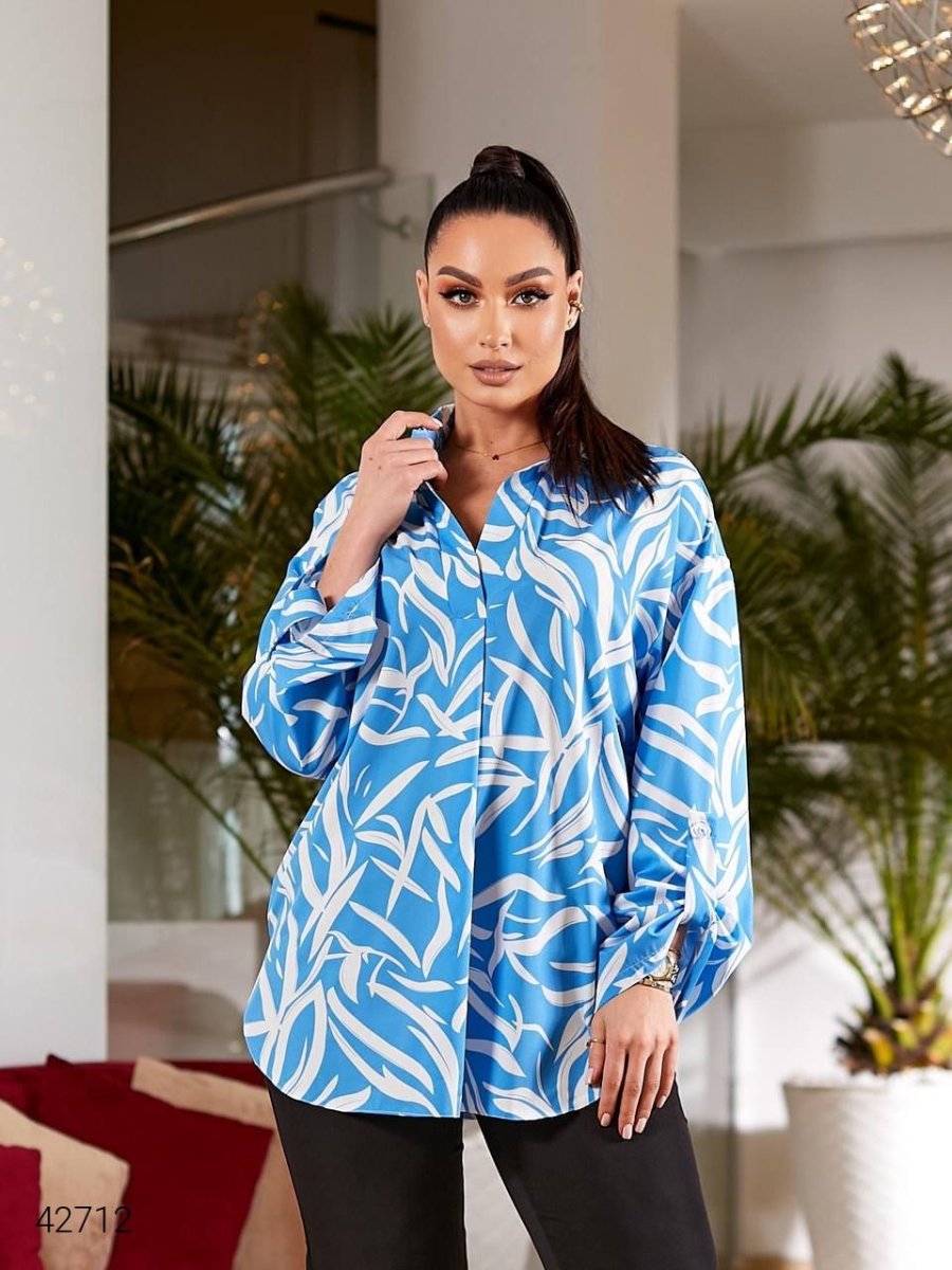 Женская блуза больших размеров. Рукав длинный, на манжете, можно поворачивать и фиксировать с помощью специальной детали на пуговице.