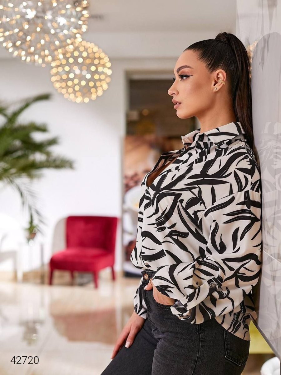 Женская блуза больших размеров. Рукав длинный, на манжете, можно поворачивать и фиксировать с помощью специальной детали на пуговице.