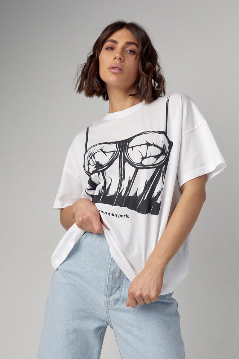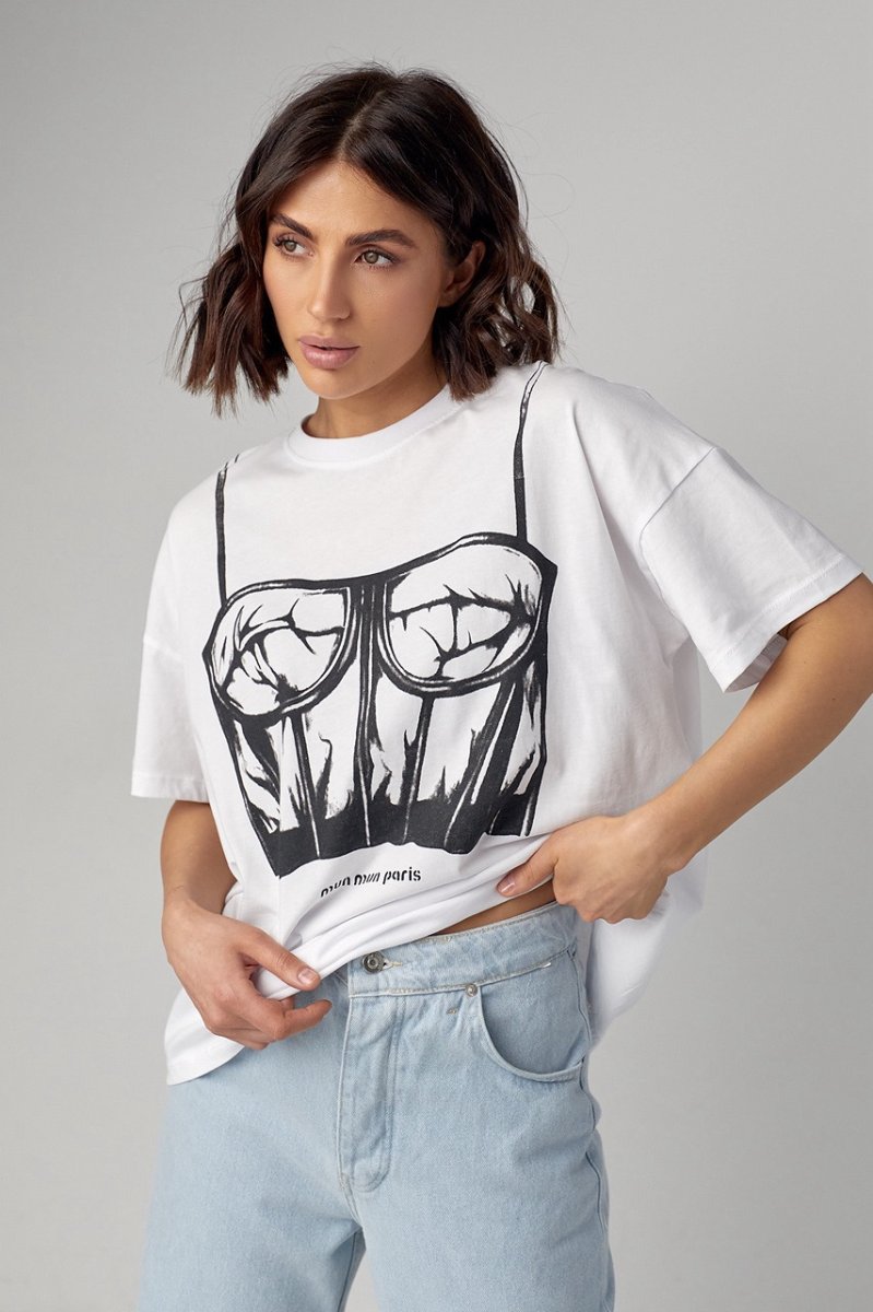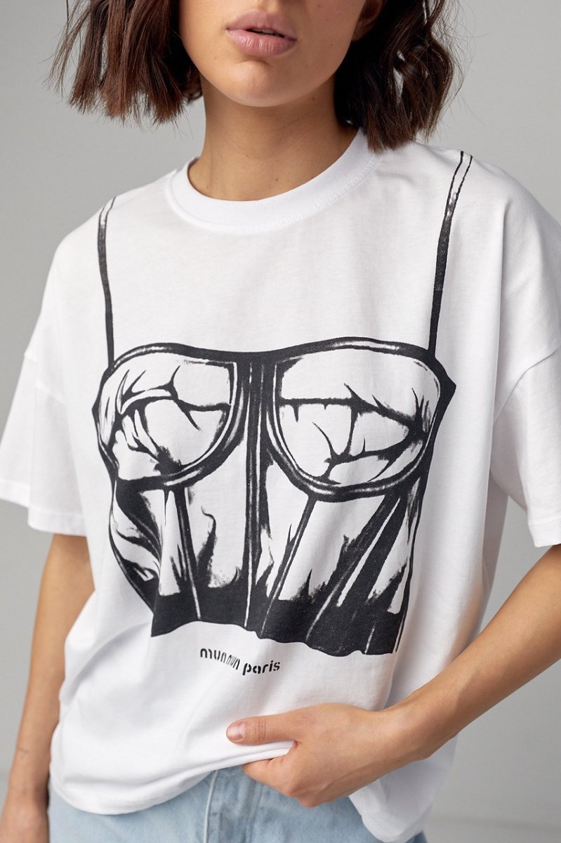Спереди на футболке расположен принт в виде корсета, который придает изделию оригинальность и индивидуальность. Под низом принта находится лаконичная надпись, которая дополняет общий вид футболки, делая её более выразительной и запоминающейся.
