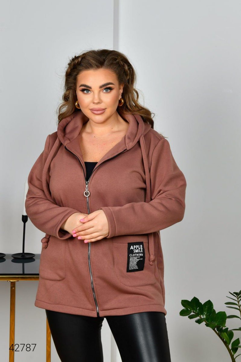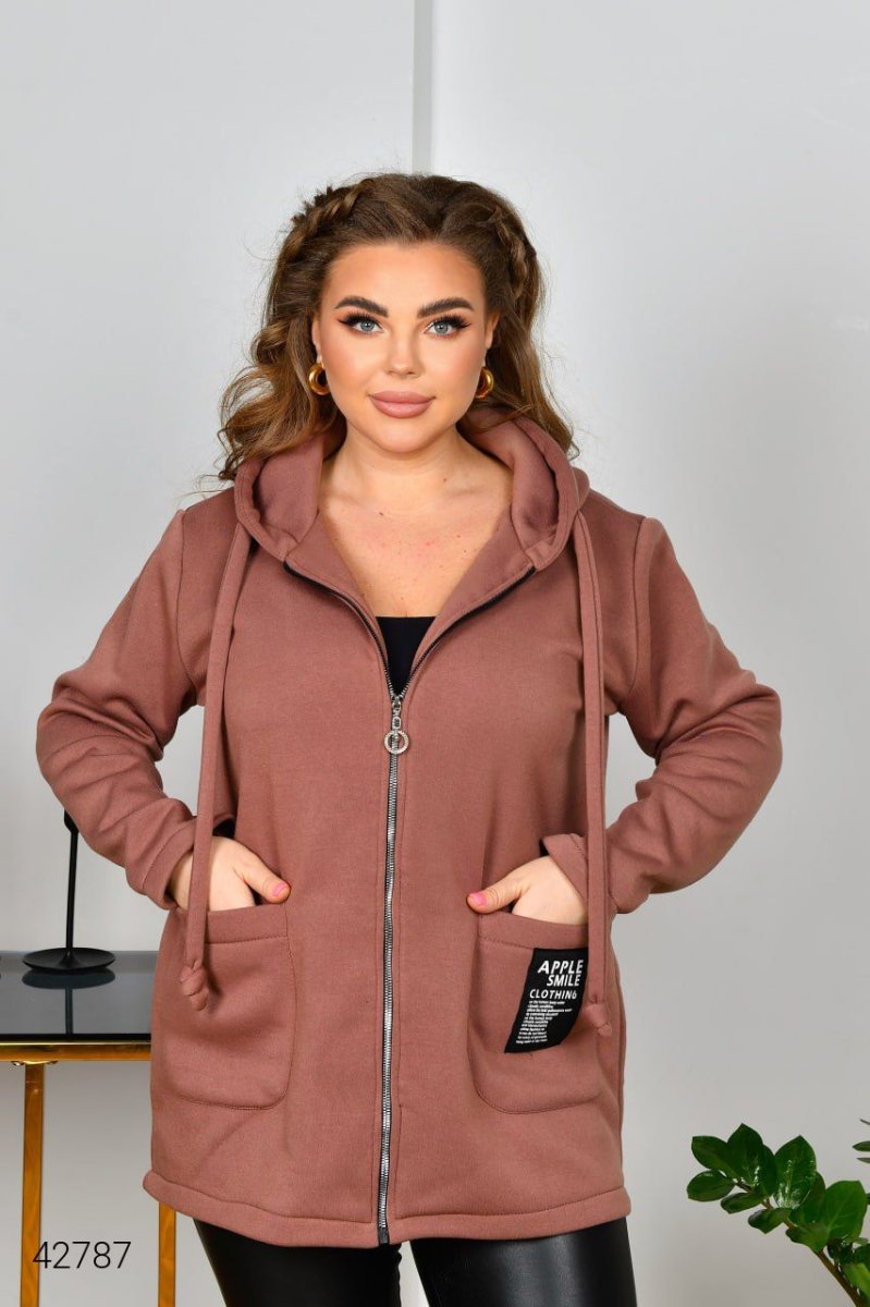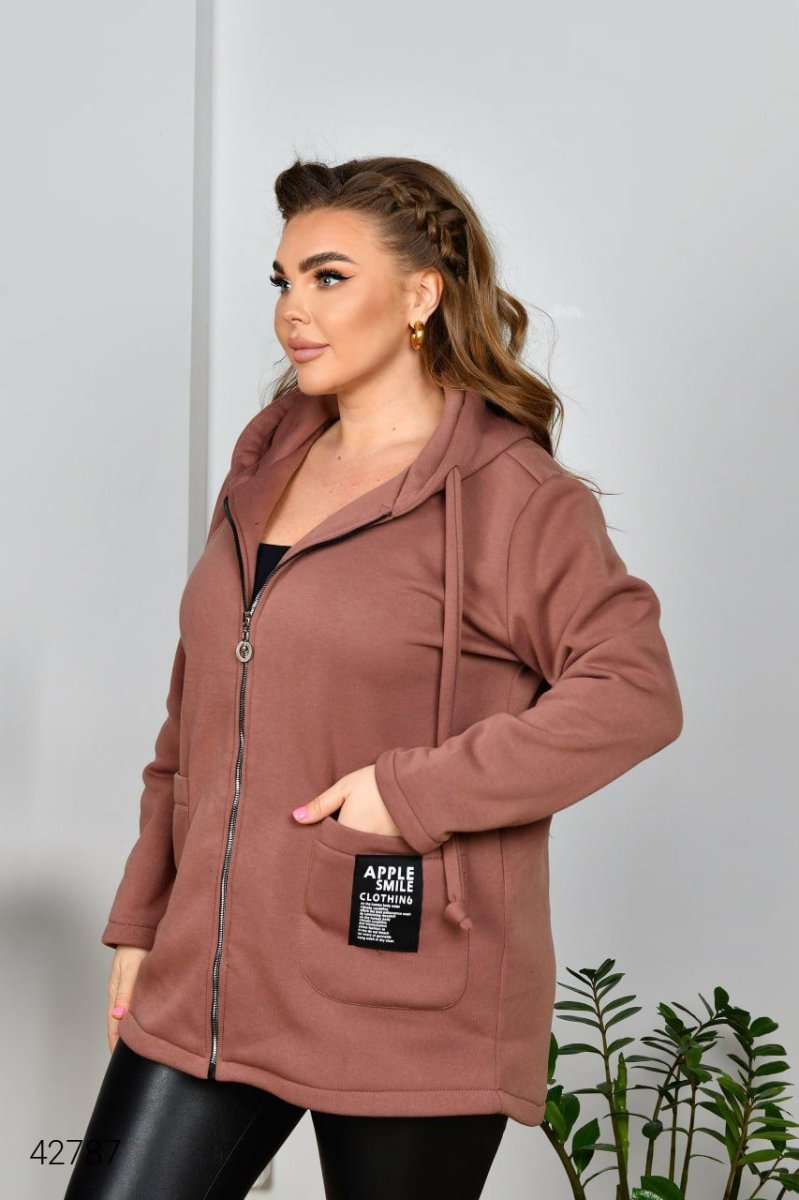 Женская кофта на молнии. Кофта прямого свободного силуэта, застегивающаяся на молнию. В кулисе капюшона протянут объемный шнурок из основного материала. Впереди накладные карманы. Декорирован черно-белой нашивкой.