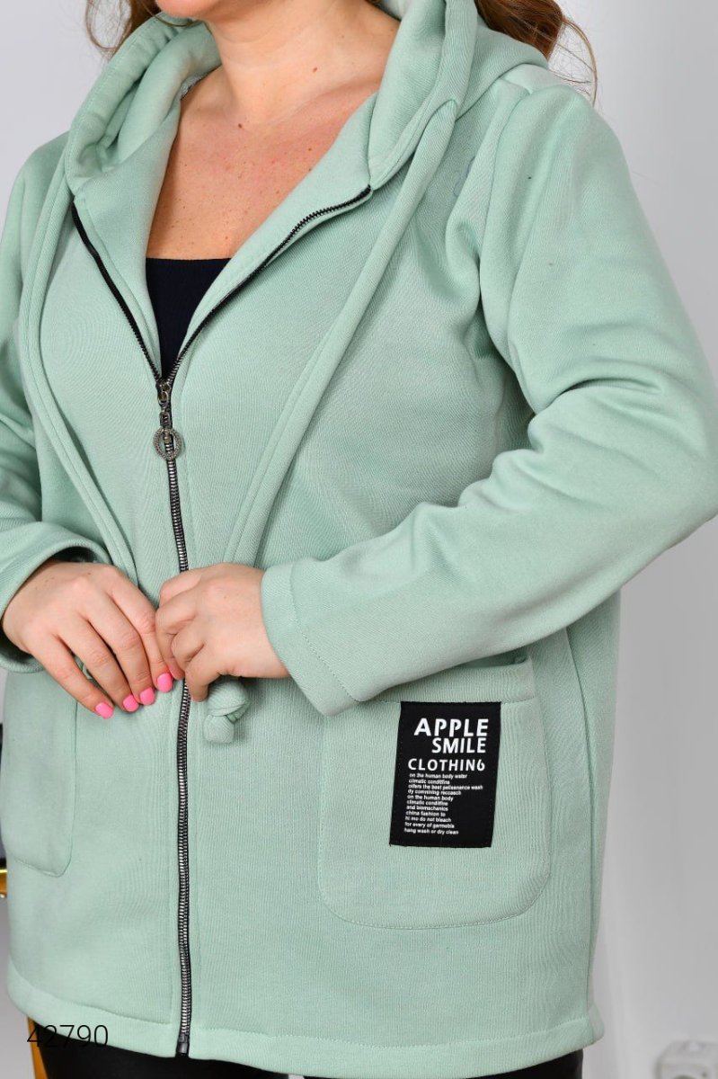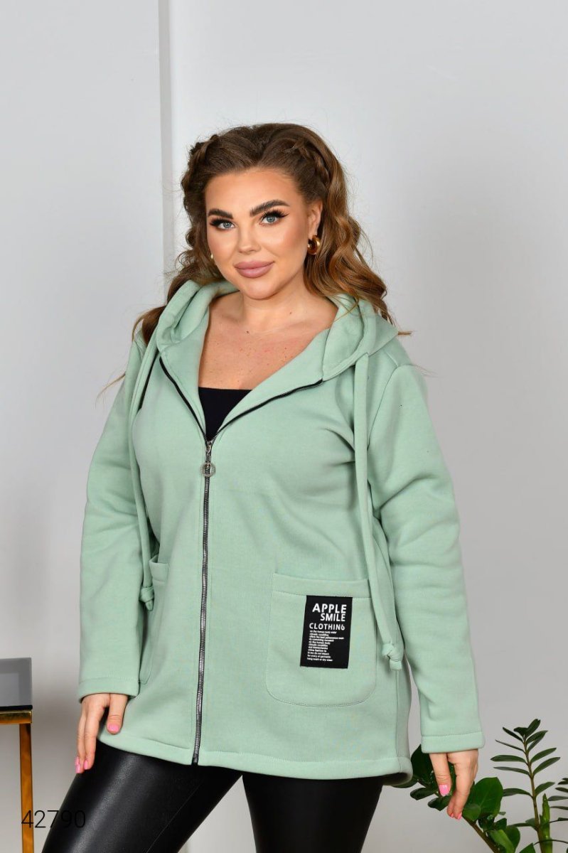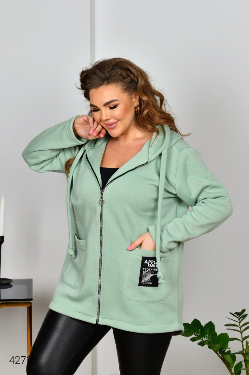 Женская кофта на молнии. Кофта прямого свободного силуэта, застегивающаяся на молнию. В кулисе капюшона протянут объемный шнурок из основного материала. Впереди накладные карманы. Декорирован черно-белой нашивкой.