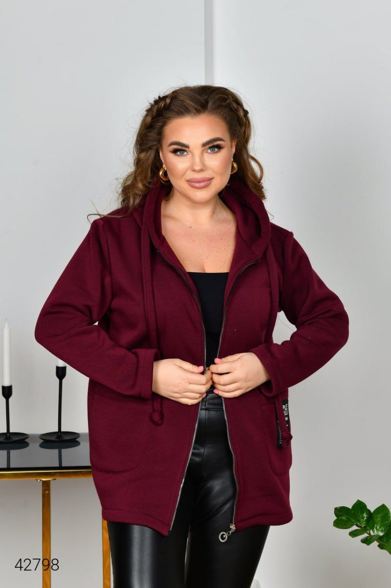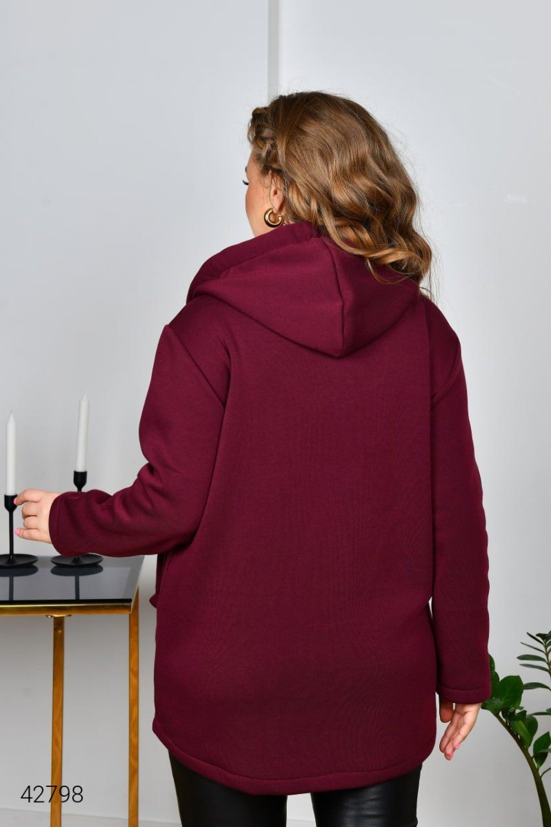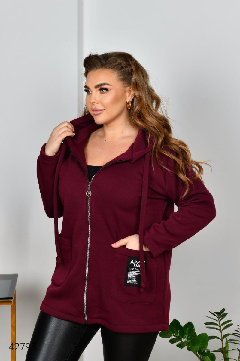 Женская кофта на молнии. Кофта прямого свободного силуэта, застегивающаяся на молнию. В кулисе капюшона протянут объемный шнурок из основного материала. Впереди накладные карманы. Декорирован черно-белой нашивкой.