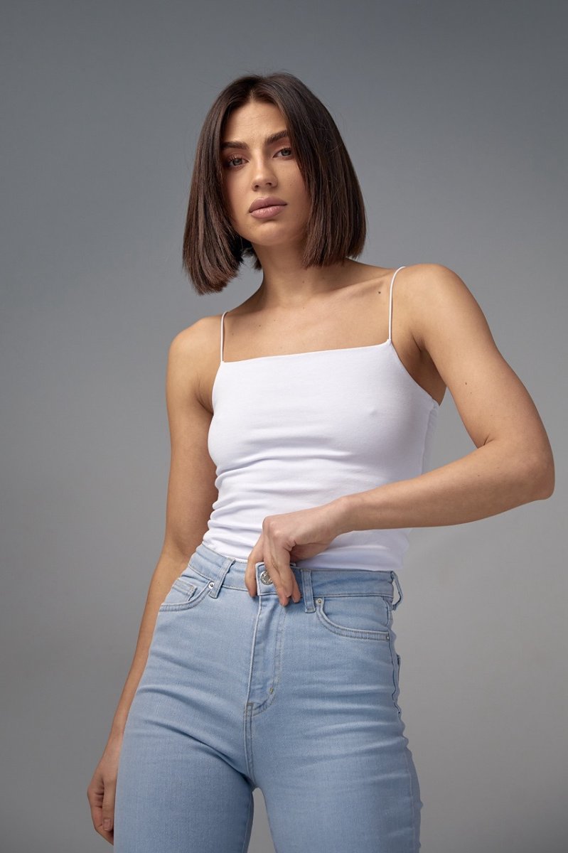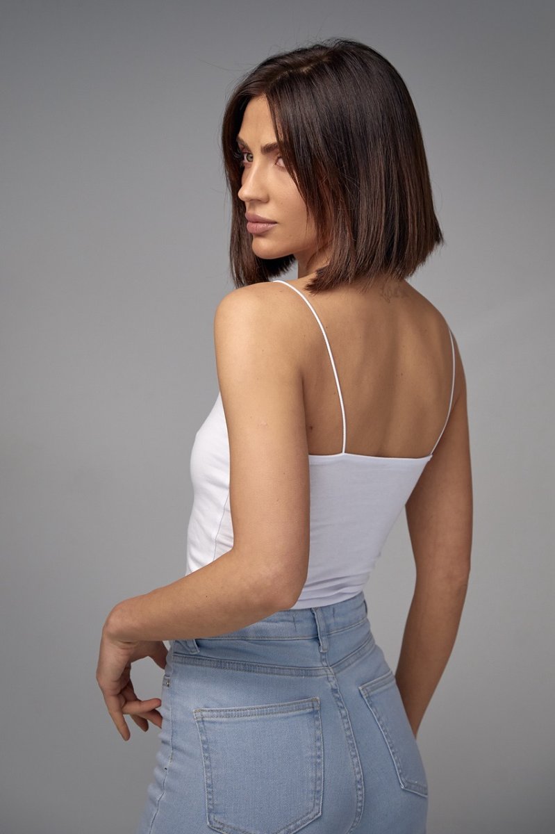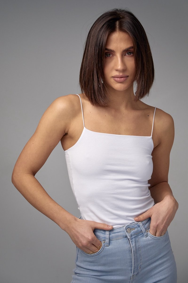 Модель на тонких бретелях-резинках без регулировки длины сшита из трикотажа, с прямым низом и с дополнительной подкладкой спереди изделия.