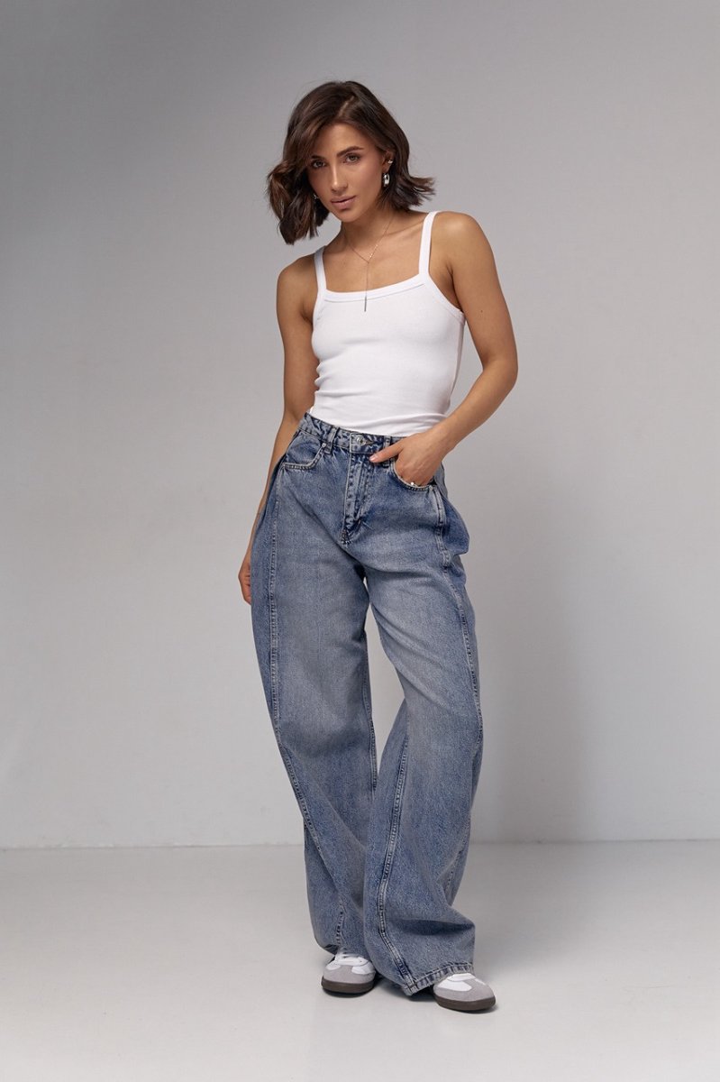 Модель на тонких бретелях без регулировки длины сшита из трикотажа в мелкий рубчик, с прямым низом и с окантовкой вверху изделия.