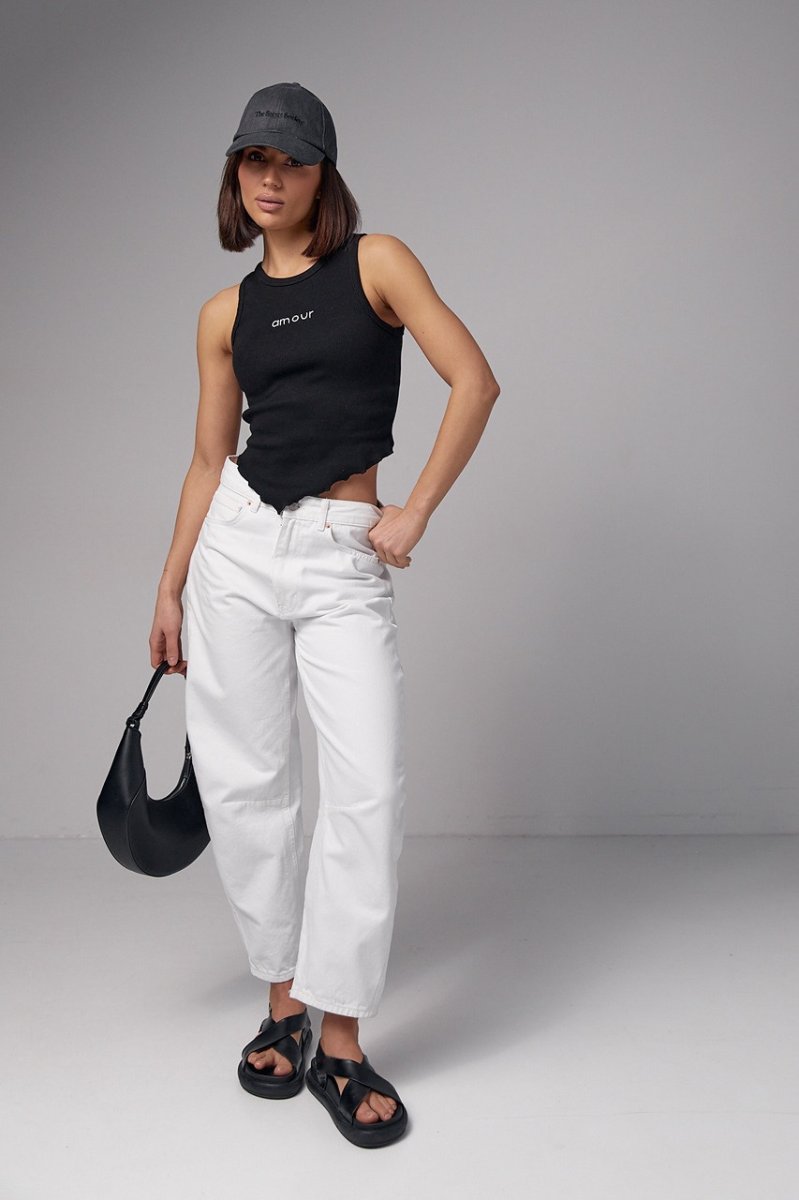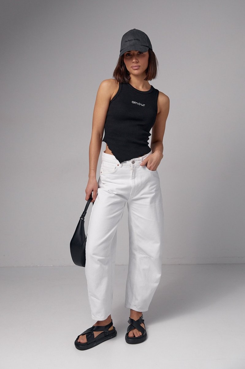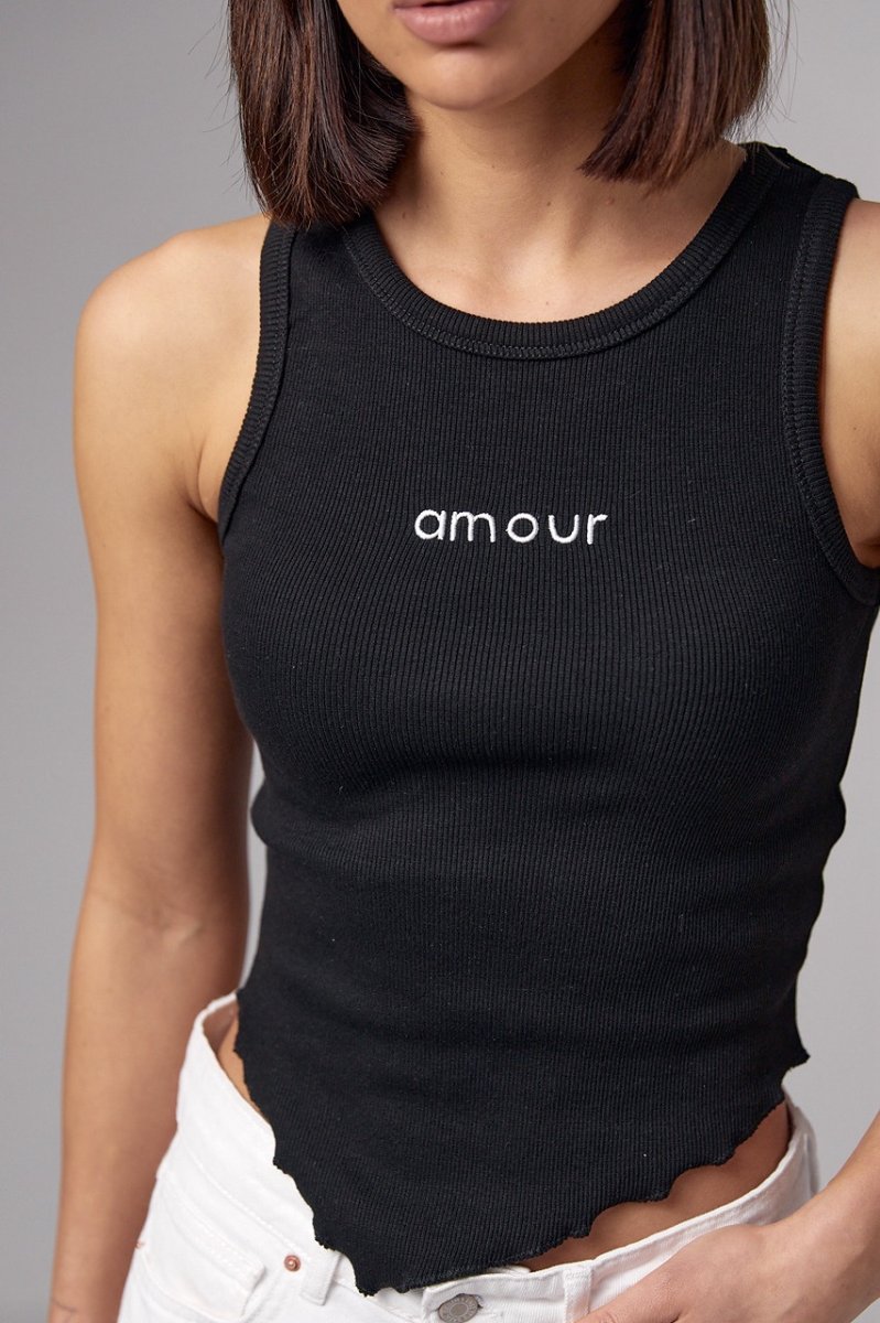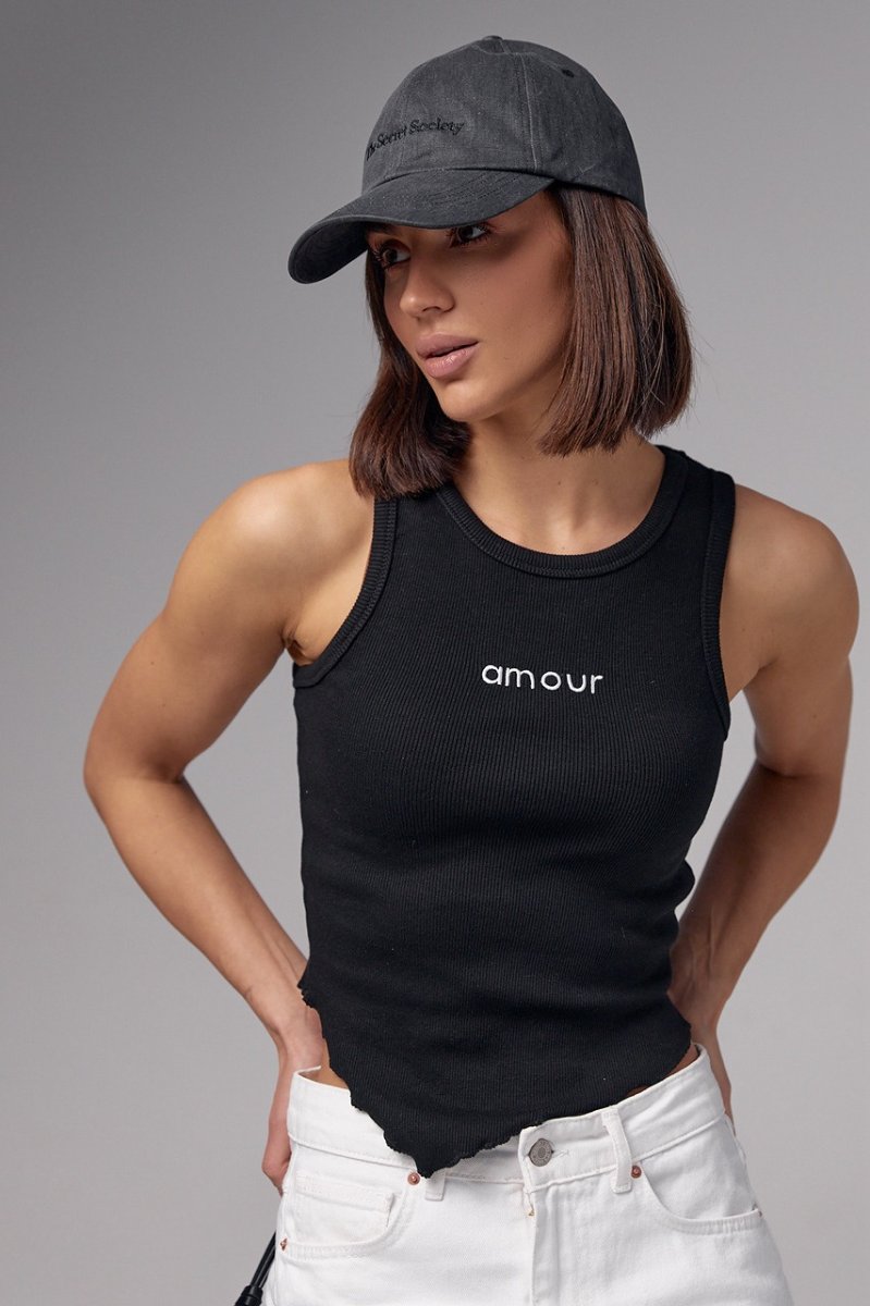 Эта модель из трикотажа в рубчик станет главной изюминкой твоих аутфитов благодаря асимметричному фасону. На спинке изделия низ прямой, а спереди - асимметричный. Круглая горловина и проймы обшиты окантовкой в тон. Спереди майку украшает вышитая надпись Amour.