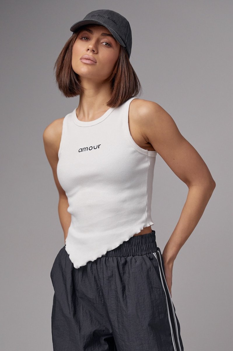 Эта модель из трикотажа в рубчик станет главной изюминкой твоих аутфитов благодаря асимметричному фасону. На спинке изделия низ прямой, а спереди - асимметричный.  Круглая горловина и проймы обшиты окантовкой в тон. Спереди майку украшает вышитая надпись Amour.