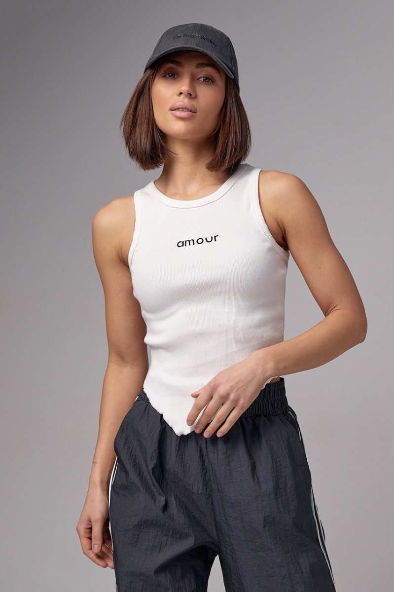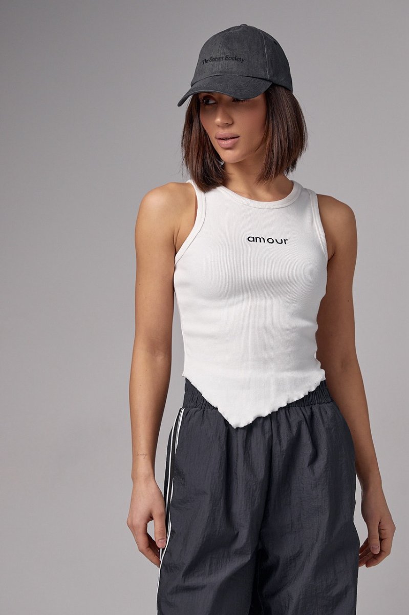 Женская майка в рубчик с асимметрией и надписью Amour - 29621 молочная