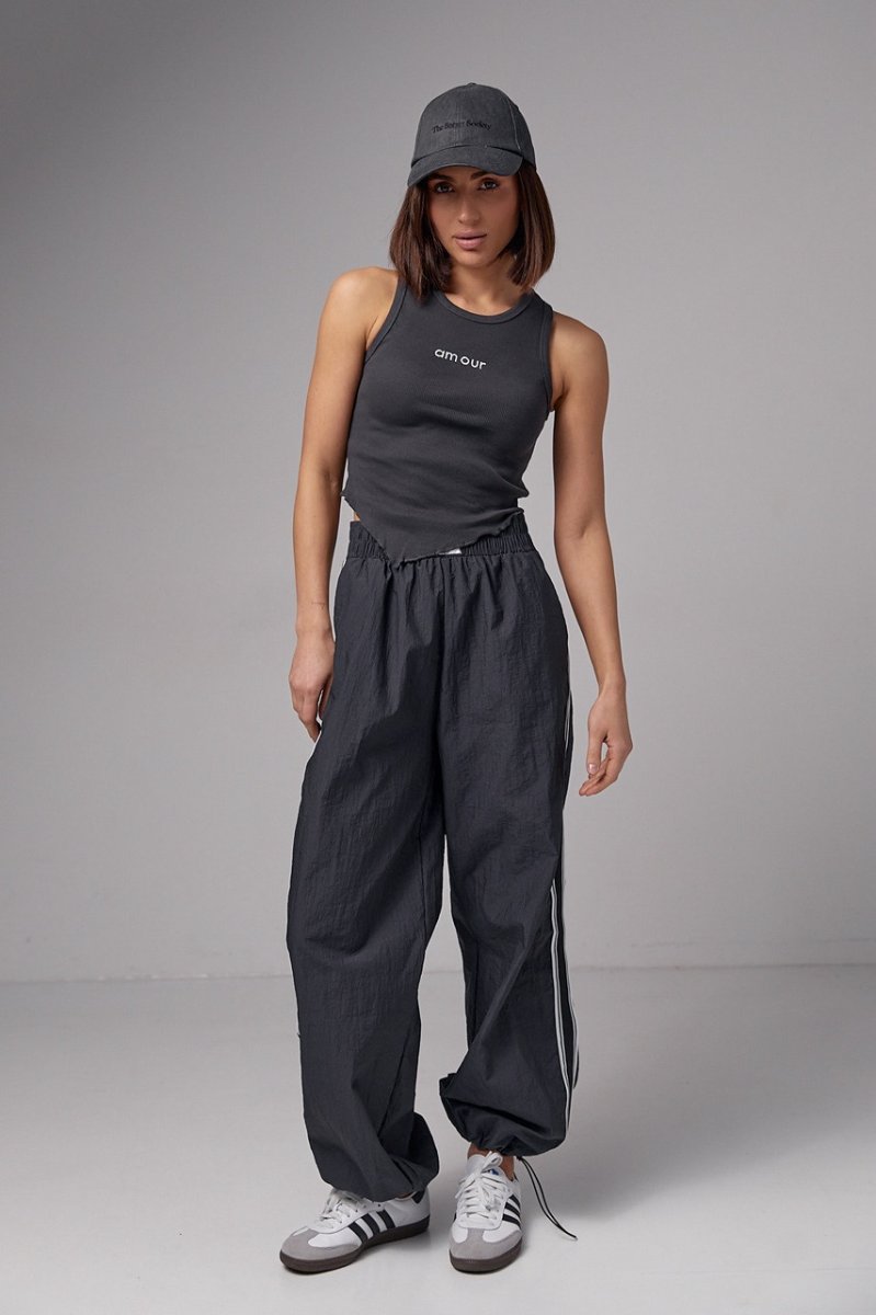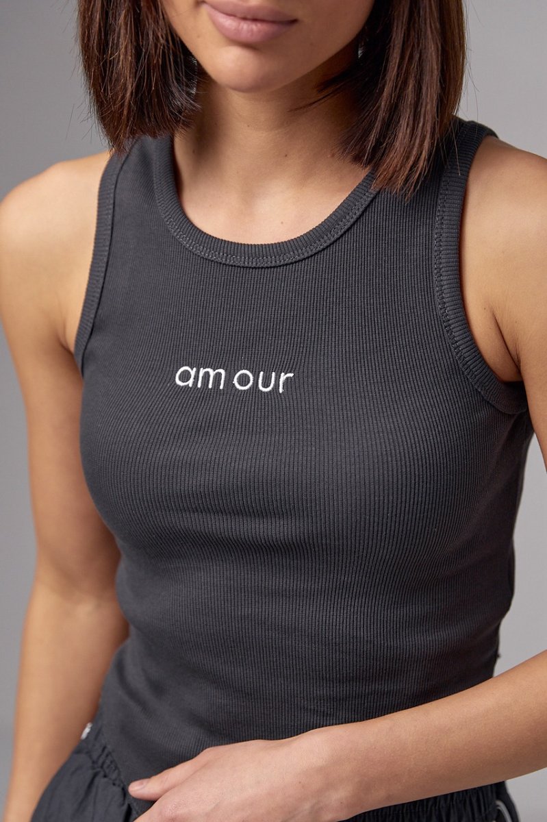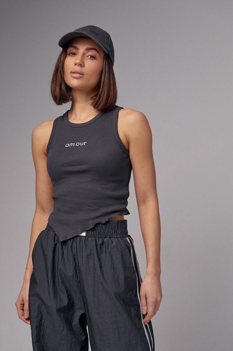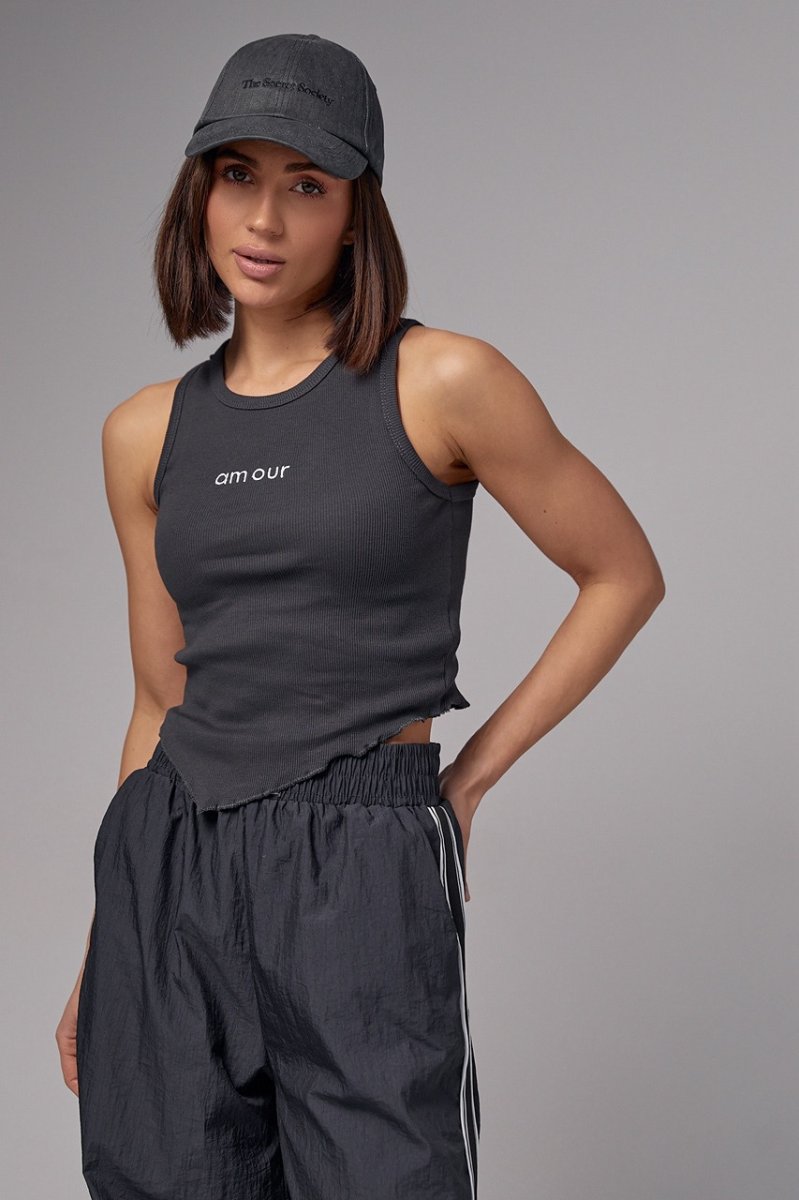 Эта модель из трикотажа в рубчик станет главной изюминкой твоих аутфитов благодаря асимметричному фасону. На спинке изделия низ прямой, а спереди - асимметричный. Круглая горловина и проймы обшиты окантовкой в тон. Спереди майку украшает вышитая надпись Amour.