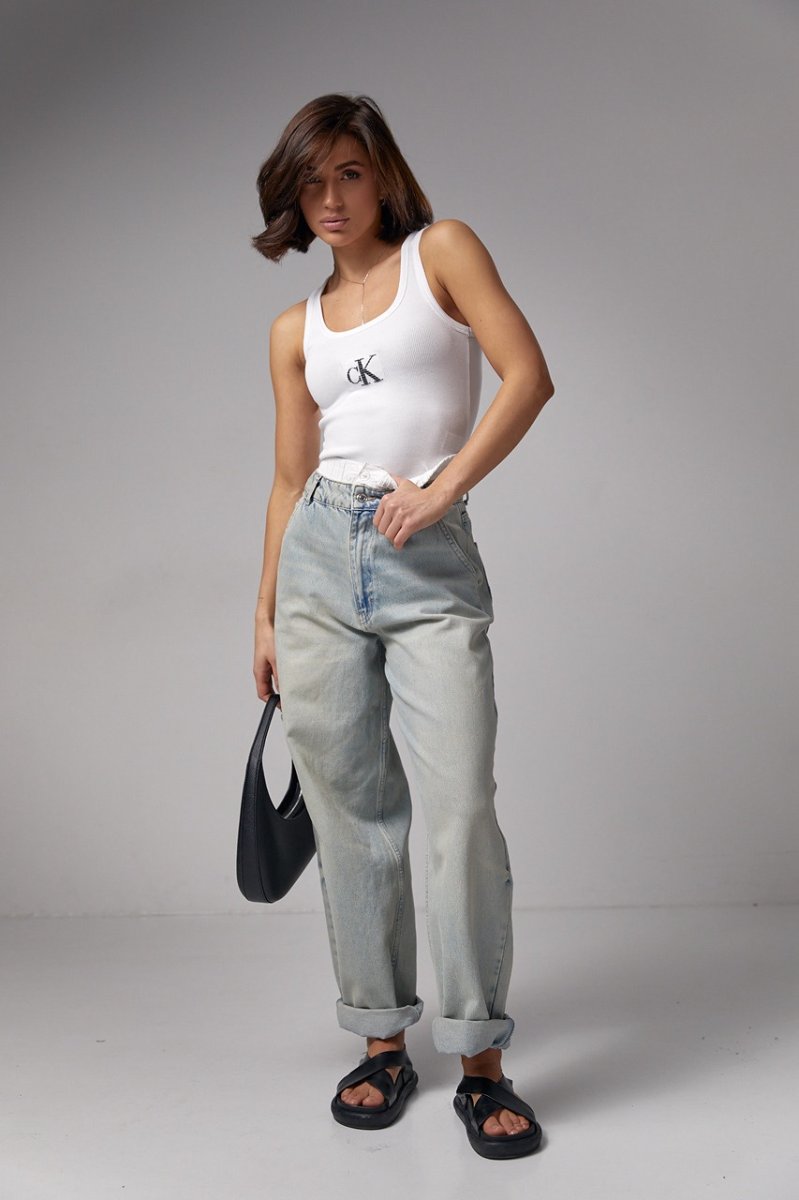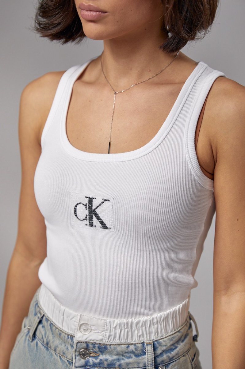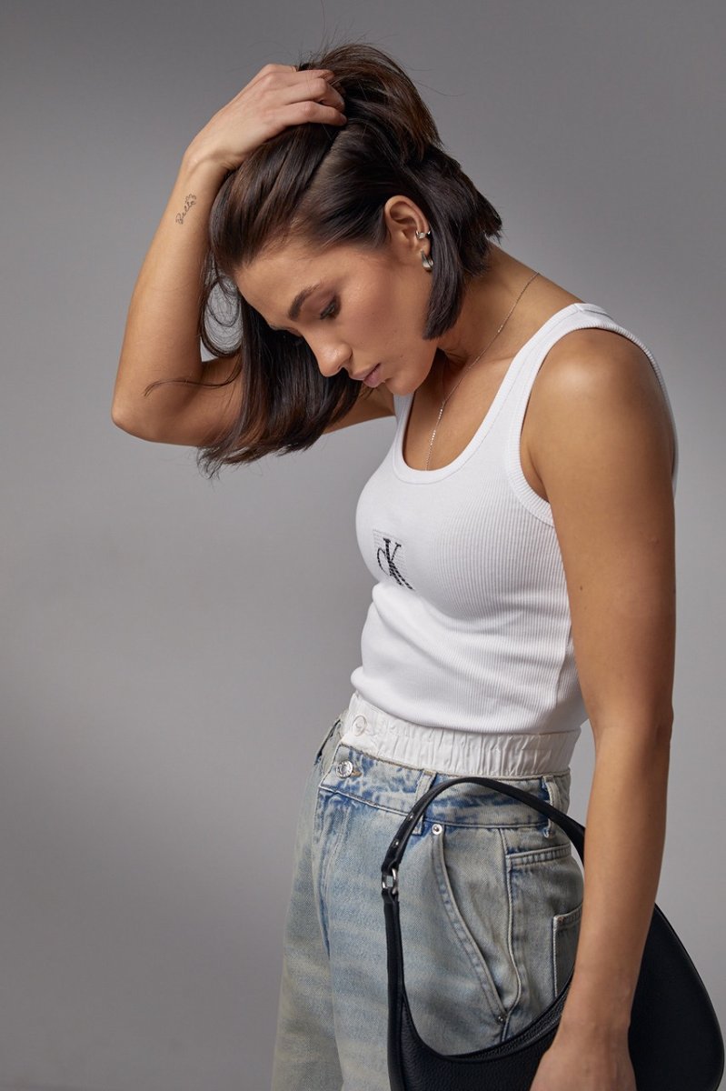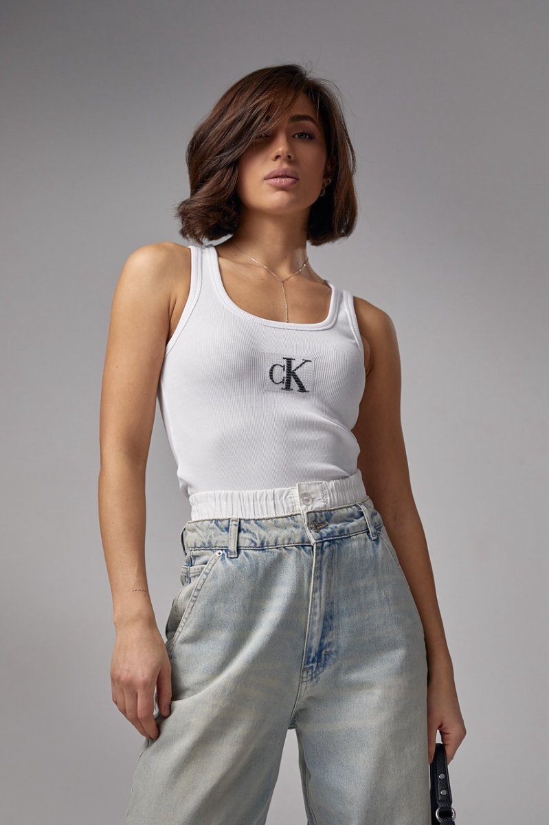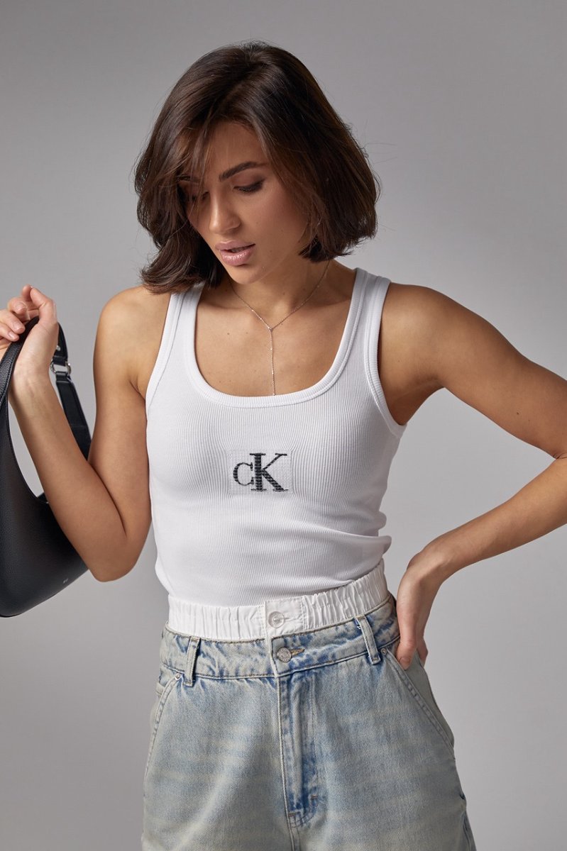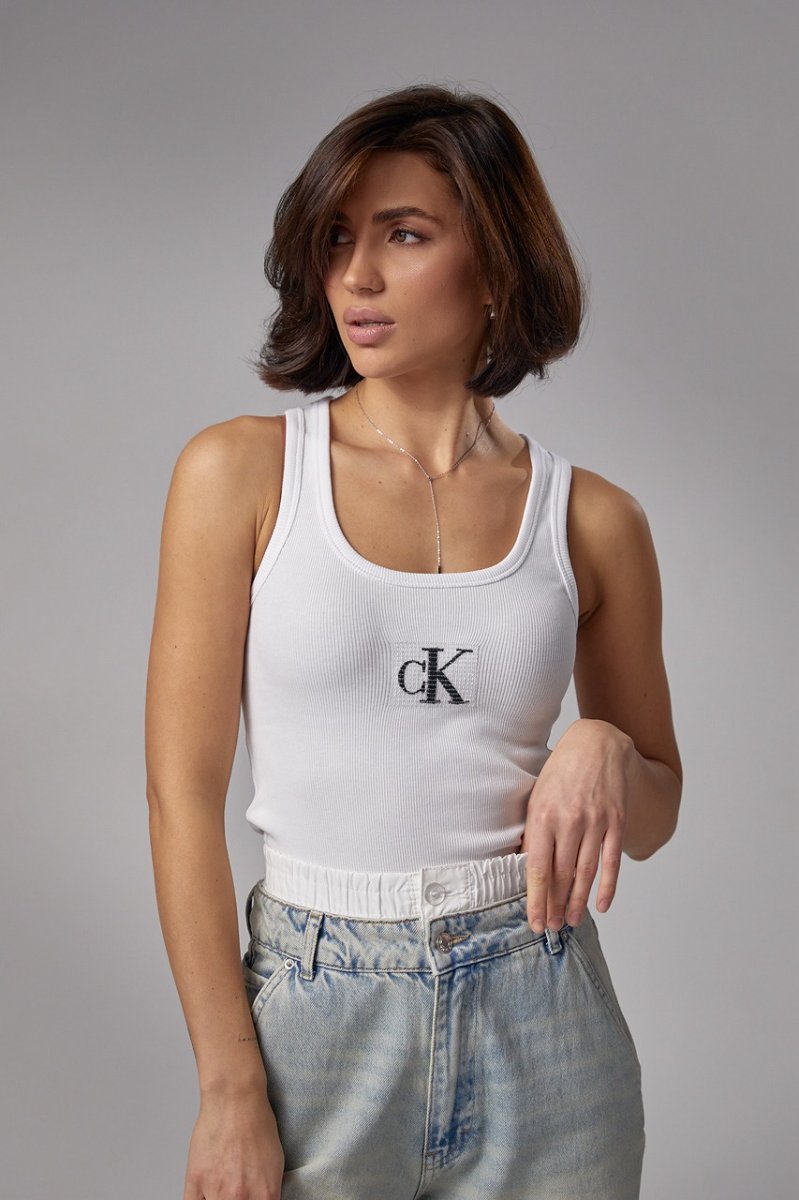 Эта модель на широких бретелях идет с прямыми краями внизу. Круглая горловина и проймы обшиты окантовкой в тон. Спереди майку украшают пайетки и вышитая надпись СК.
