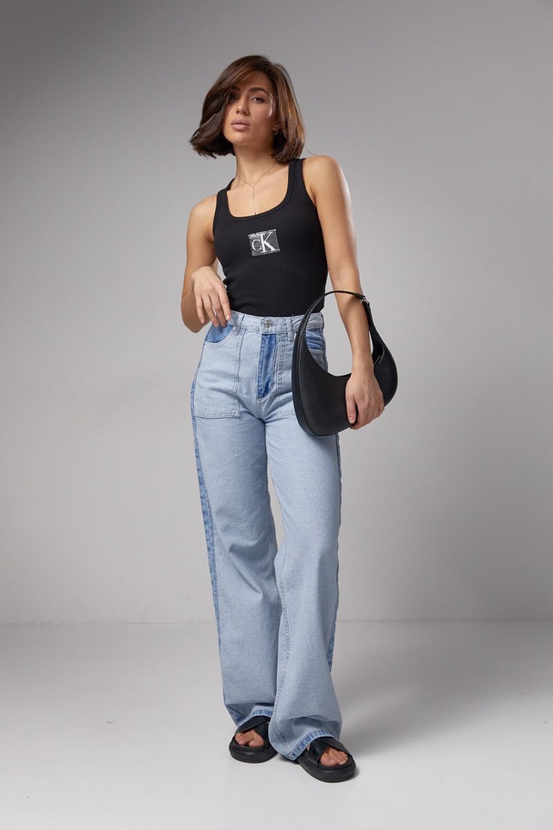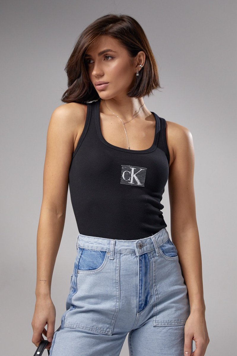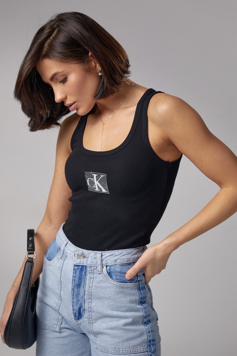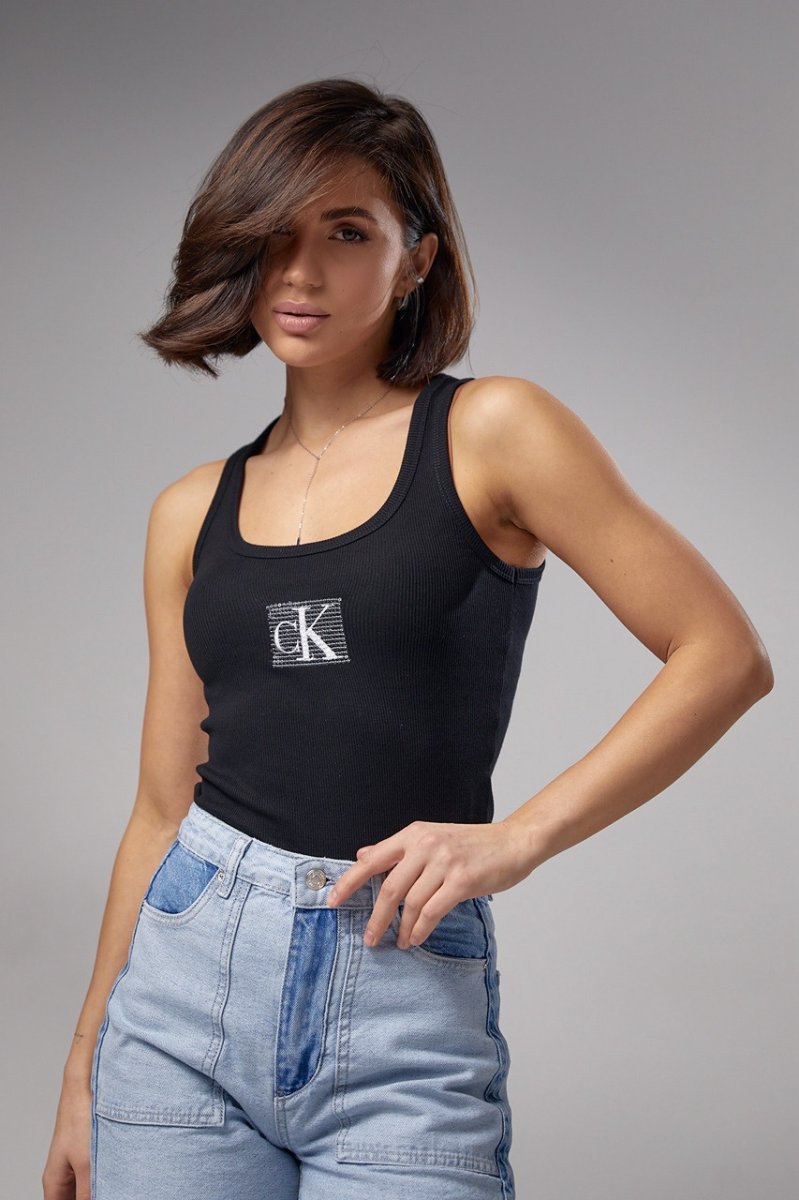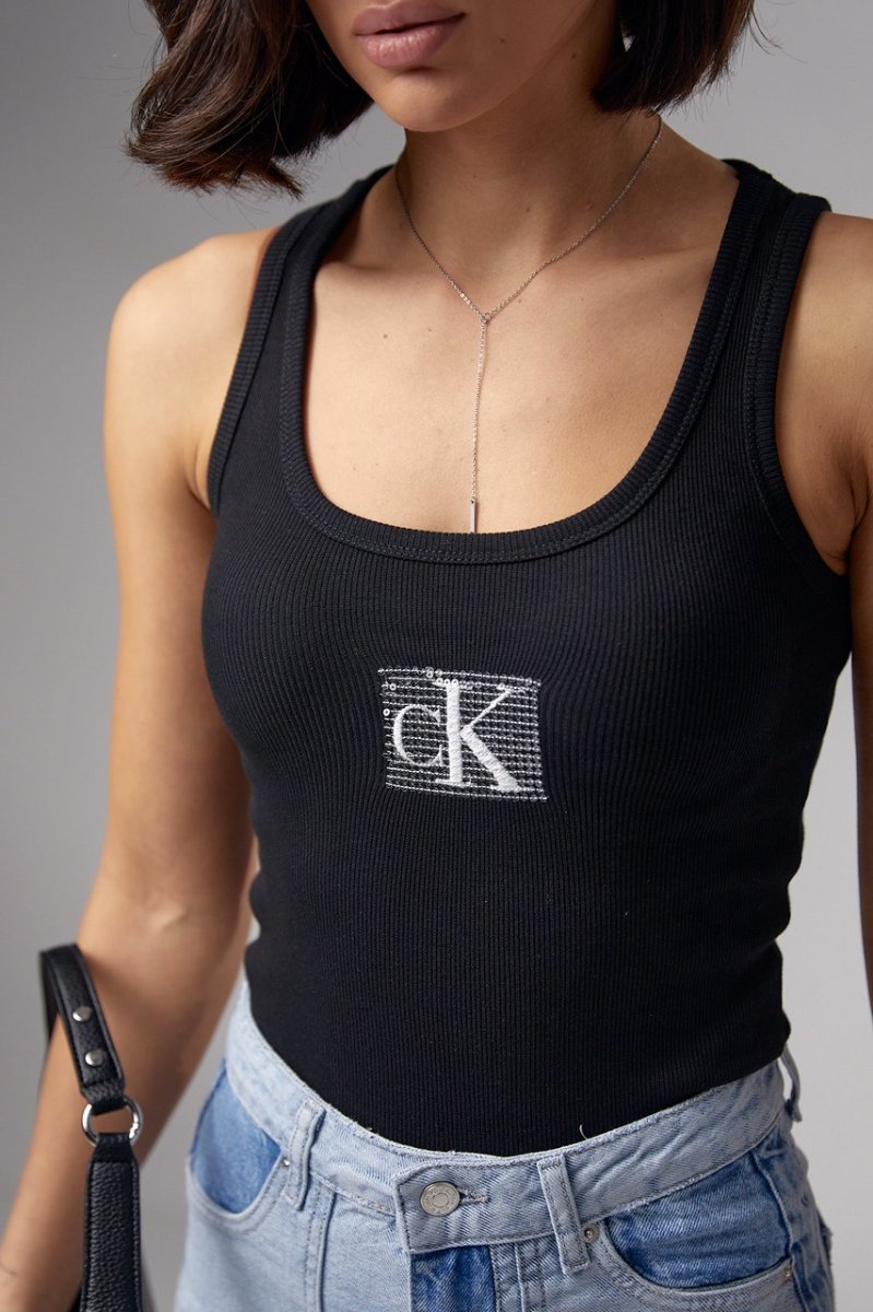 Эта модель на широких бретелях идет с прямыми краями внизу. Круглая горловина и проймы обшиты окантовкой в тон. Спереди майку украшают пайетки и вышитая надпись СК.