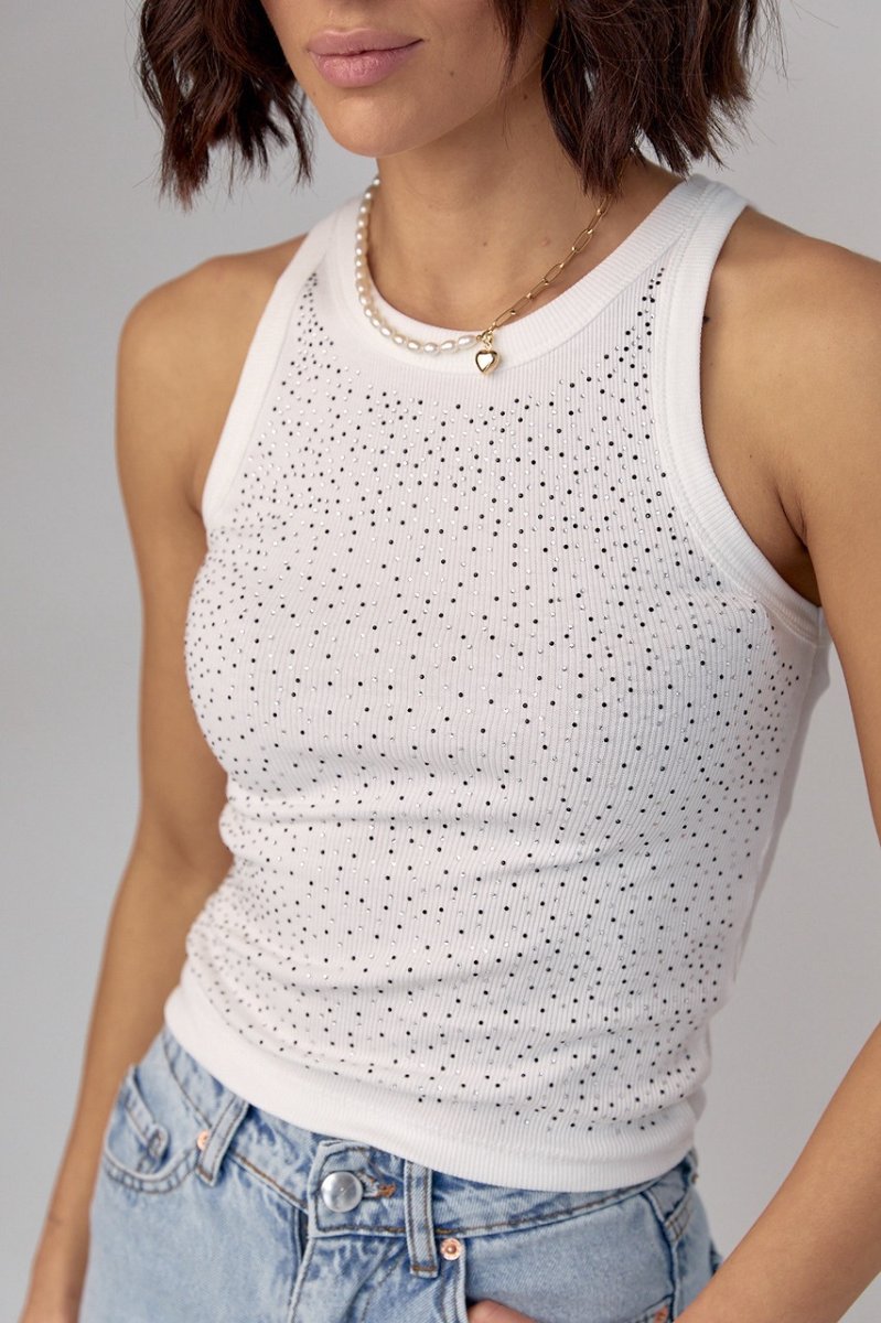 Женская майка в рубчик украшена термостразами - 03262 молочная