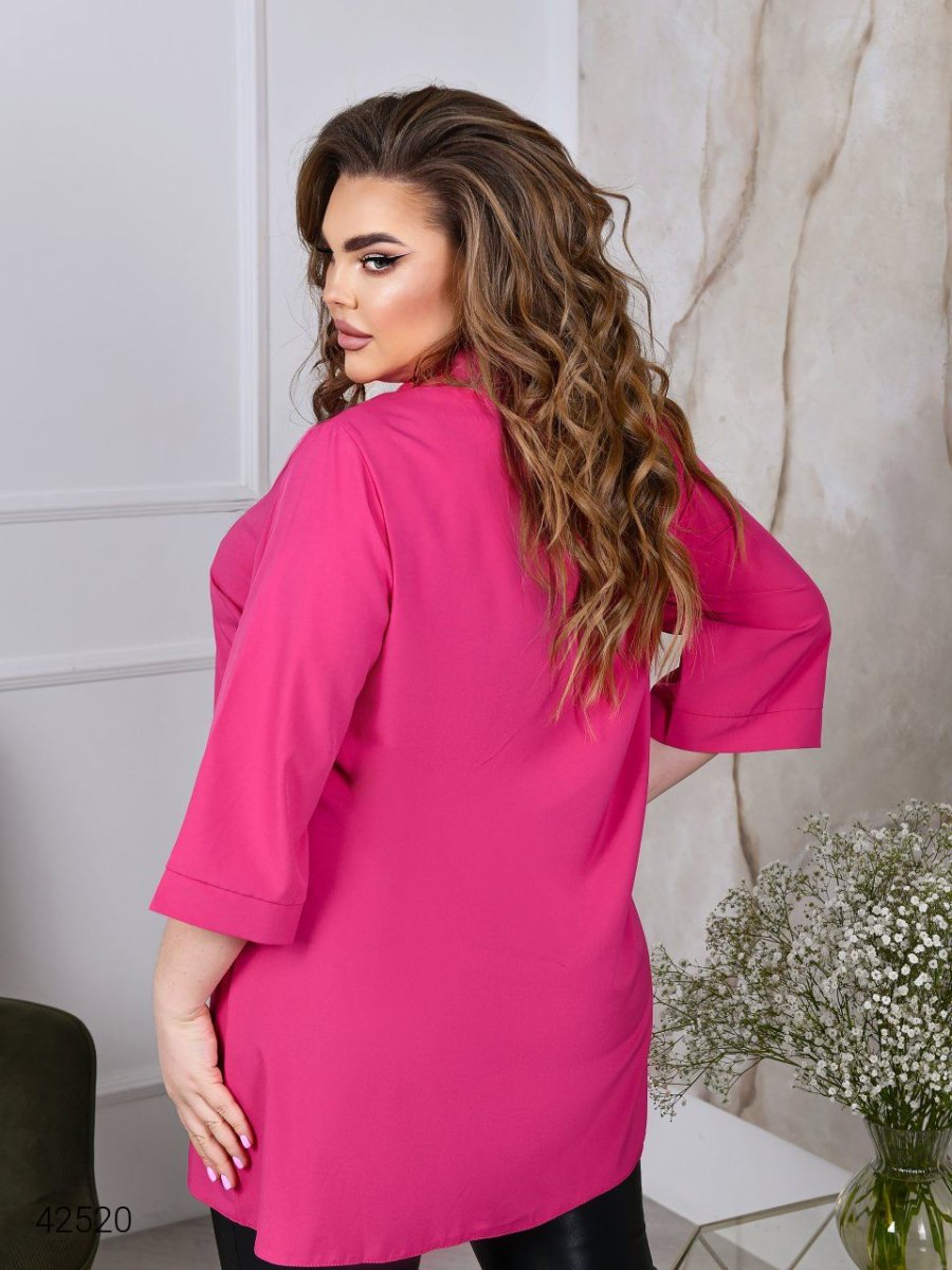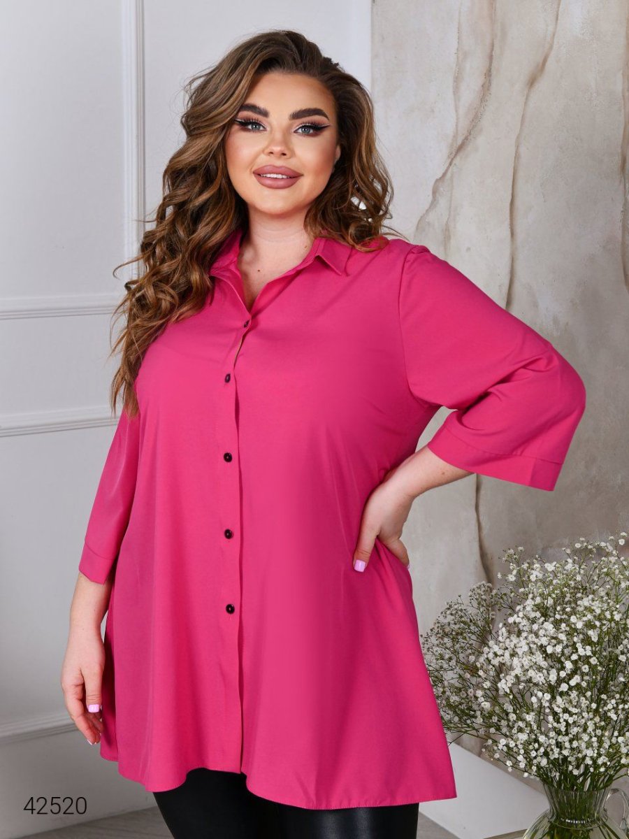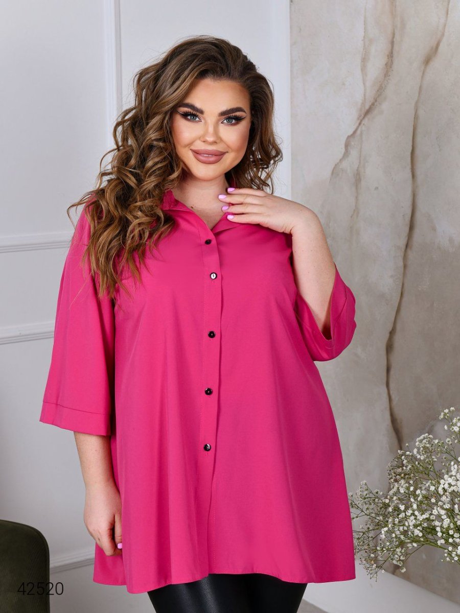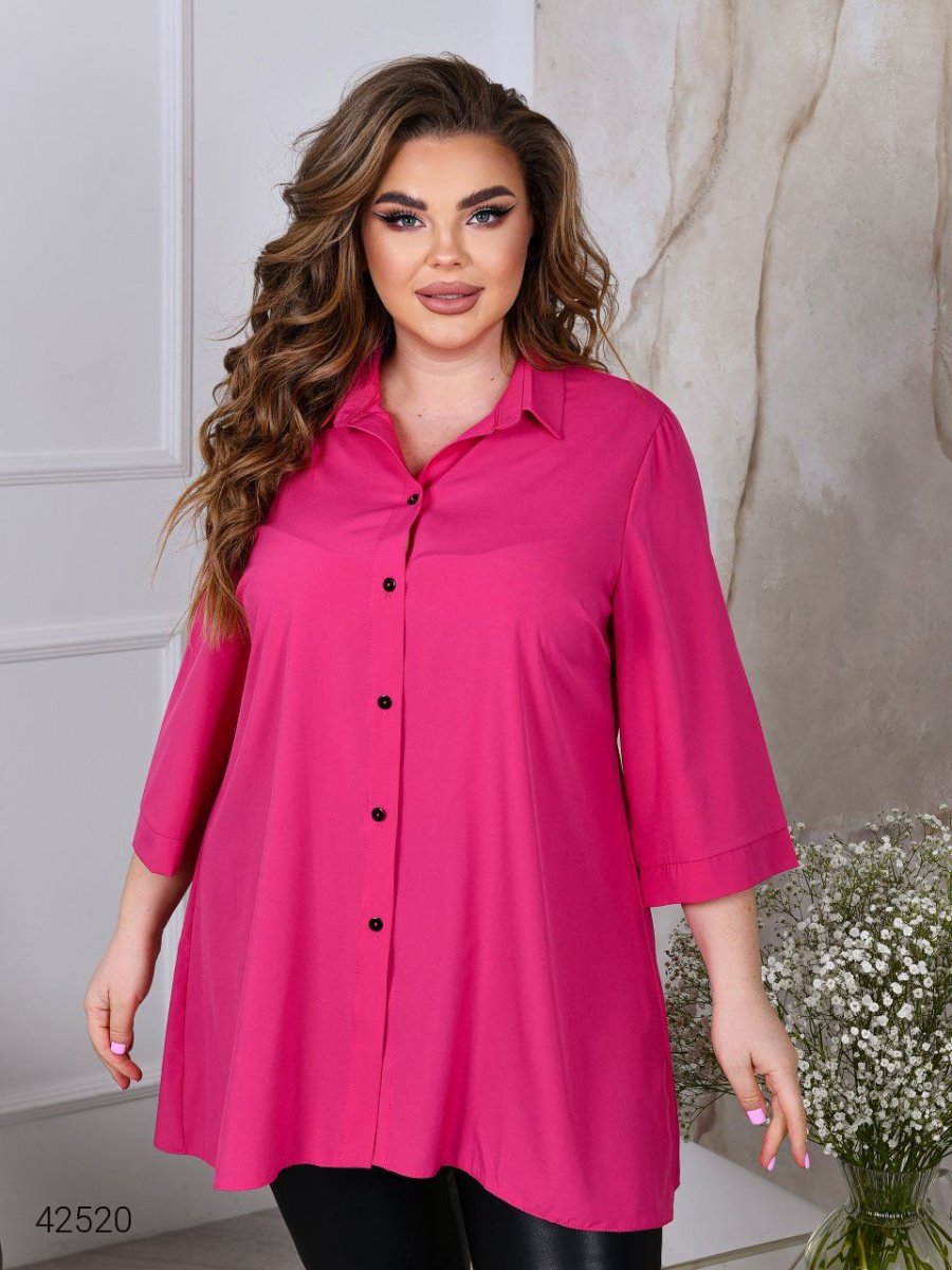 Женская рубашка больших размеров. Силуэт свободный, А-образный. Рукав широкий, прямой, длиной чуть ниже локтя.