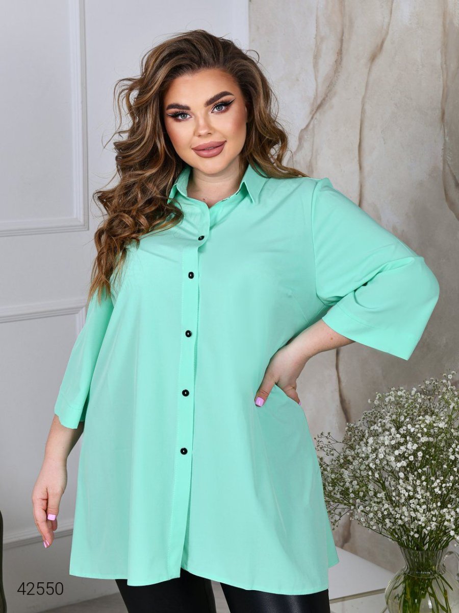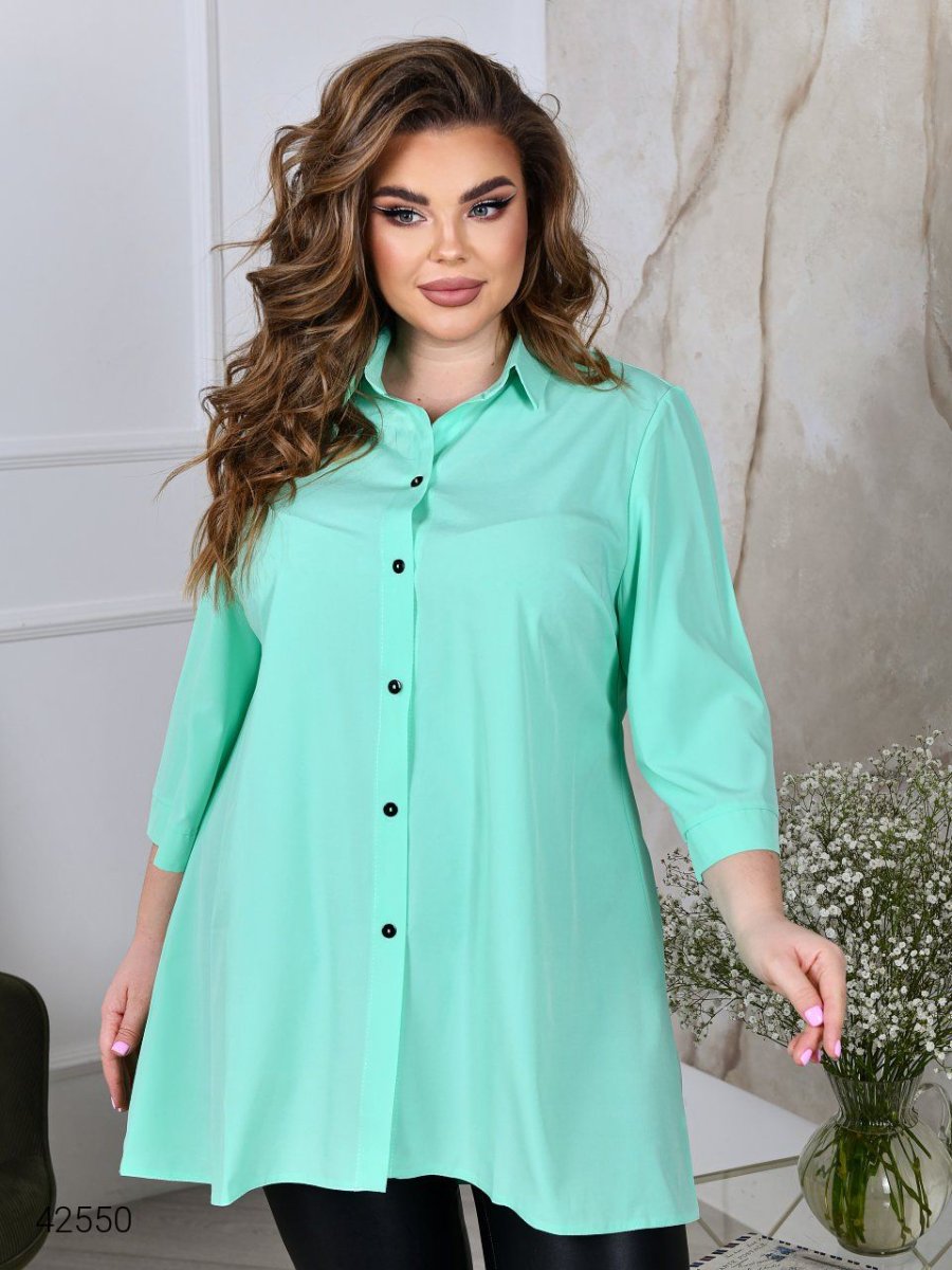 Женская рубашка больших размеров. Силуэт свободный, А-образный. Рукав широкий, прямой, длиной чуть ниже локтя.
