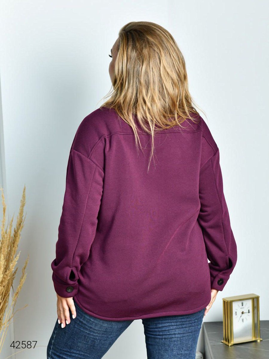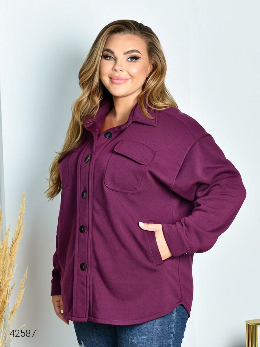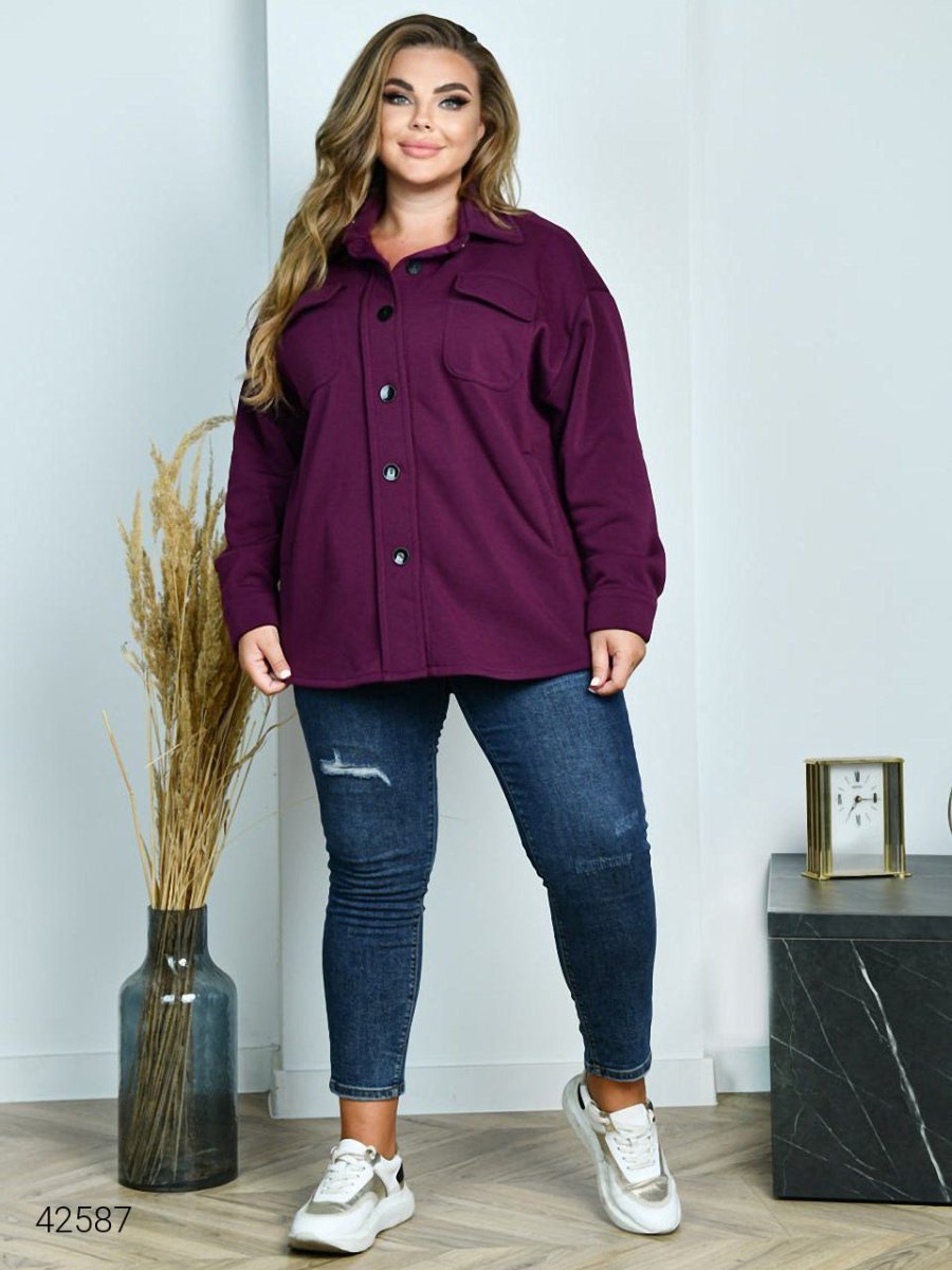 Женская рубашка больших размеров. Рубашка застёгивается на пуговицы. Линия плеча спущена. Рукав на манжете с пуговицей. Есть два нагрудных и два прорезных кармана.