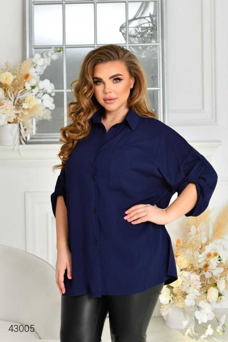 Рубашка со стояче-отложным воротничком, имеет свободный прямой силуэт. Впереди застегивается на пуговицы по планке. Линия плеча спущена, рукав прямой, широкий, длиной 7/8, можно укорачиваться с помощью специальной детали на пуговице. Низ оформлен двумя разрезами по бокам.