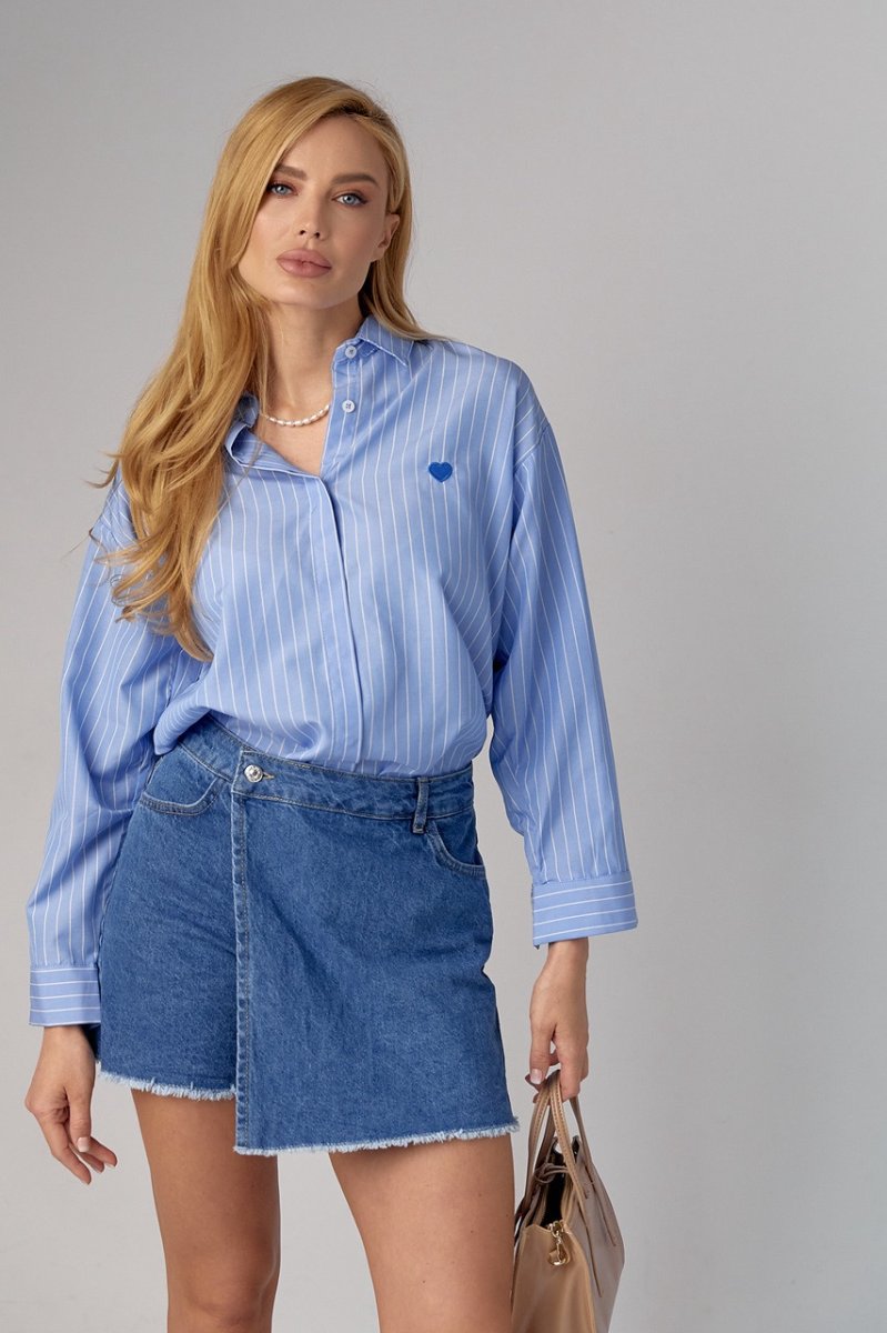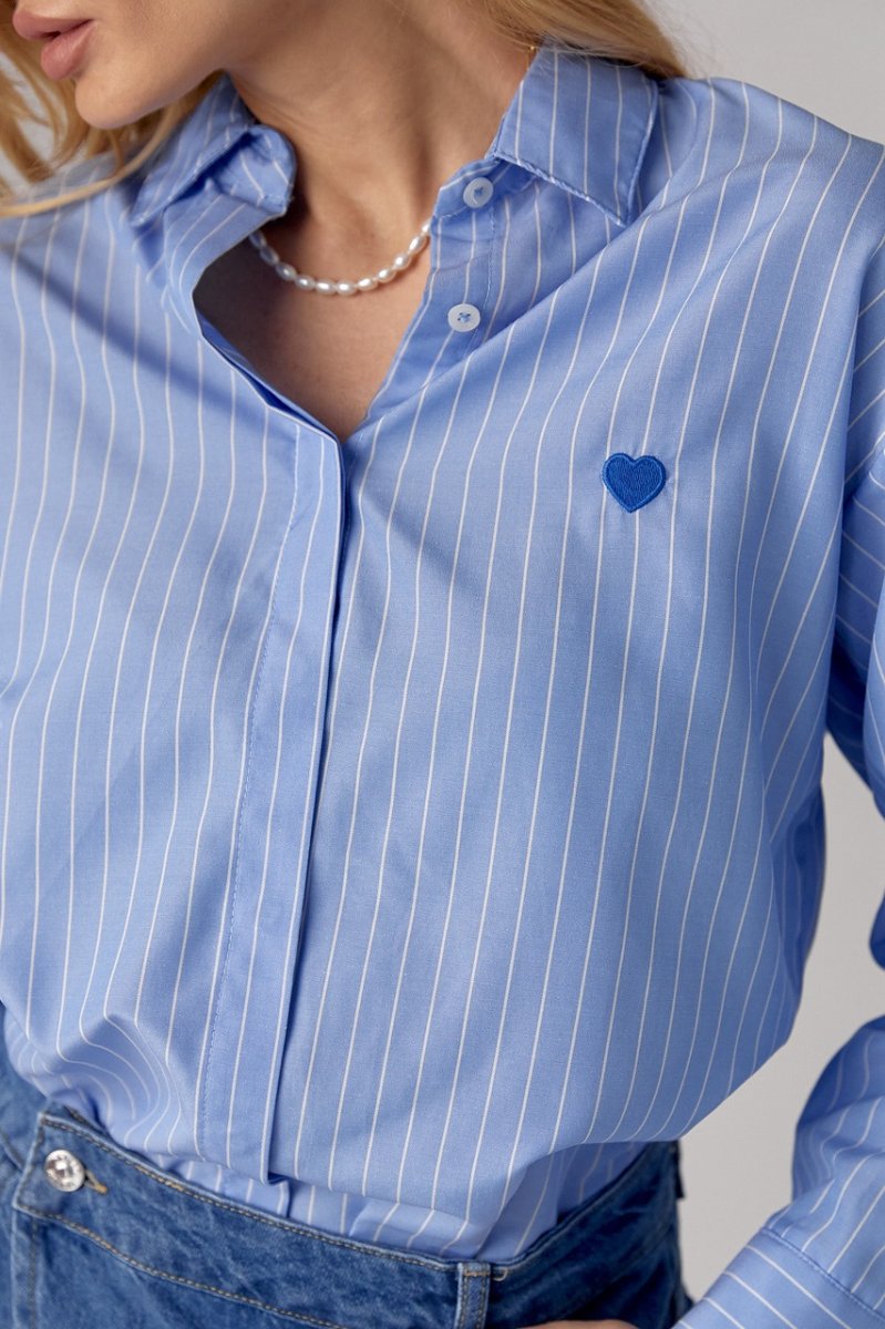 В этой модели круглая горловина идет с отложным воротником на короткой стойке. Низ полукруглый, проймы опущены, длинные рукава обшиты манжетами, которые застегиваются на две пуговички. Сама рубаха спереди застегивается полностью на пуговицы. Милым акцентом этой модели служит маленькое вышитое сердце, которое размещена с левой стороны.