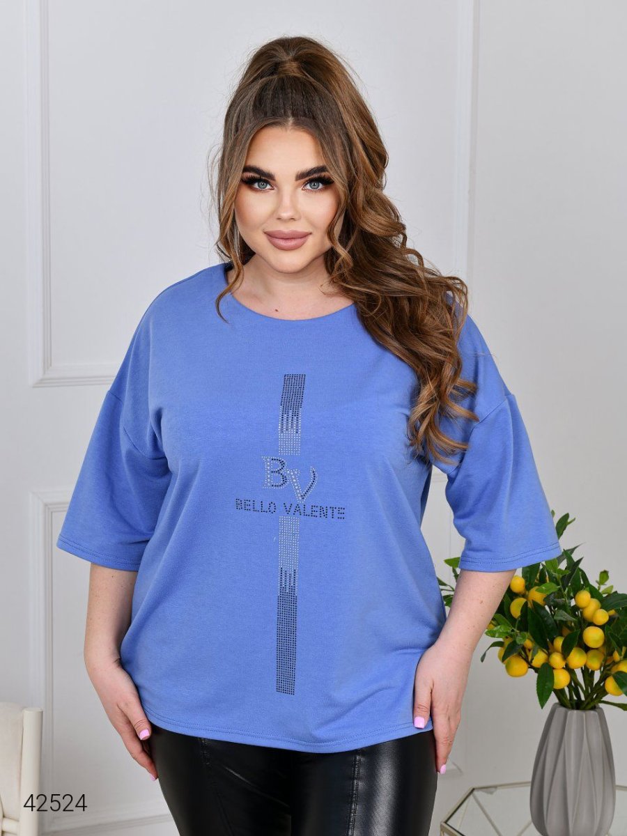 Женская туника больших размеров. Силуэт туники прямой, свободный. Вырез горловины круглый. Линия плеча спущена, рукав длиной до локтя. По бокам небольшие разрезы. Туника декорирована аппликацией из страз.