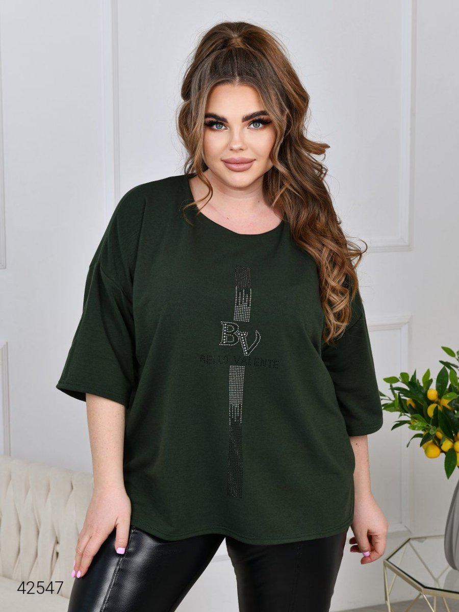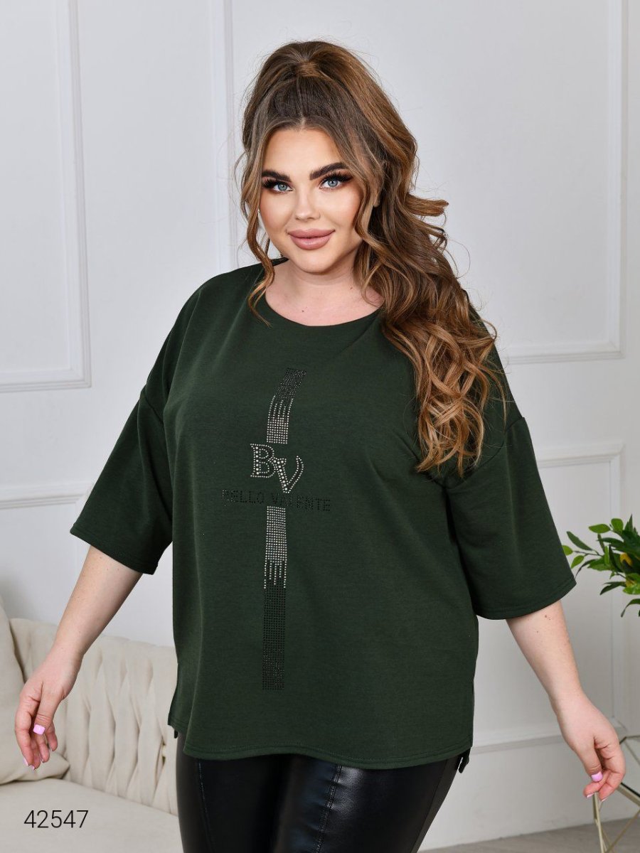 Женская туника больших размеров. Силуэт туники прямой, свободный. Вырез горловины круглый. Линия плеча спущена, рукав длиной до локтя. По бокам небольшие разрезы. Туника декорирована аппликацией из страз.