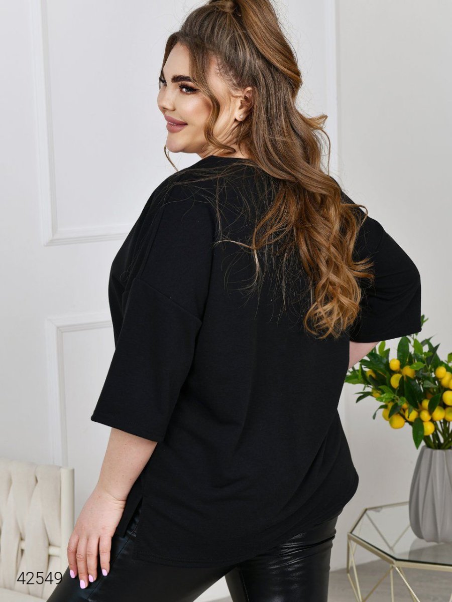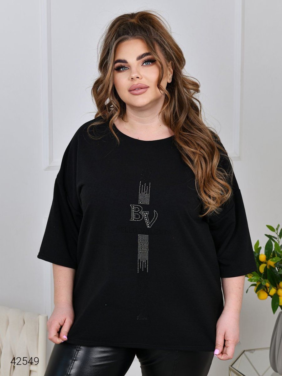 Женская туника больших размеров. Силуэт туники прямой, свободный. Вырез горловины круглый. Линия плеча спущена, рукав длиной до локтя. По бокам небольшие разрезы. Туника декорирована аппликацией из страз.