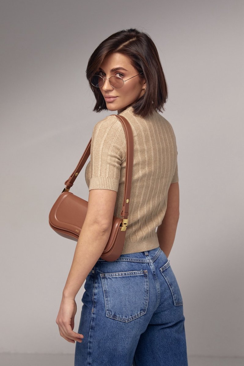 Модель полностью выполнена из машинной вязки в рубчик, который к низу изделия и рукавов переходит в узкий рубчик.