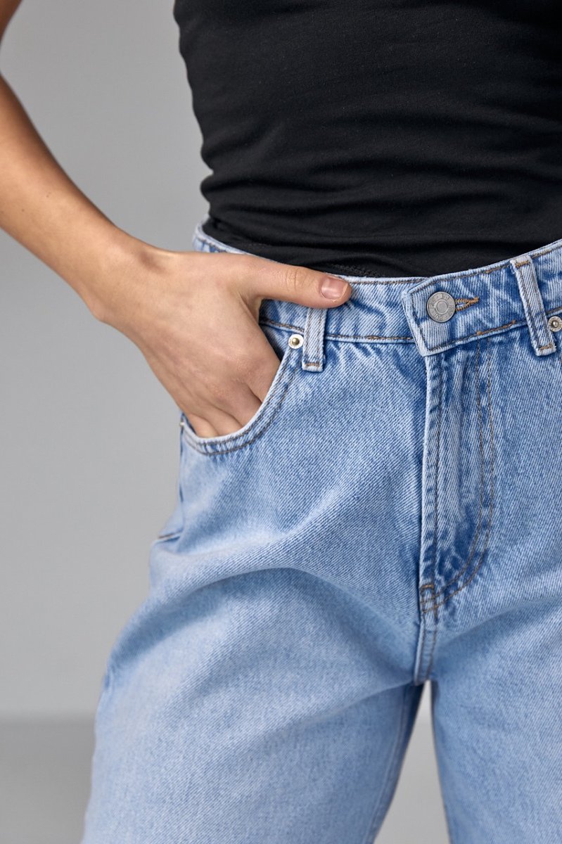 Изготовленные из прочного денима, они сохранят свою форму и цвет даже после многочисленных стирок. Пояс — отрезной со шлевками. Спереди расположены боковые карманы, сзади — накладные. Застежка — центральная на пуговицу и замок. На задних половинках брюк расположена кокетка для хорошей посадки штанов в области талии и бедер. Боковые швы в джинсах немного сунуты на перед. По низу расположены рваные элементы.