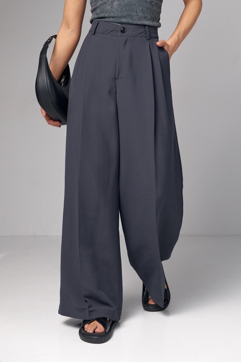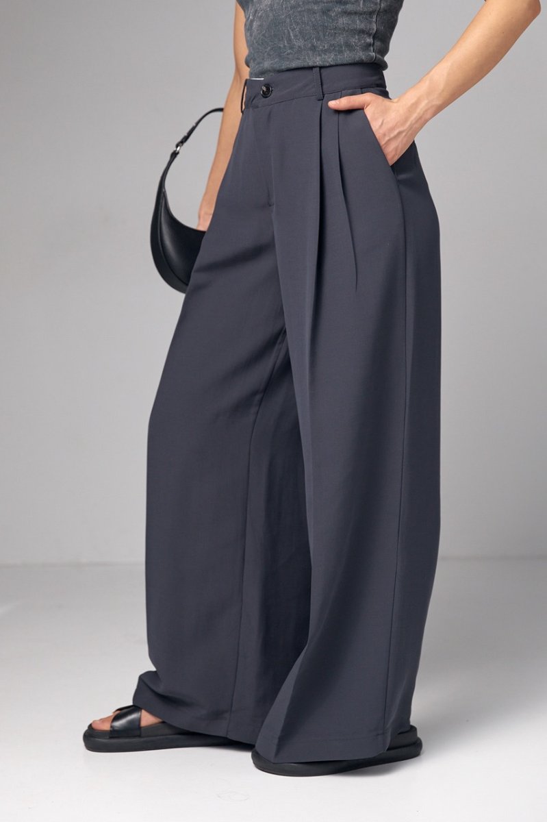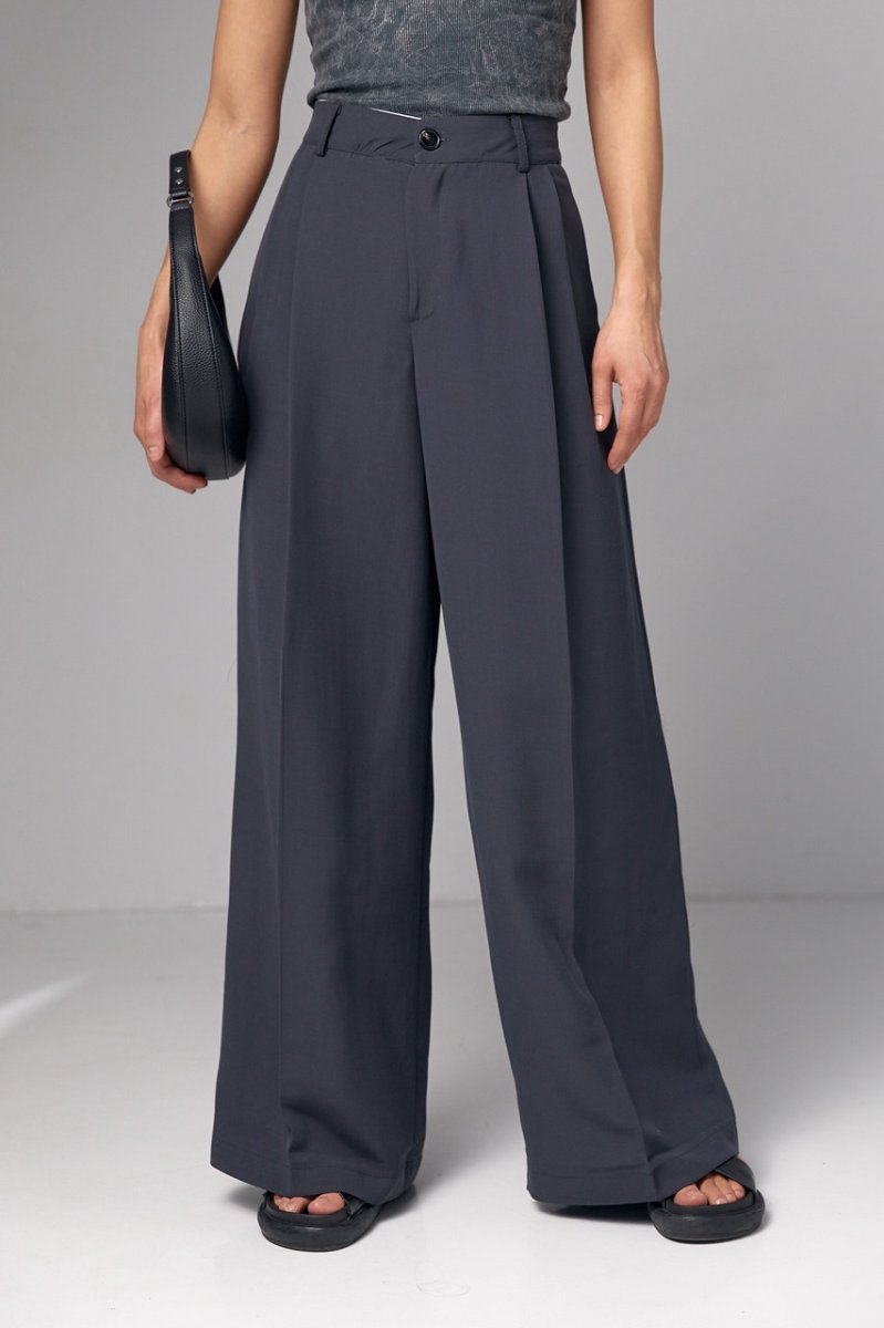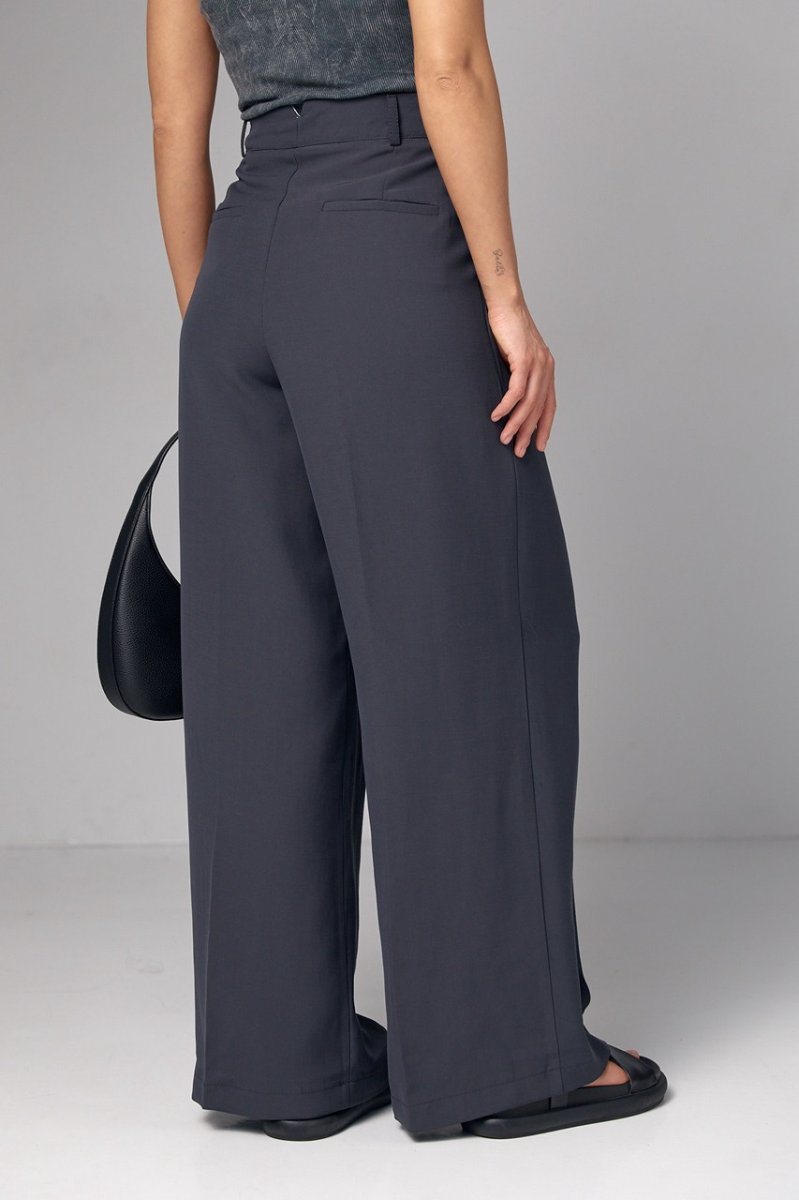 Эта модель сшита из легкой костюмной ткани со стрелками спереди и сзади, которые делают ноги еще стройнее. Края низа в изделии прямые. Сзади от пояса опускаются вертикальные вытачки, а спереди расположены защипы и карманы. Застегиваются брюки спереди на пуговицу и молнию.