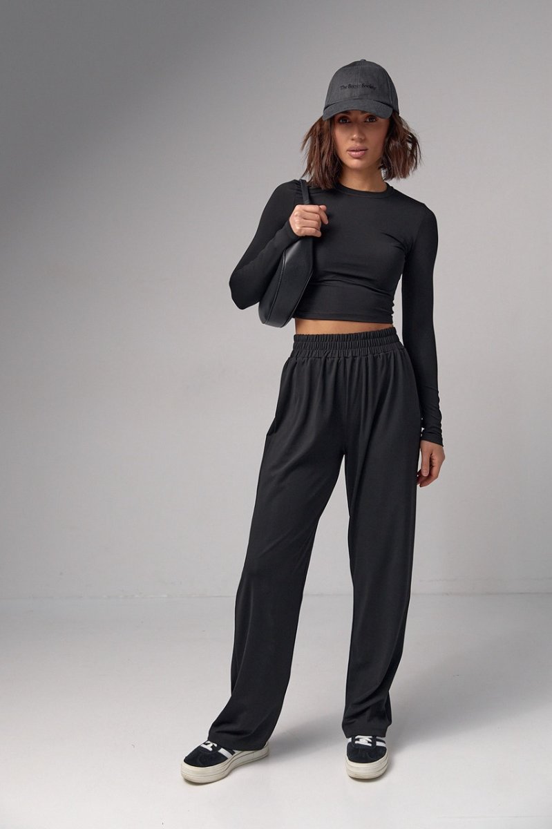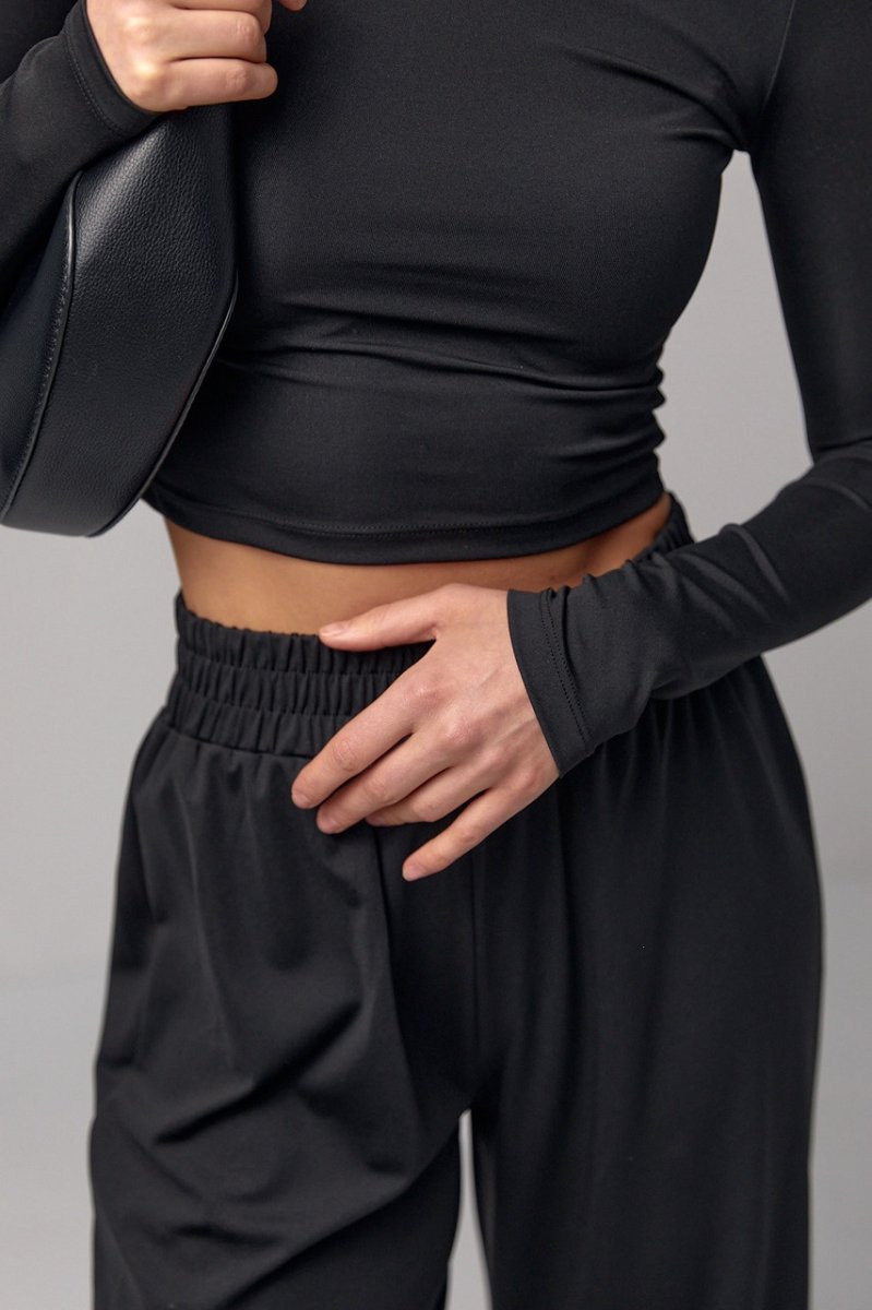 Комплект сшит из качественной эластичной ткани. В штанах низ прямой, а вверху вшита широкая резинка. В укороченной кофточке рукава длинные, края низа прямые, а круглая горловина обшита бейкой в тон.