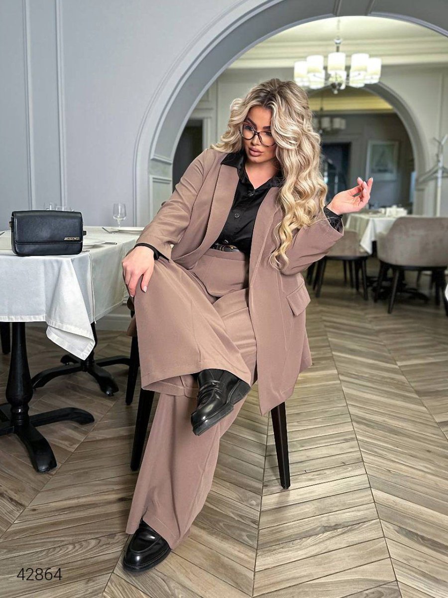Женский брючный костюм с пиджаком. Брюки сзади на резинке, пиджак без застежек.