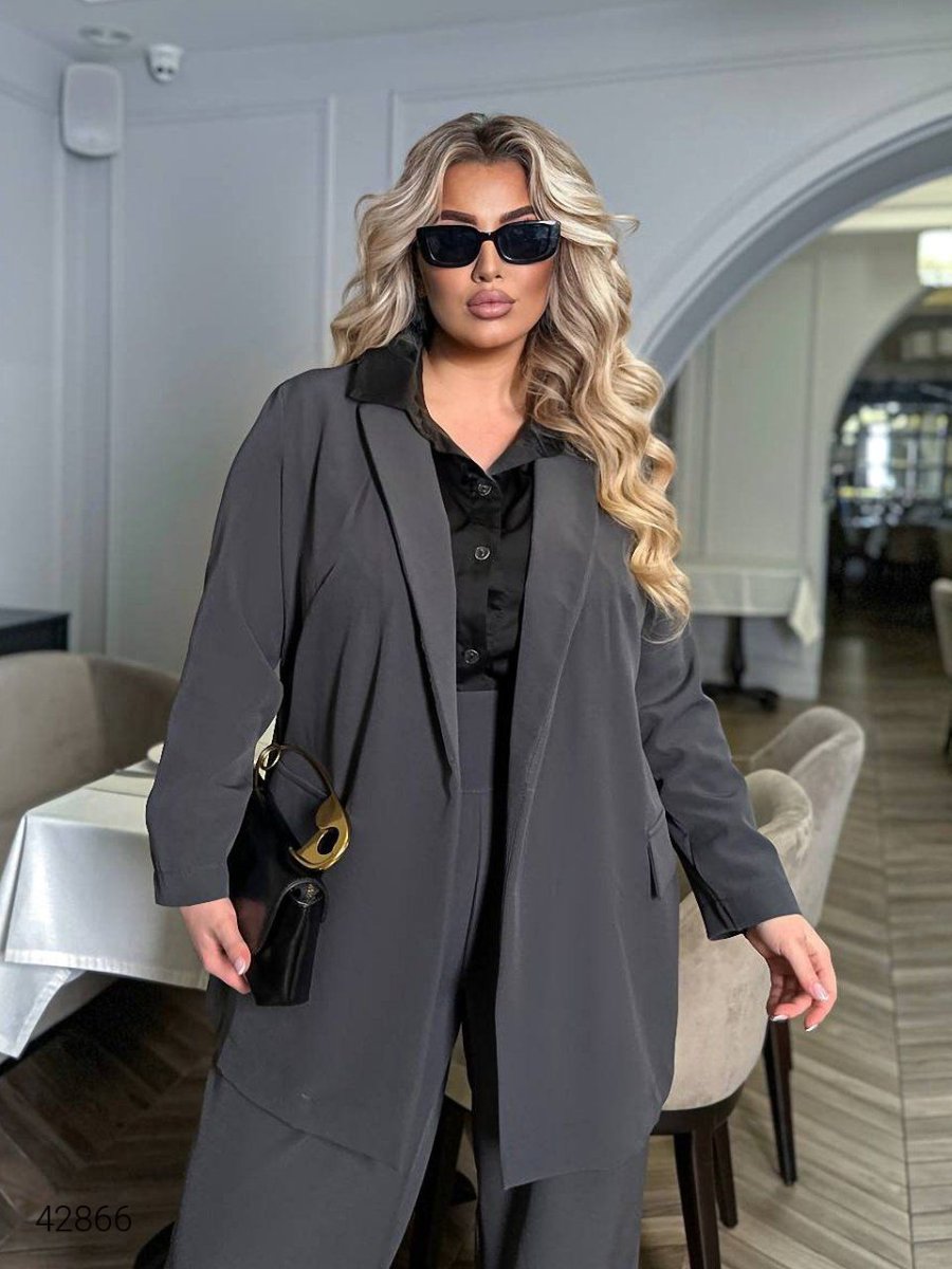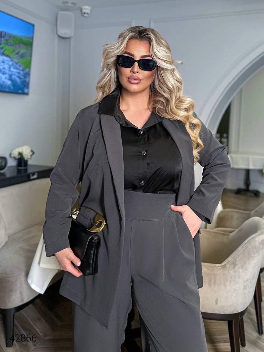Женский брючный костюм с пиджаком. Брюки сзади на резинке, пиджак без застежек.
