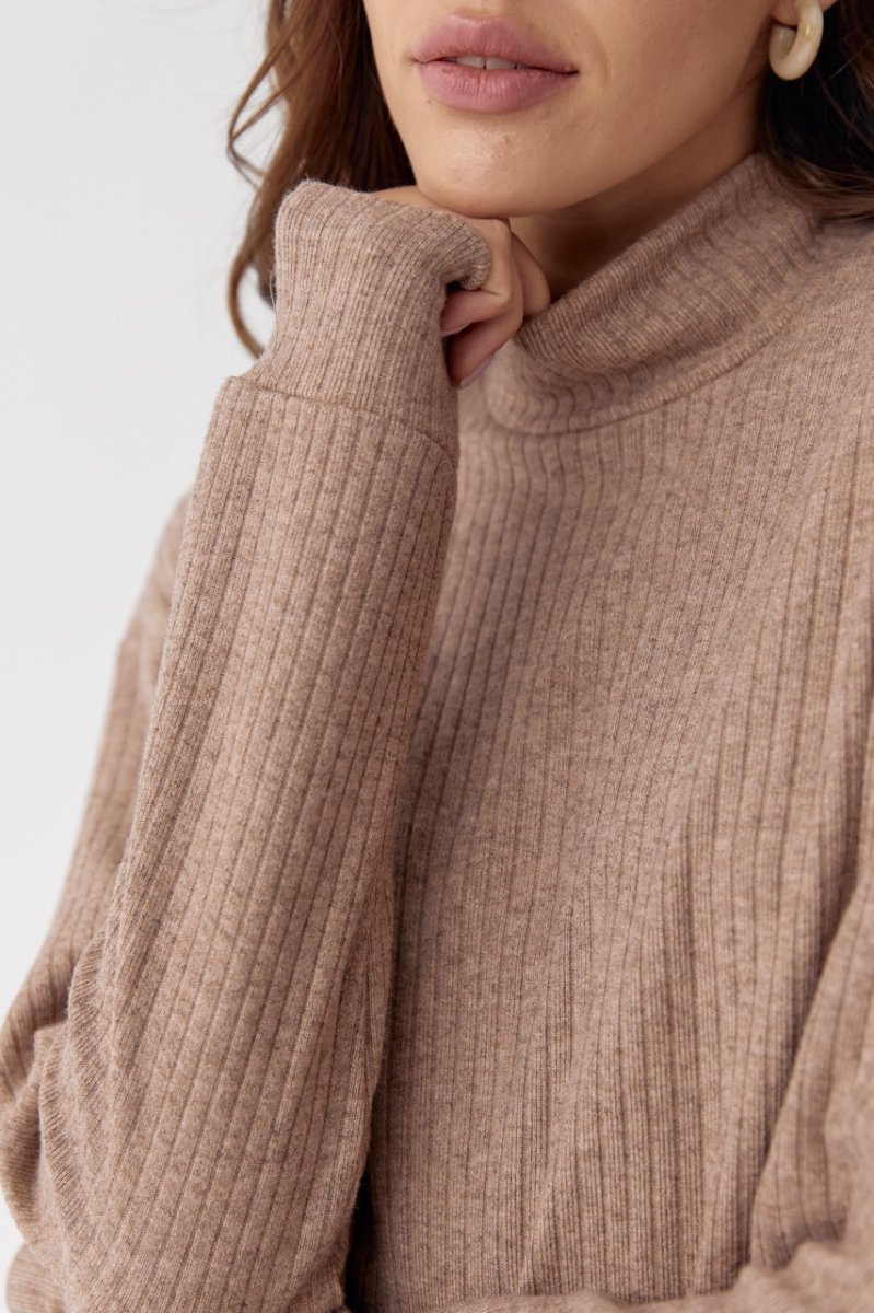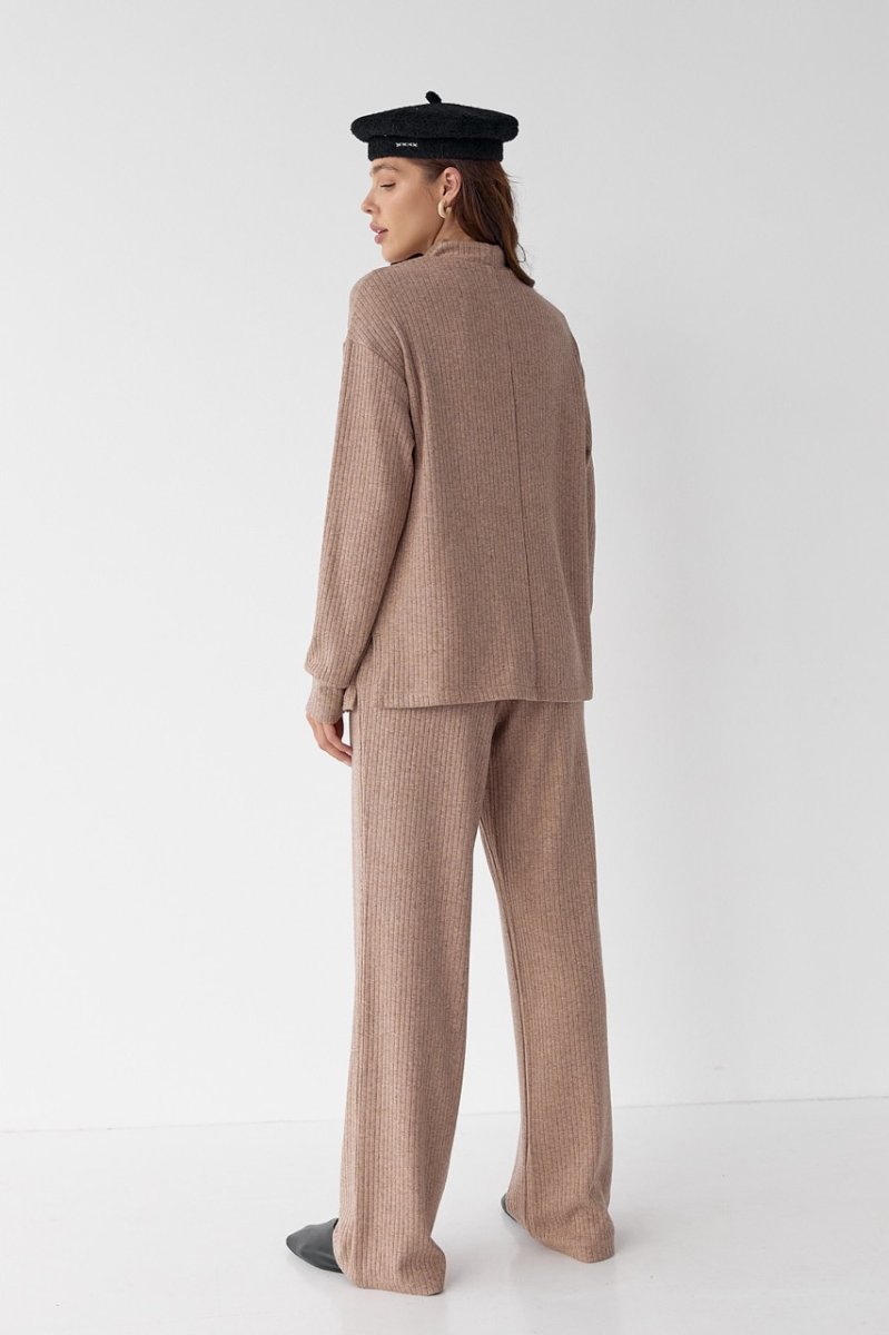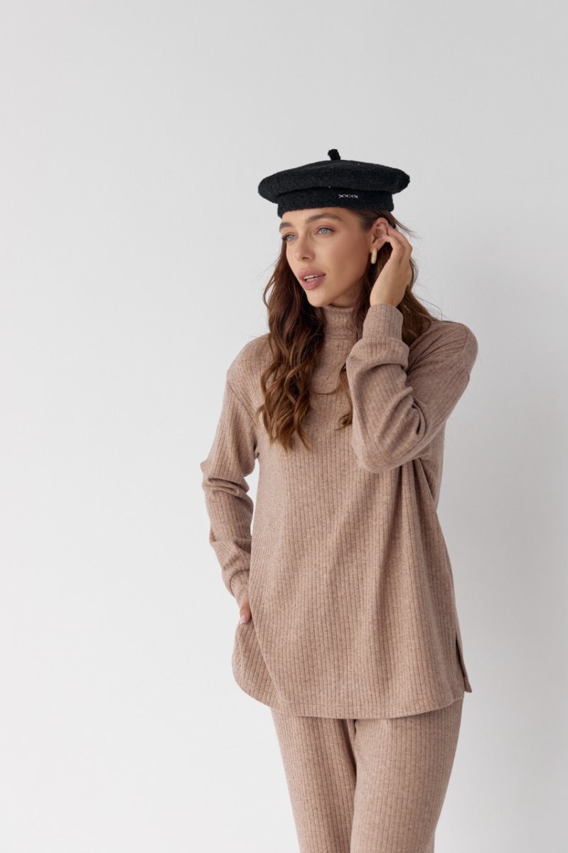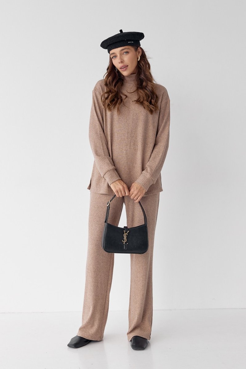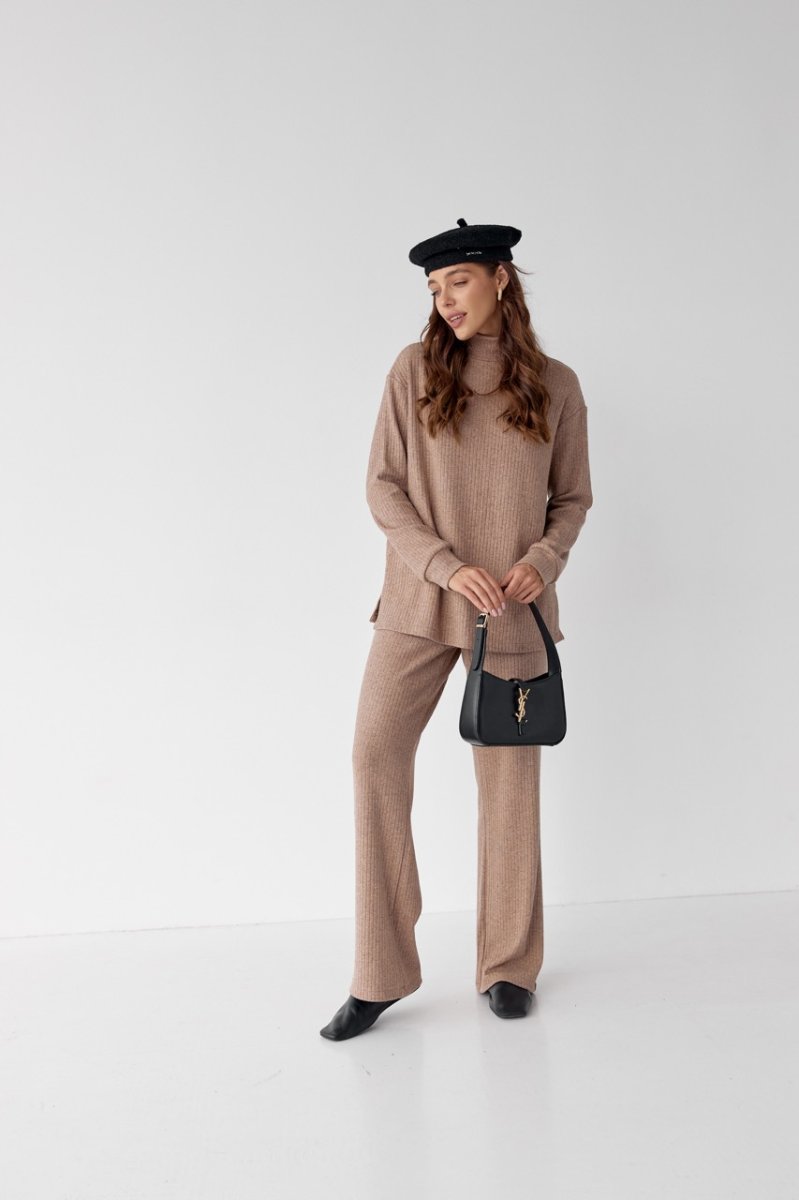 Женский костюм прямые брюки и свитер. Свитер длиной до линии бедер, по низу распорки. Уровень плеча приспущен, рукава втачные, длинные, по низу манжеты. Спинка со средним швом. Вырез горловины круглый, воротник стойка. По низу свитера проложена строчка. Брюки прямые, длинные, на талии пояс с резинкой. Карманы с отрезным бочком. По низу штанишек и на поясе проложены строчки.