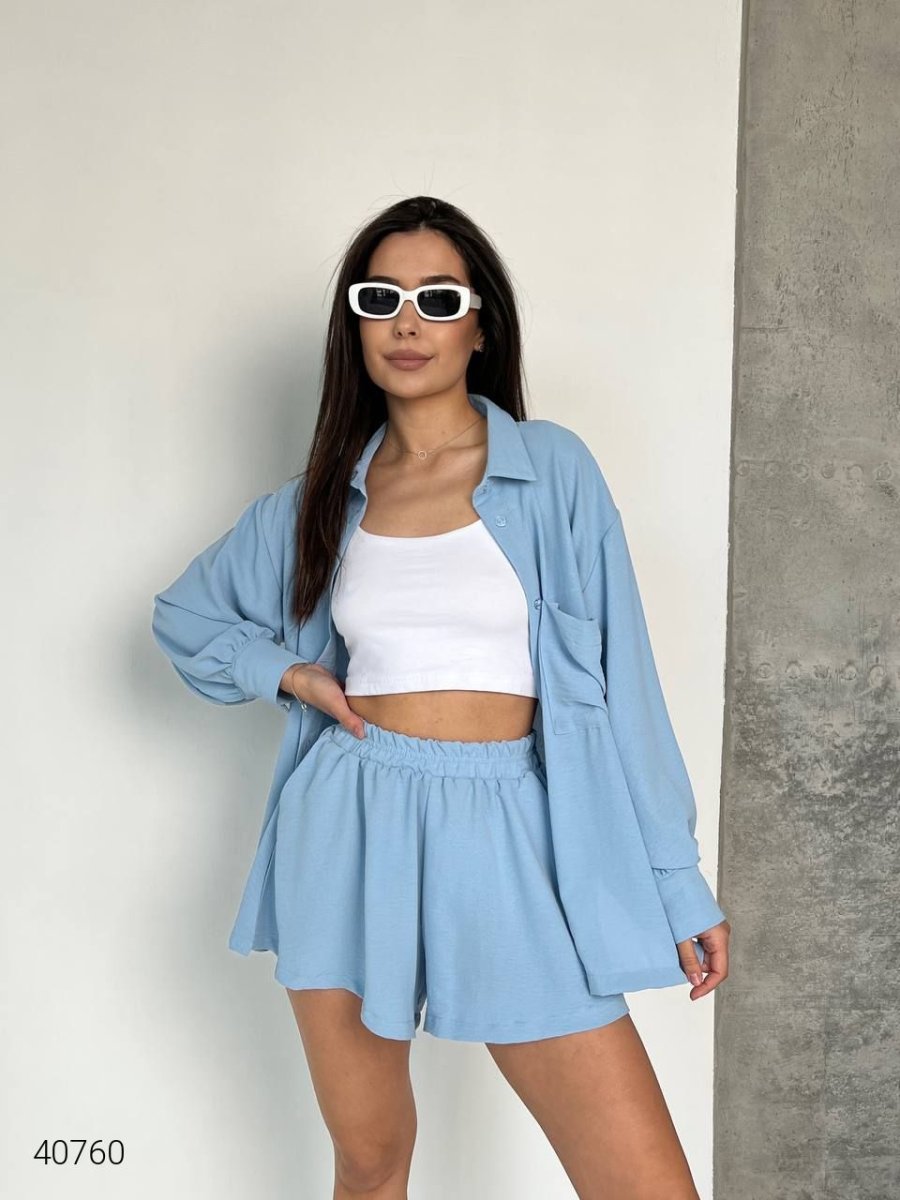 Женский костюм двойка с шортами. Асимметричная рубашка с разрезами по бокам, объемными рукавами и широкими манжетами. Шорты-юбочка солнце клеш. Свободный крой. Ткань: американский ролекс жатка. Легкая и дышащяя.
