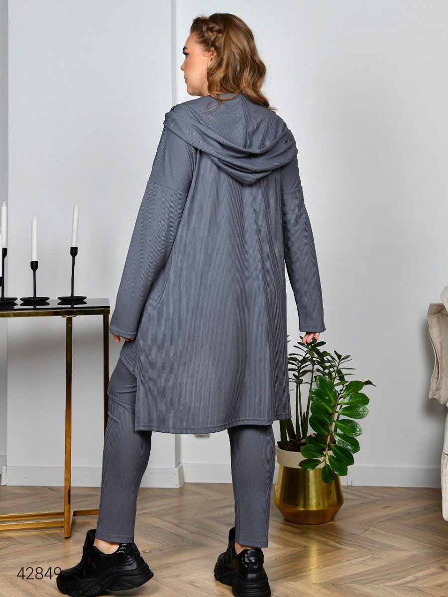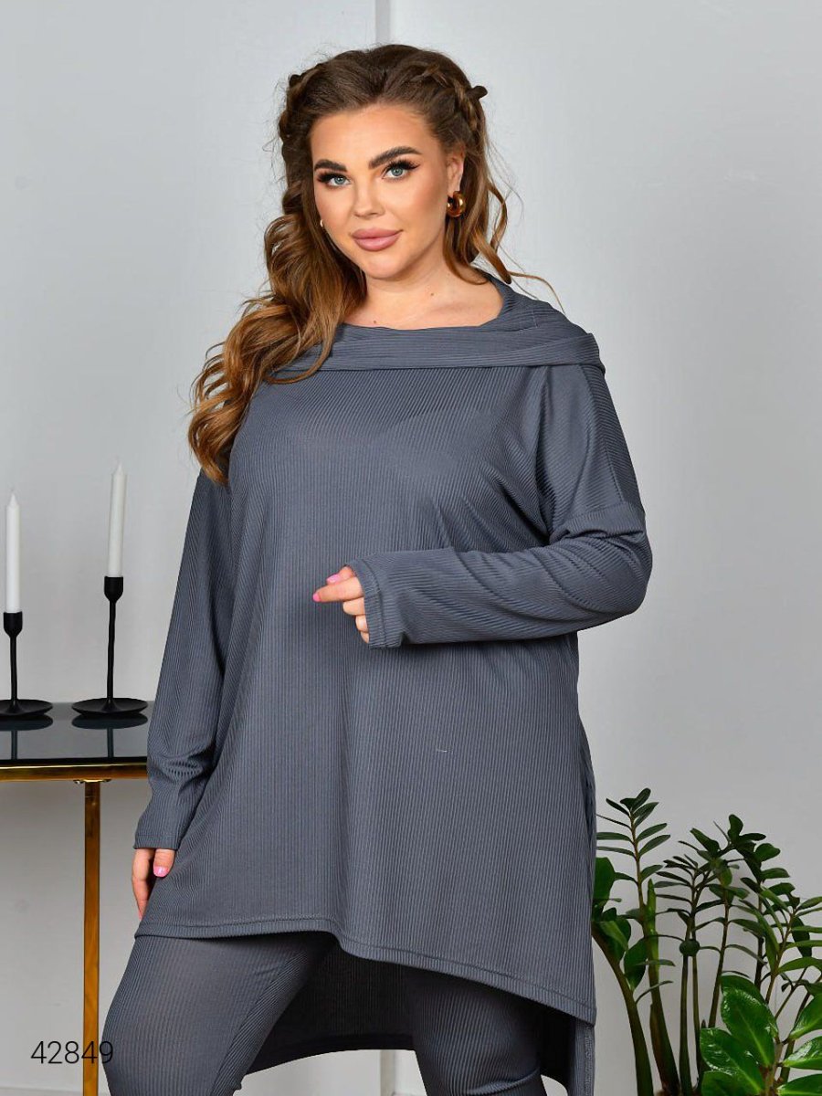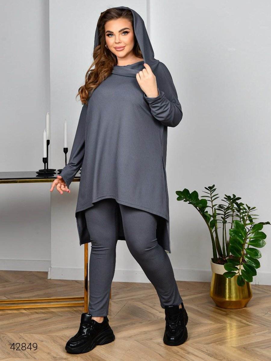 Женский костюм с туникой и лосинами. Туника и лосины из качественного трикотажа рубчик (растяжимость хорошая, не лохматится). Туника прямого удлиненного силуэта с асимметричным низом (впереди короче, сзади длиннее). Украшена оригинальным воротником, переходящим в капюшон. Линия плеча спущена, рукав длинный. В боковых швах обработаны карманы. Лосины с посадкой выше средней по талии собраны на резинку. Карманов нет.