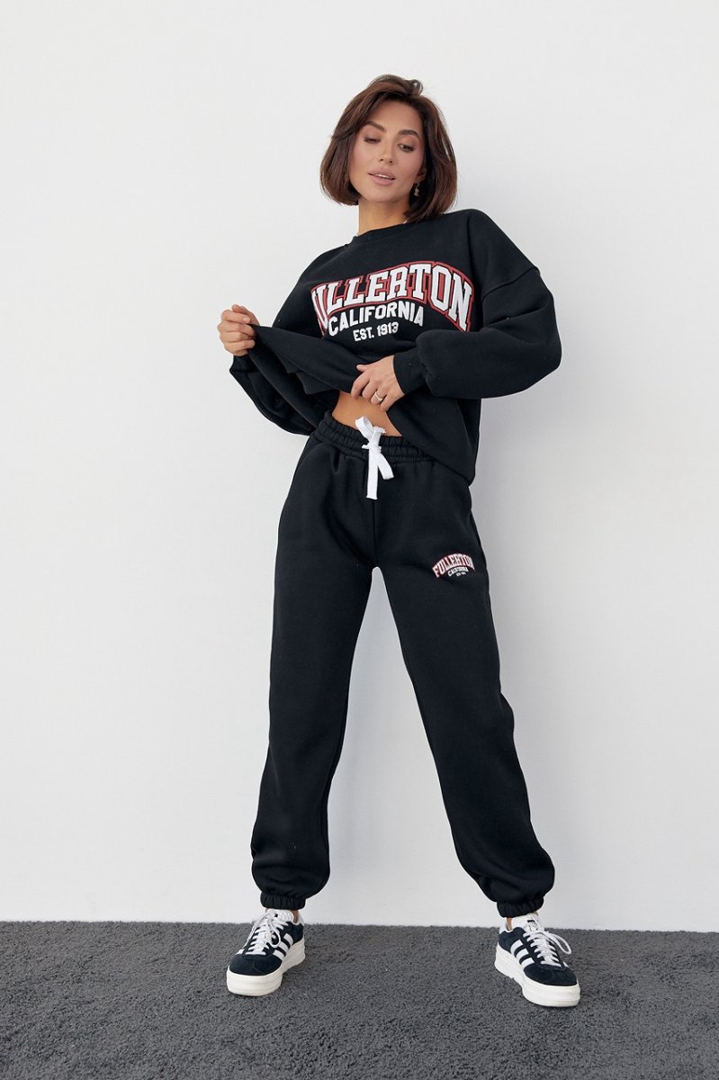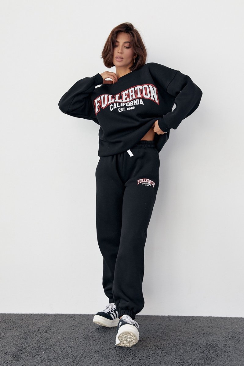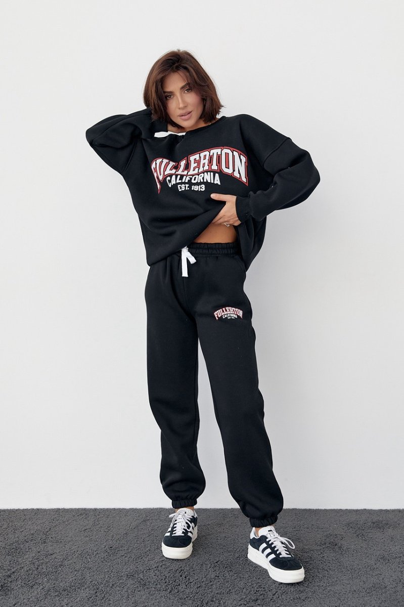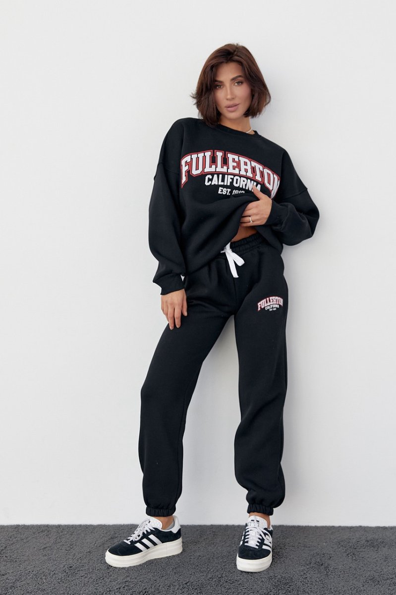 В комплекте штанишки идут с широкой резинкой на поясе, а внизу с манжетами на резинке. Спереди под одним из прорезных карманов расположен небольшой принт с надписью Fullerton California. Для большего комфорта штаны дополнительно завязываются в поясе на шнурок. В свитшоте круглая горловина обшита окантовкой, пройма слегка опущена, прямой низ и длинные рукава заканчиваются манжетами. Спереди на кофте нанесен такой же принт, как и на штанах.