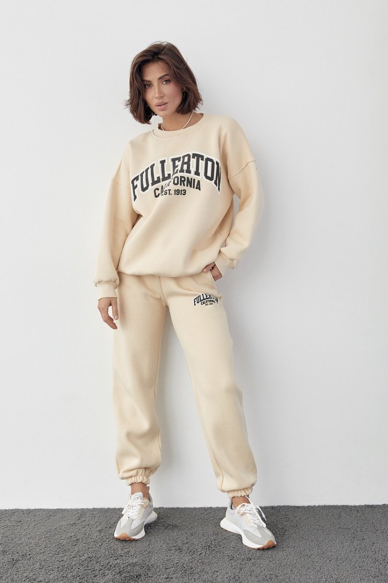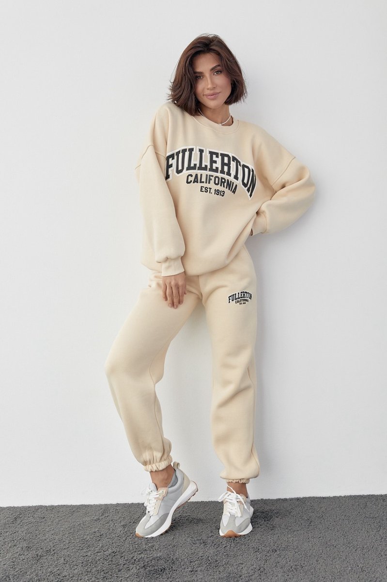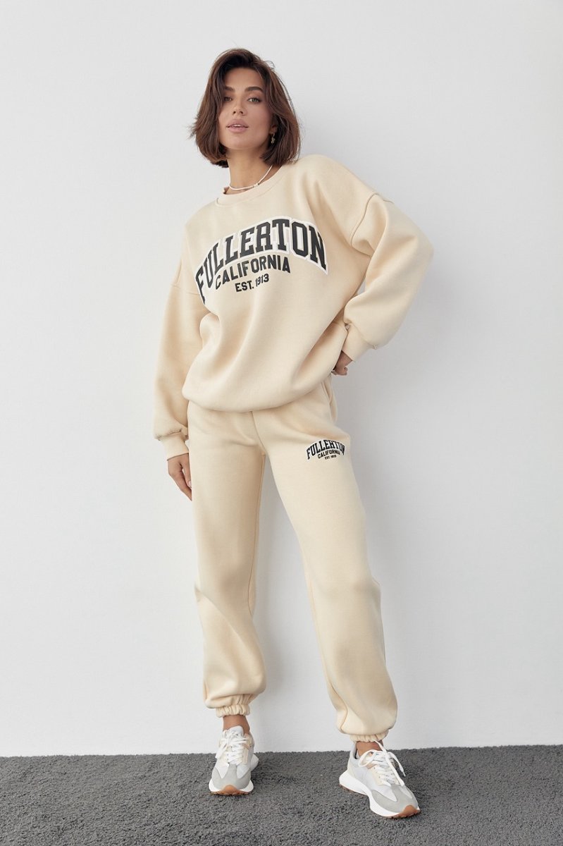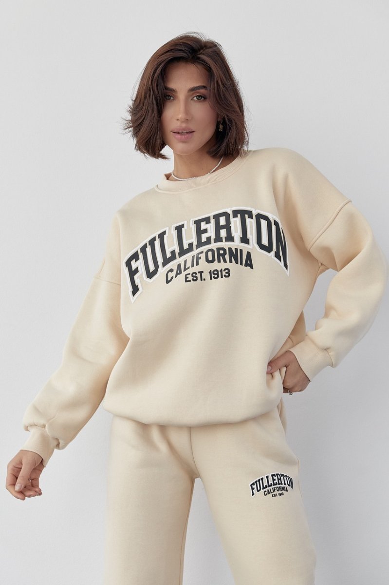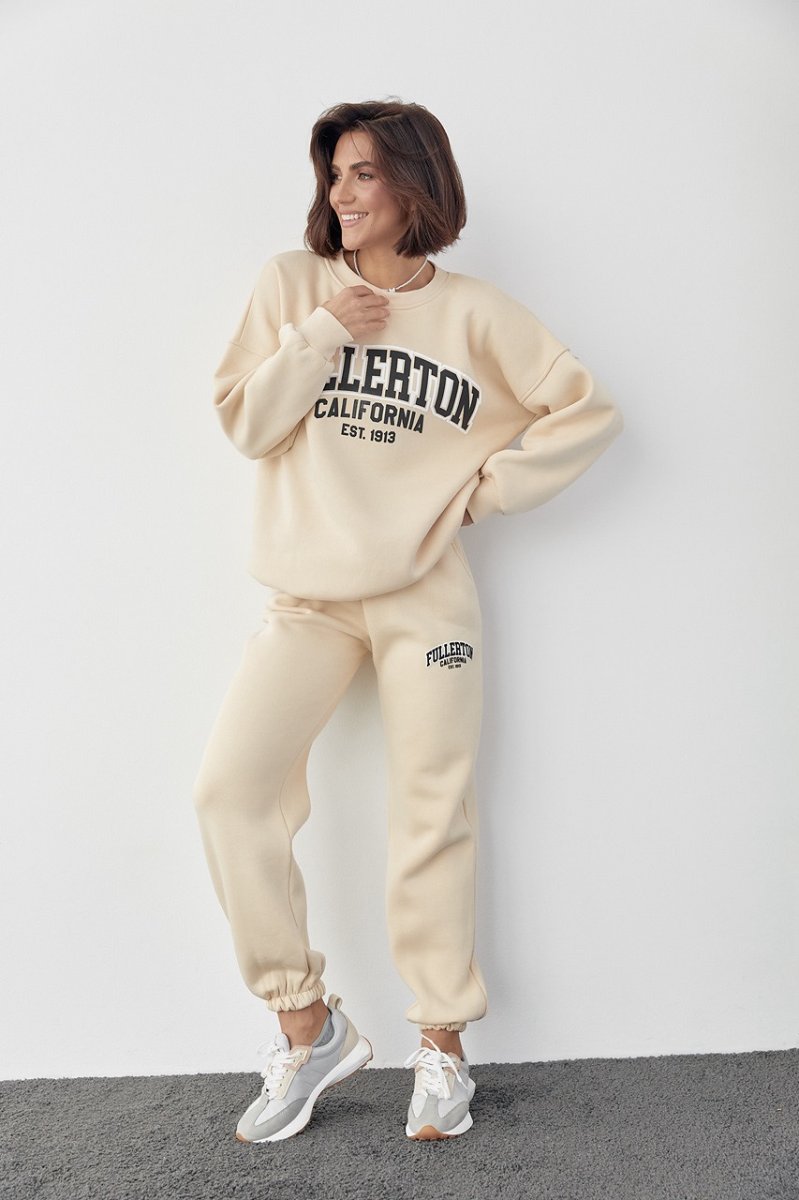 В комплекте штанишки идут с широкой резинкой на поясе, а внизу с манжетами на резинке. Спереди под одним из прорезных карманов расположен небольшой принт с надписью Fullerton California. Для большего комфорта штаны дополнительно завязываются в поясе на шнурок. В свитшоте круглая горловина обшита окантовкой, пройма слегка опущена, прямой низ и длинные рукава заканчиваются манжетами. Спереди на кофте нанесен такой же принт, как и на штанах.