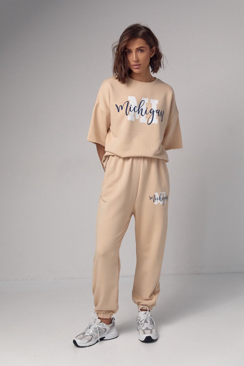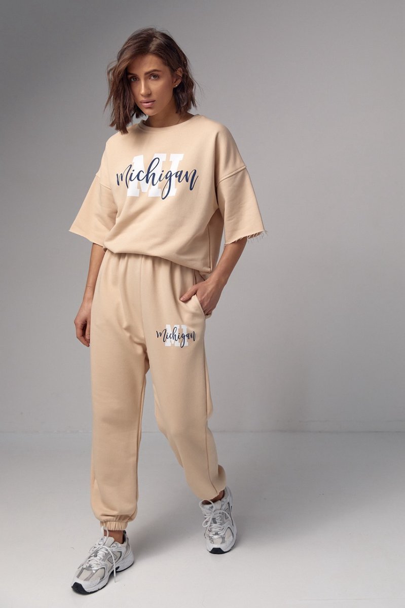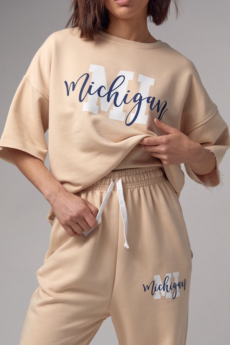 Модель состоит из удлиненной футболки и свободных джоггеров. Края рукавов и низ футболки не обработаны, что добавляет этому ансамблю непринужденности и неповторимости. Спереди на футболке нанесена надпись "Michigan", придавая ей изюминку и индивидуальность.