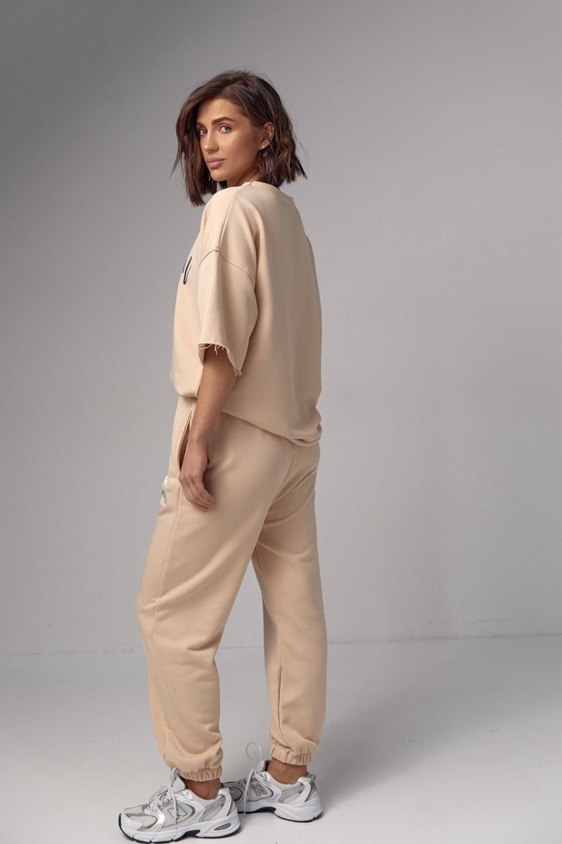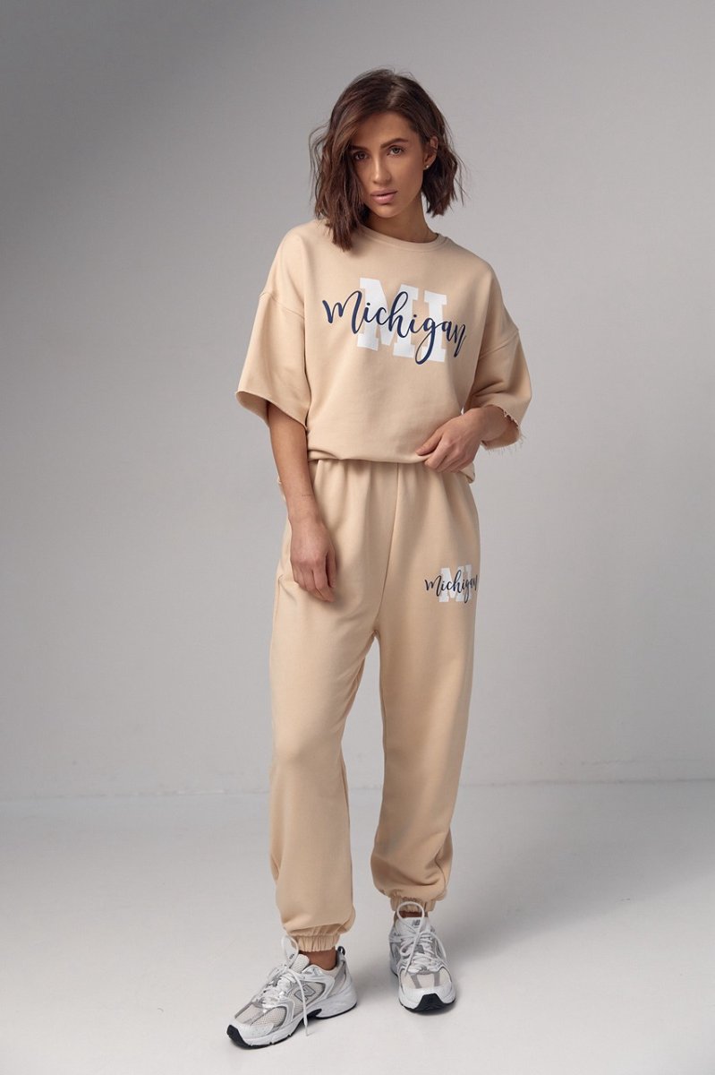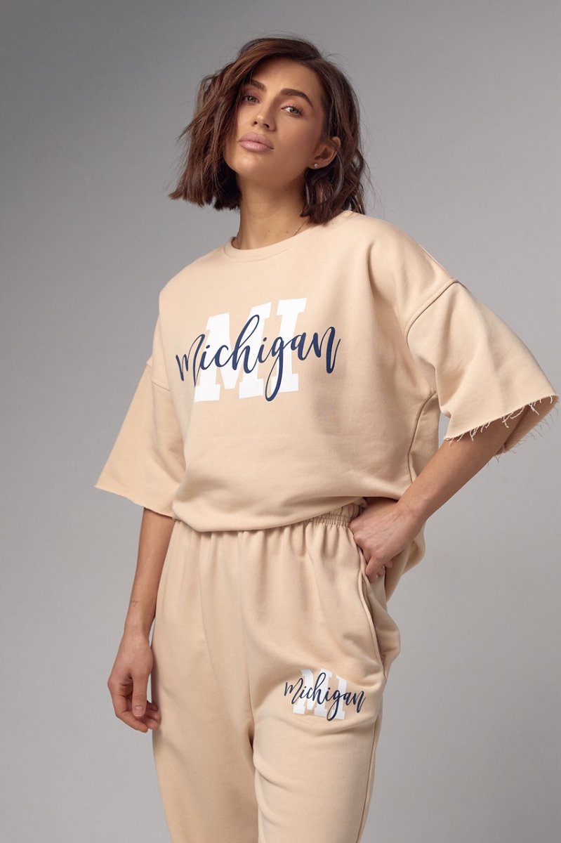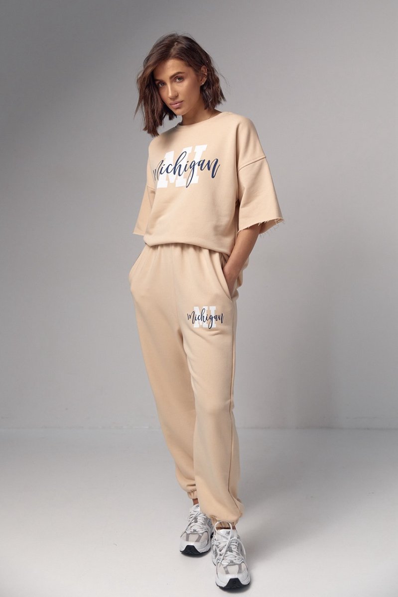 Модель состоит из удлиненной футболки и свободных джоггеров. Края рукавов и низ футболки не обработаны, что добавляет этому ансамблю непринужденности и неповторимости. Спереди на футболке нанесена надпись "Michigan", придавая ей изюминку и индивидуальность.