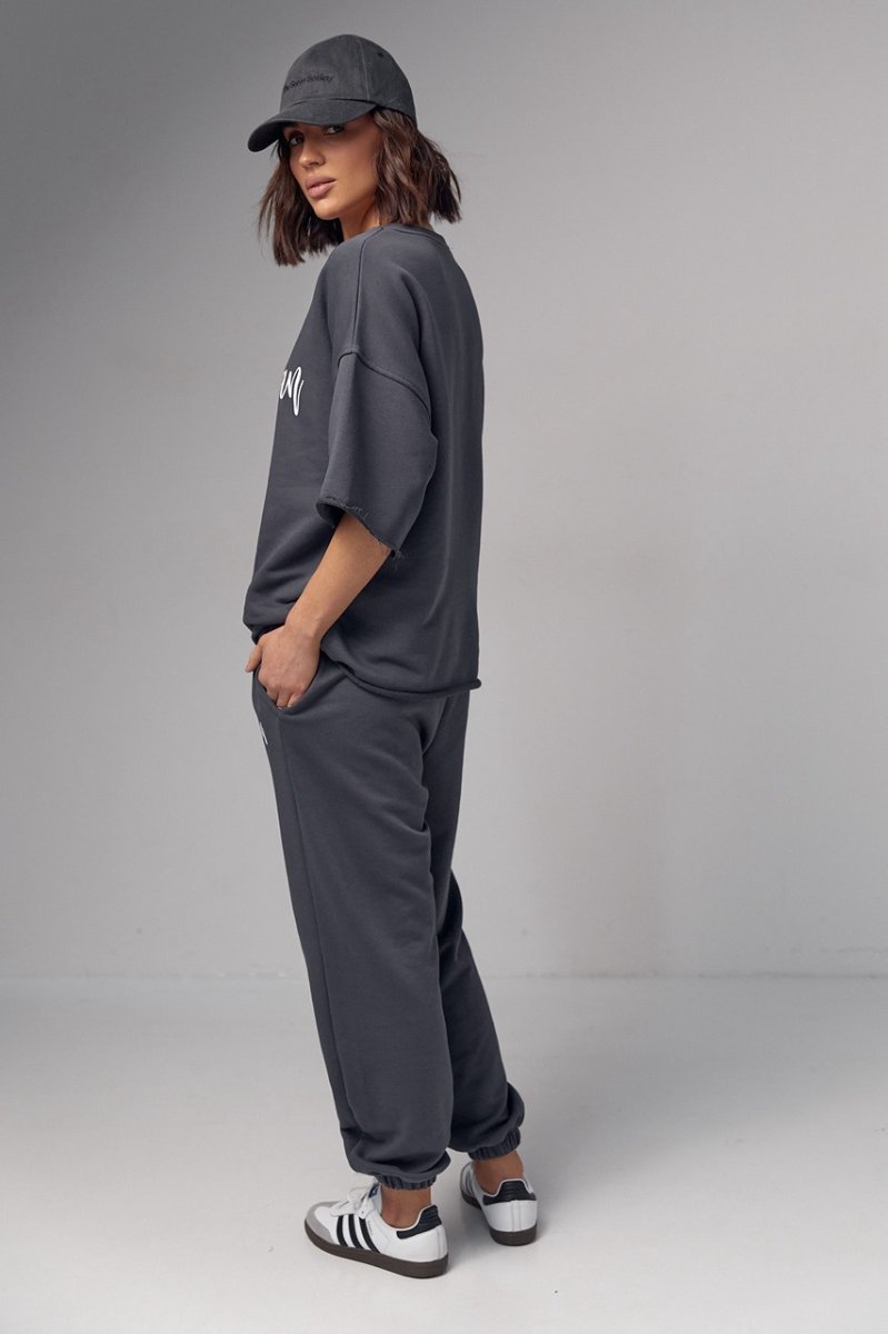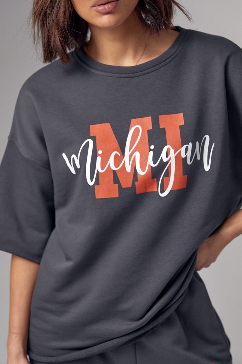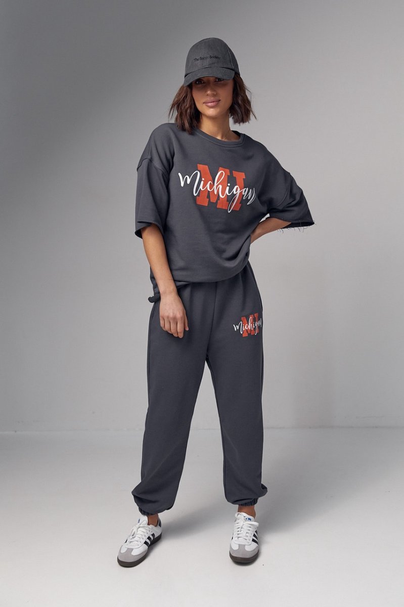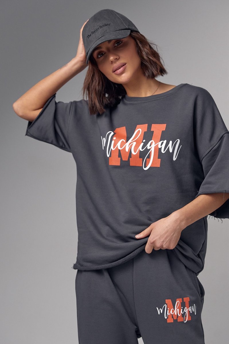 Модель состоит из удлиненной футболки и свободных джоггеров. Края рукавов и низ футболки не обработаны, что добавляет этому ансамблю непринужденности и неповторимости. Спереди на футболке нанесена надпись "Michigan", придавая ей изюминку и индивидуальность.