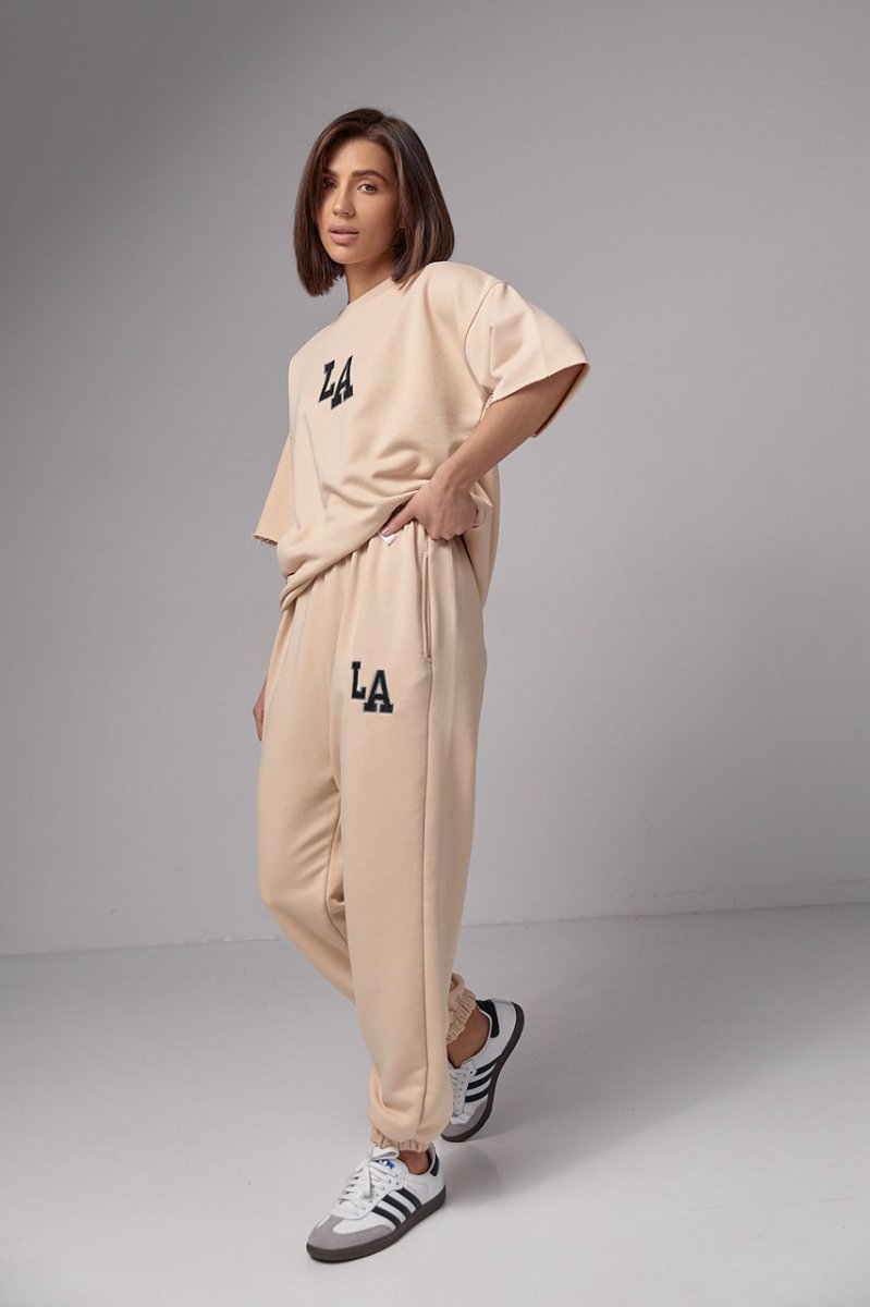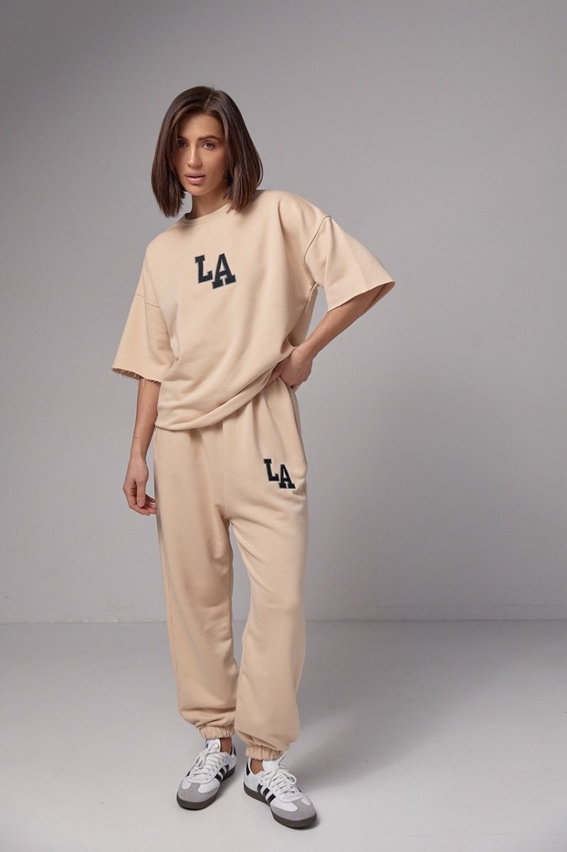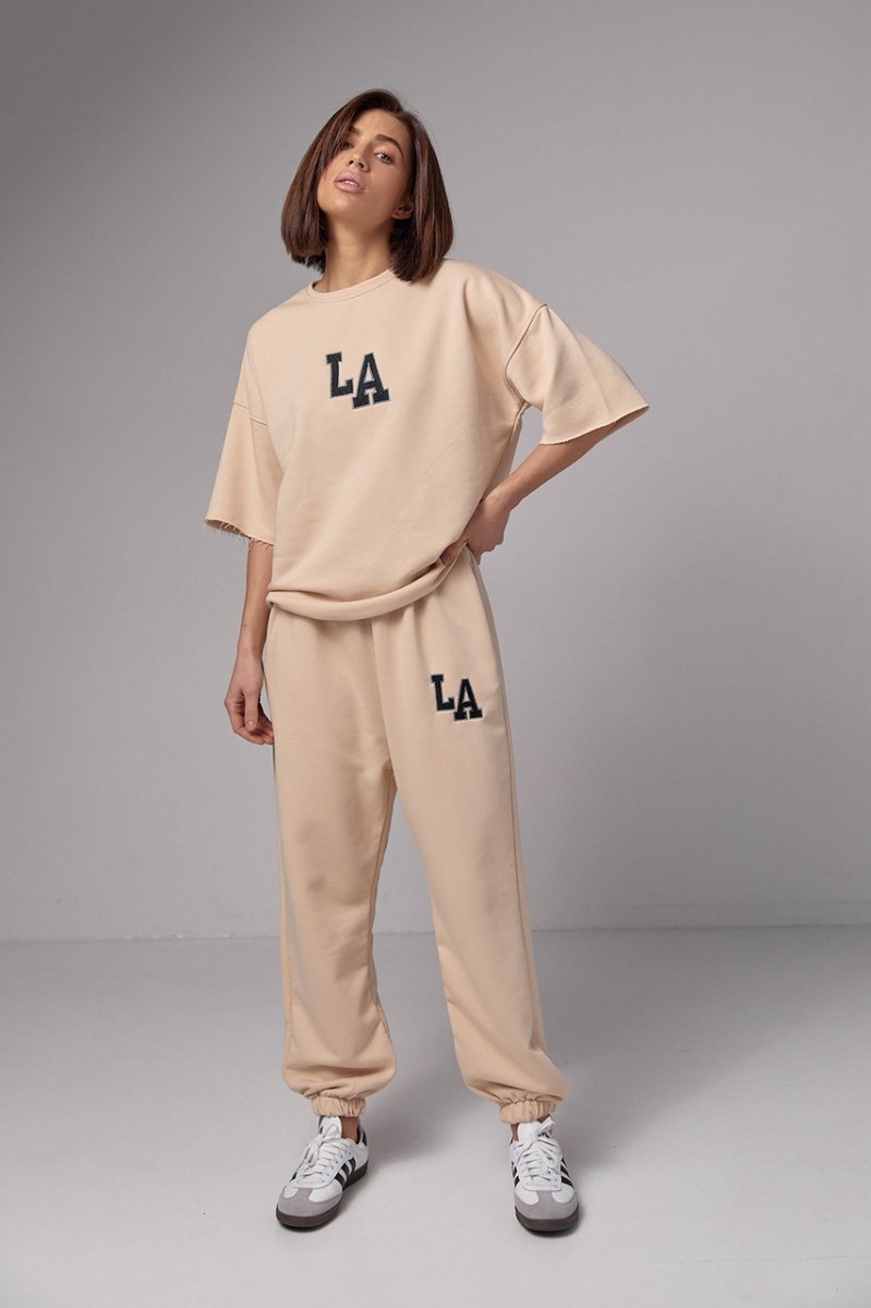 В этот комплект входит свободная футболка и спортивные штаны-джоггеры. В футболке прямой крой, рукава и низ имеют необработанный край. Круглая горловина дополнена окантовкой. Спереди расположен вышитая надпись LA. Штаны внизу и вверху собраны на широкую резинку. В боковых швах расположены удобные прорезные карманы. С левой стороны штаны украшает вышитая надпись аналогична той, что на футболке.